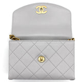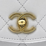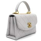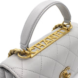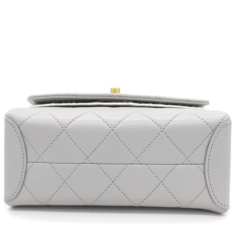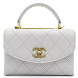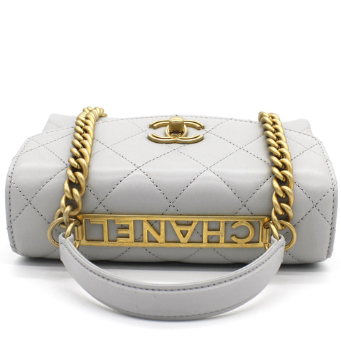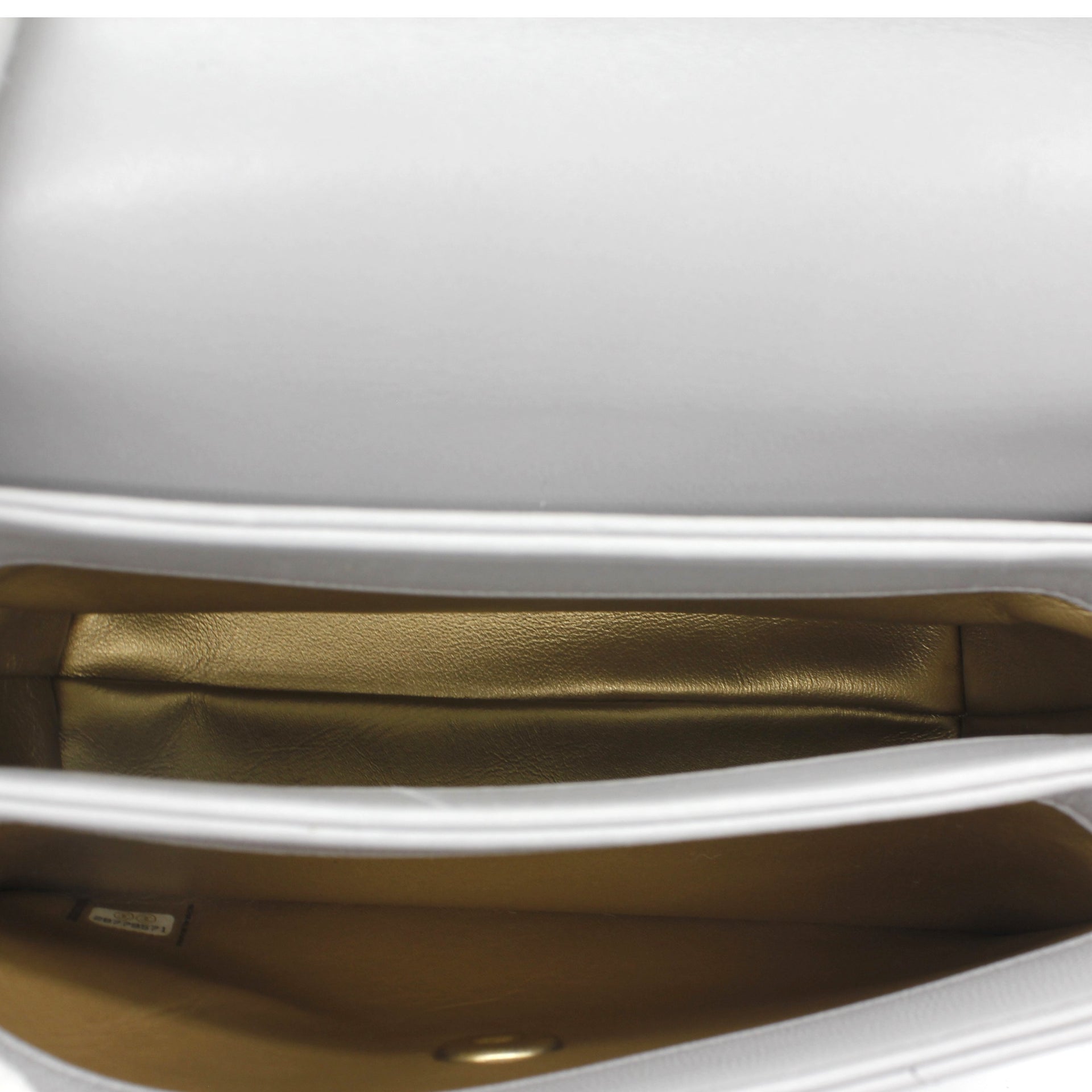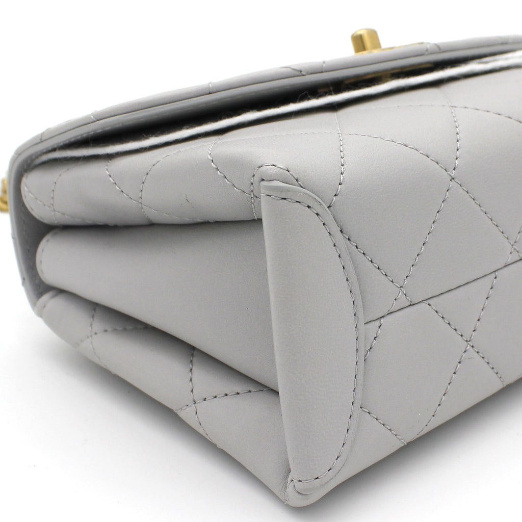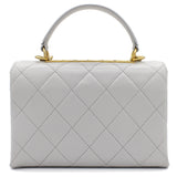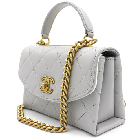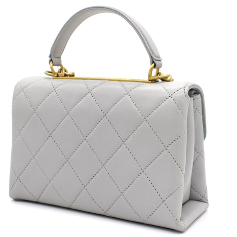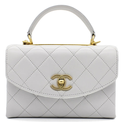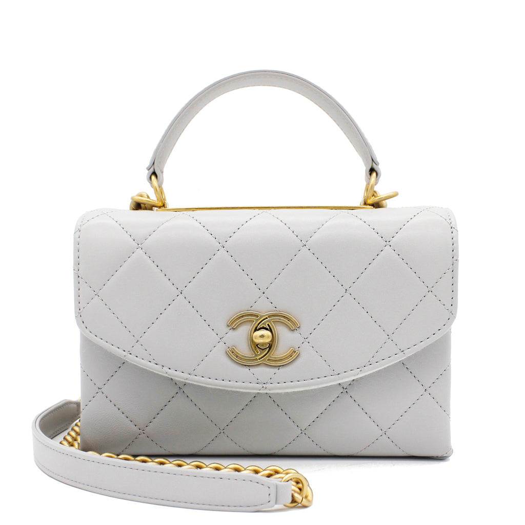 Exterior Material:   White grey quilted lambskin with top handle comes with gold-tone hardware, single flat top handle, single chain-link shoulder strap with shoulder guard, logo hardware embellishment at top.