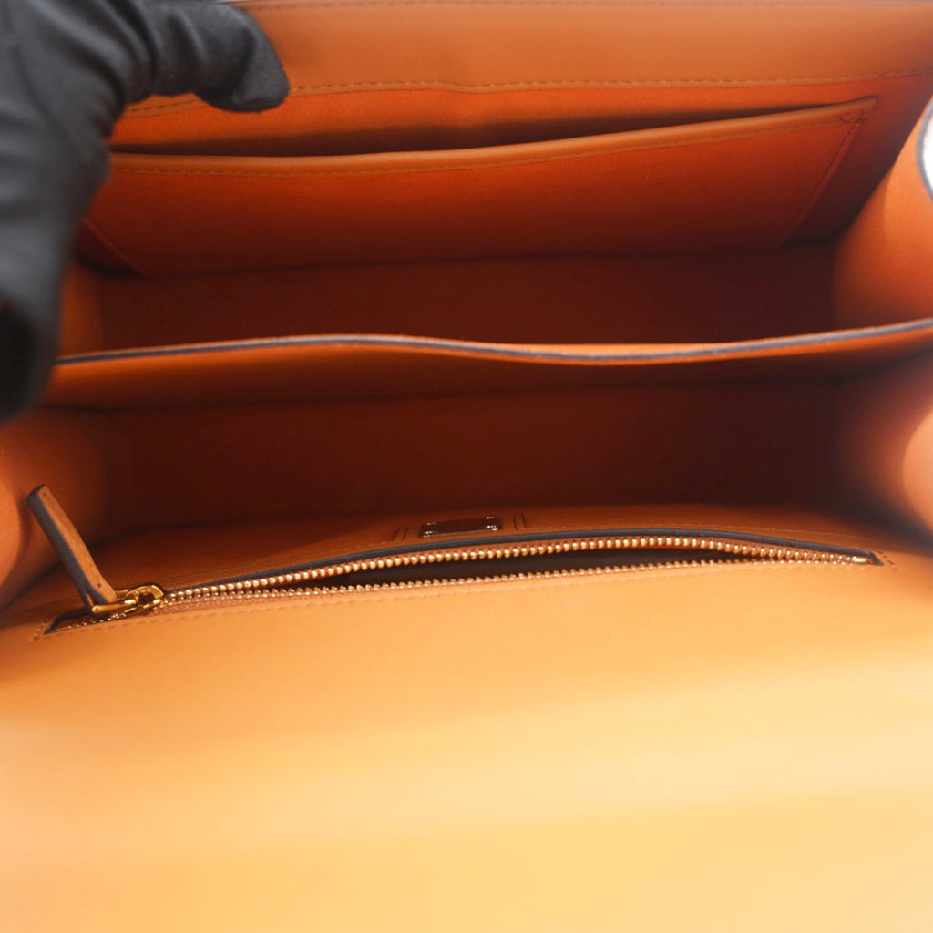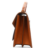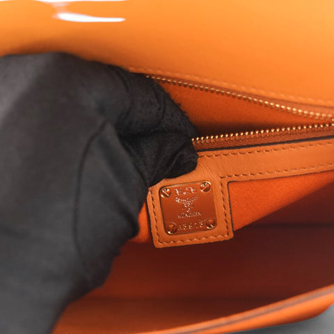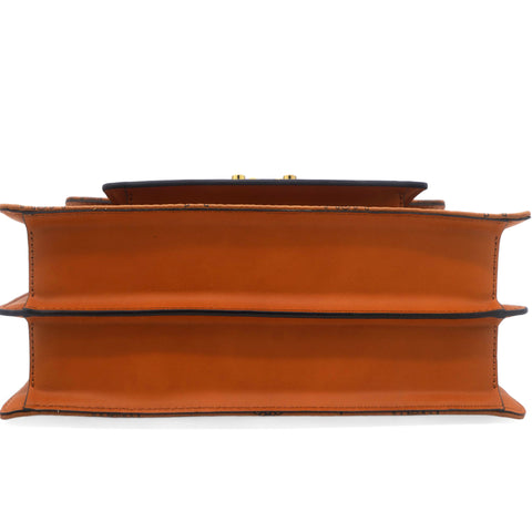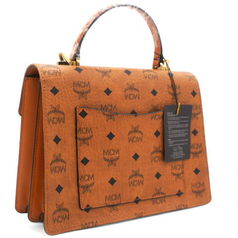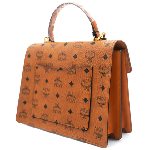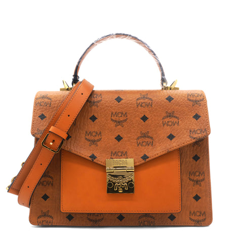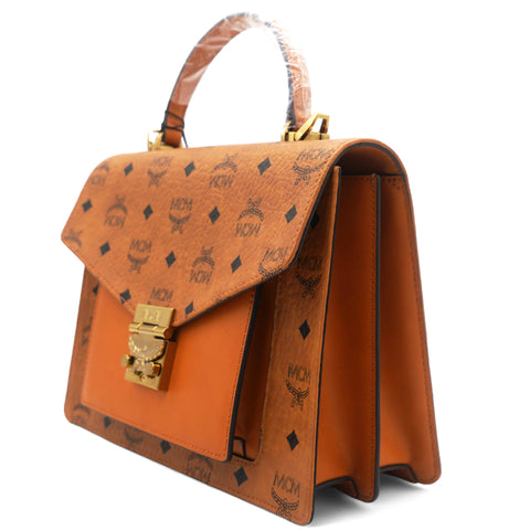 | This is an authentic MCM Visetos Medium Patricia Satchel in Cognac. This chic handbag is finely crafted of visetos print coated canvas and leather trim in brown. The shoulder bag features a leather handle, an optional adjustable leather shoulder strap, a rear exterior zipper pocket and a V-shaped front flap with a polished brass press lock. The flap opens to a partitioned orange microfiber interior with a zipper and patch pocket. This is the perfect messenger bag for everyday essentials with style and luxury, from MCM! |