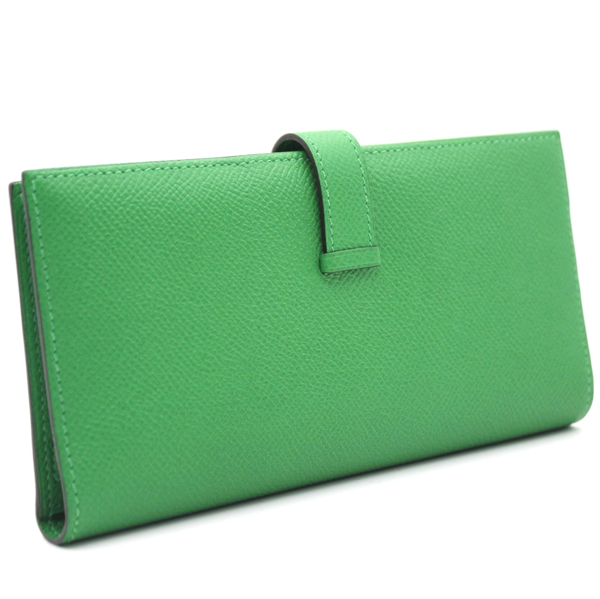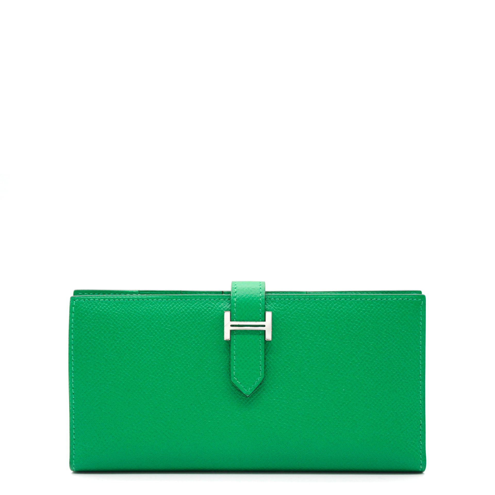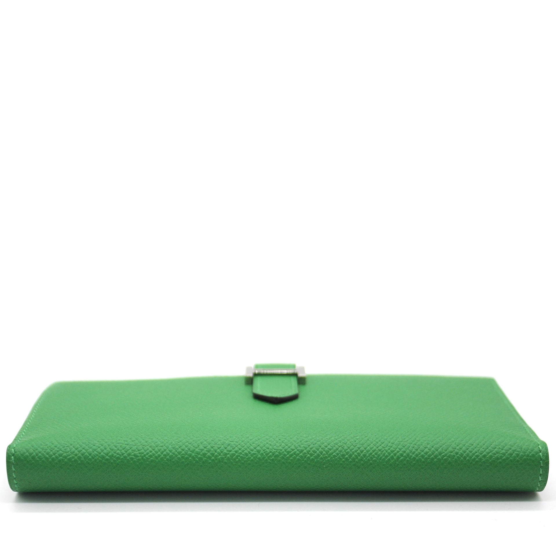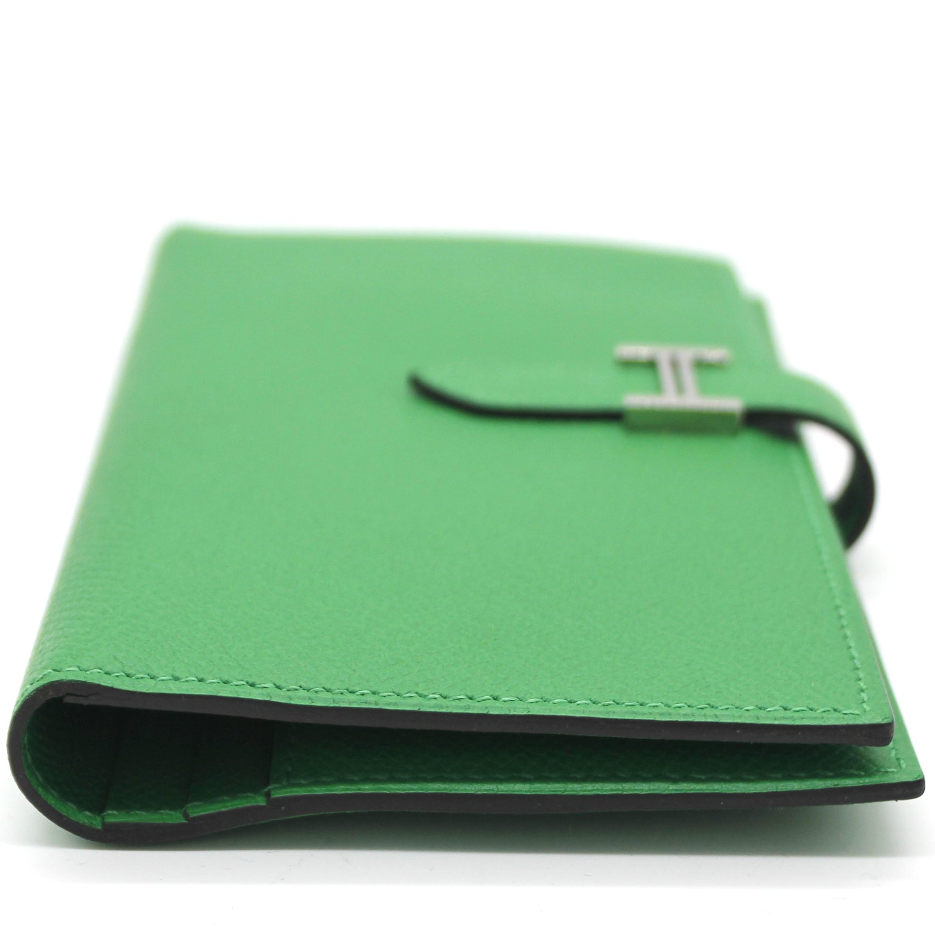 | This authentic Hermes Bearn Wallet Long is your perfect small accessory. Crafted from epsom green leather featuring its silver-plated 'H' tab closure and silver-tone hardware accents. Its matching green leather-lined interior showcases multiple card slots, patch and zip pockets perfect for storing bills, coins and cards. A timeless investment piece for any fashionista. |
