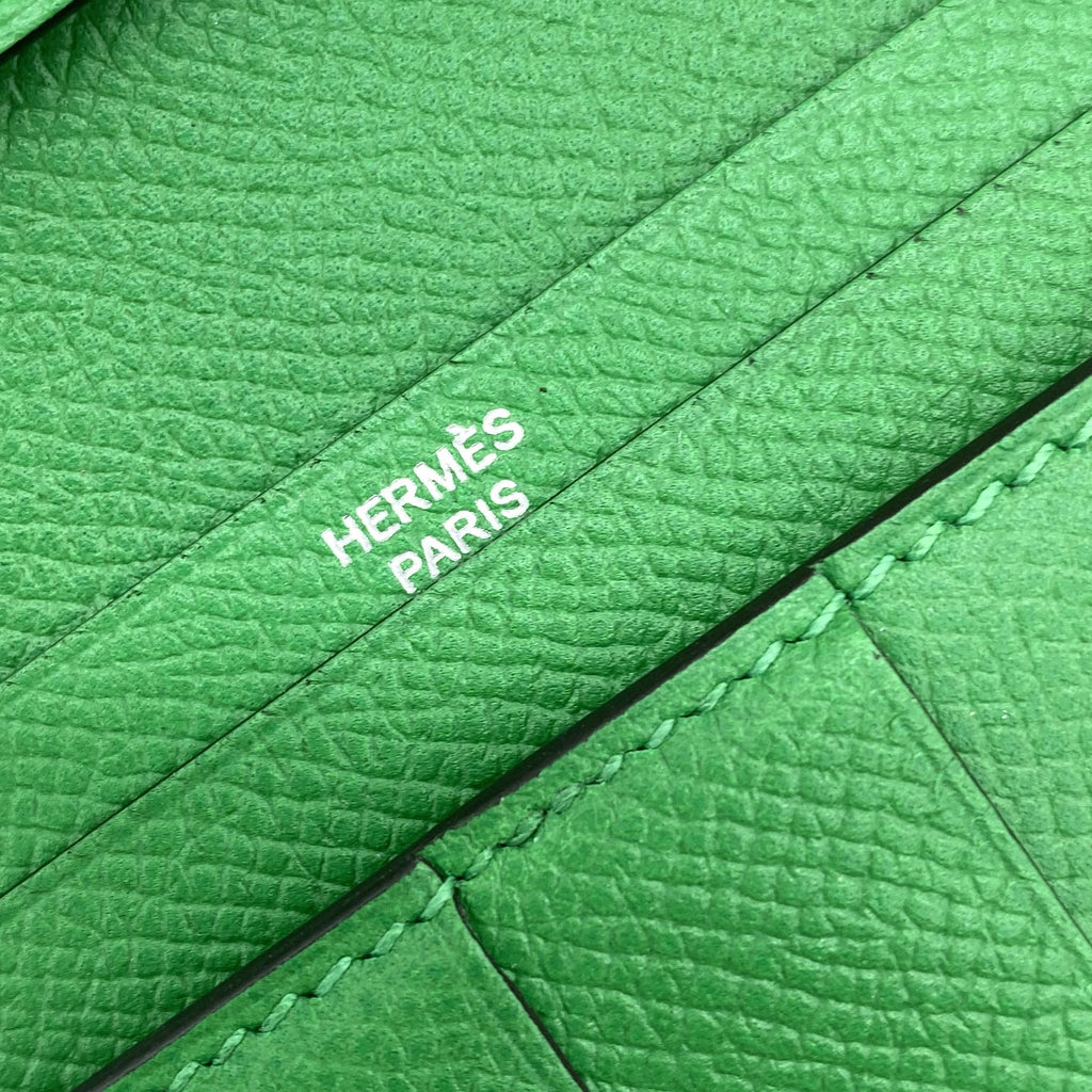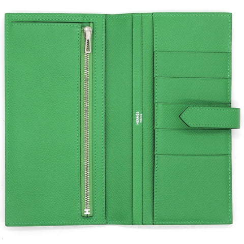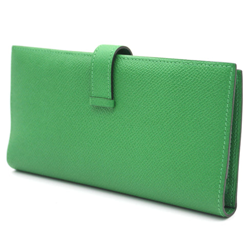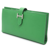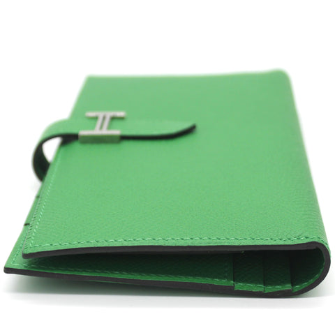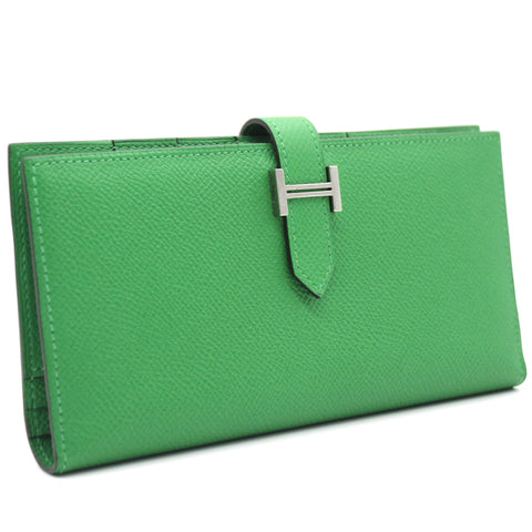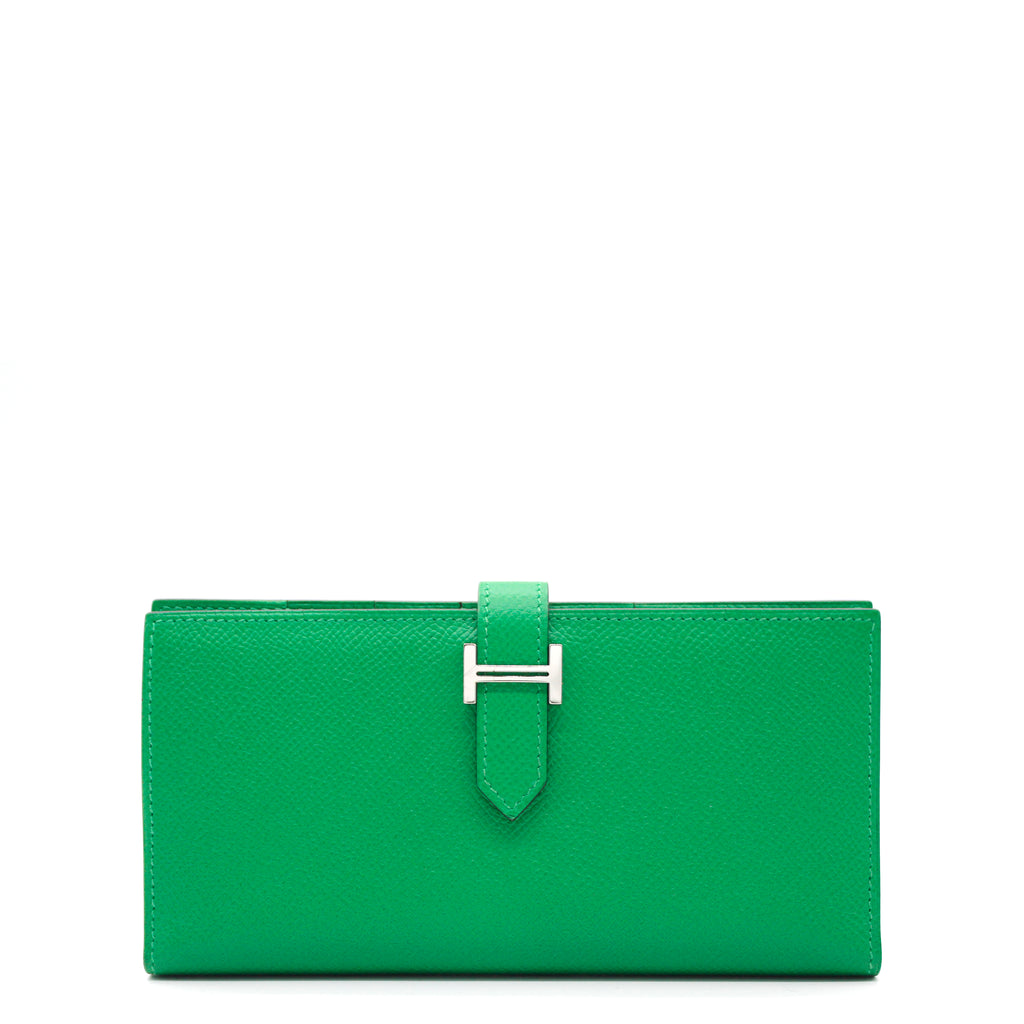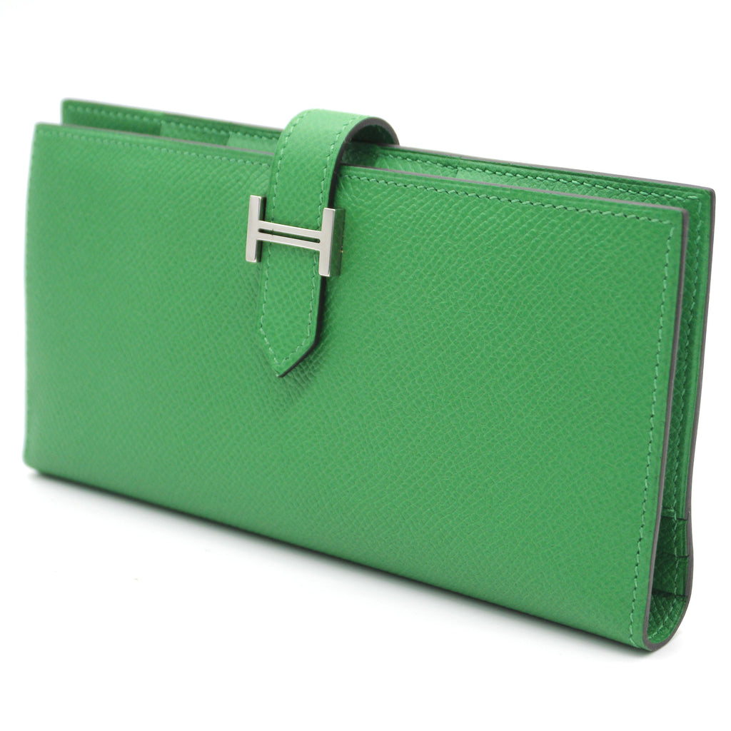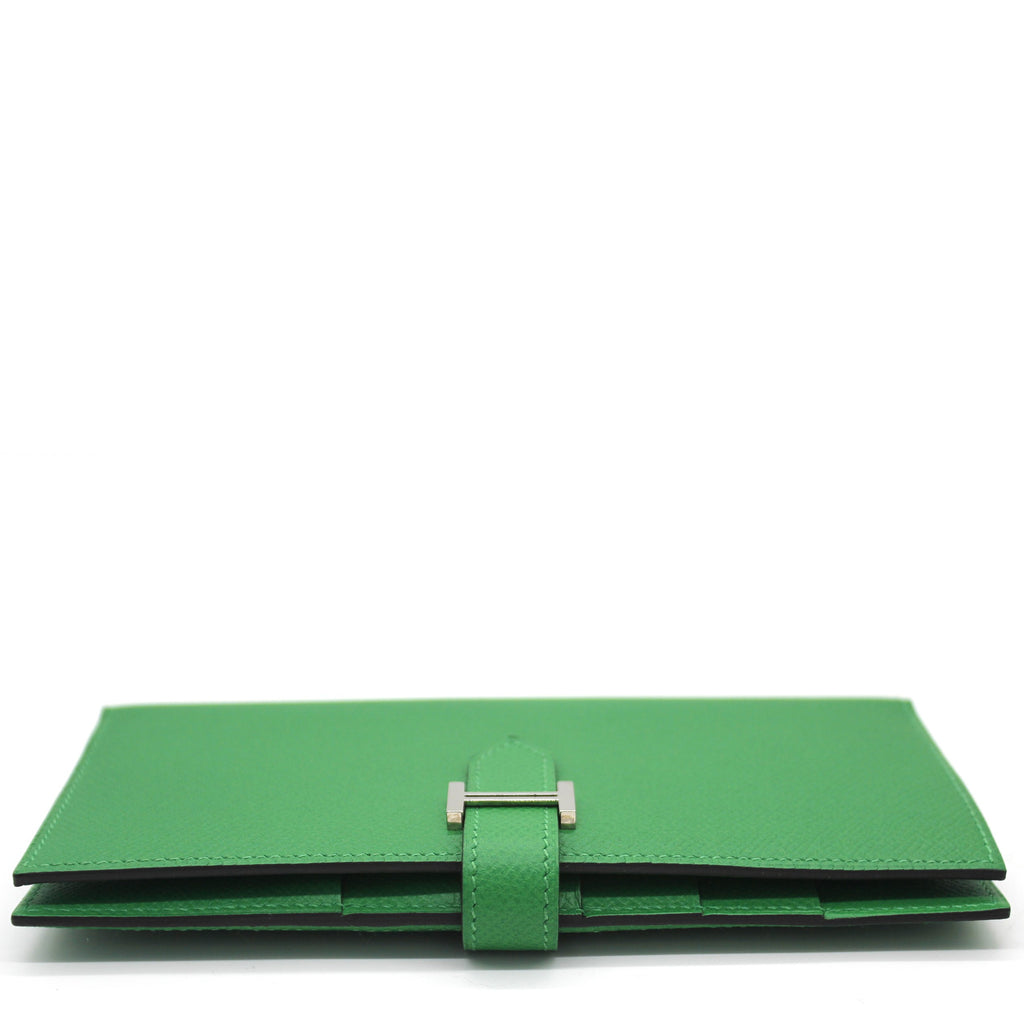 | This authentic Hermes Bearn Wallet Long is your perfect small accessory. Crafted from epsom green leather featuring its silver-plated 'H' tab closure and silver-tone hardware accents. Its matching green leather-lined interior showcases multiple card slots, patch and zip pockets perfect for storing bills, coins and cards. A timeless investment piece for any fashionista. |