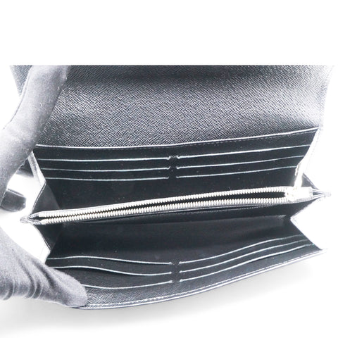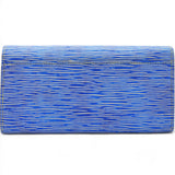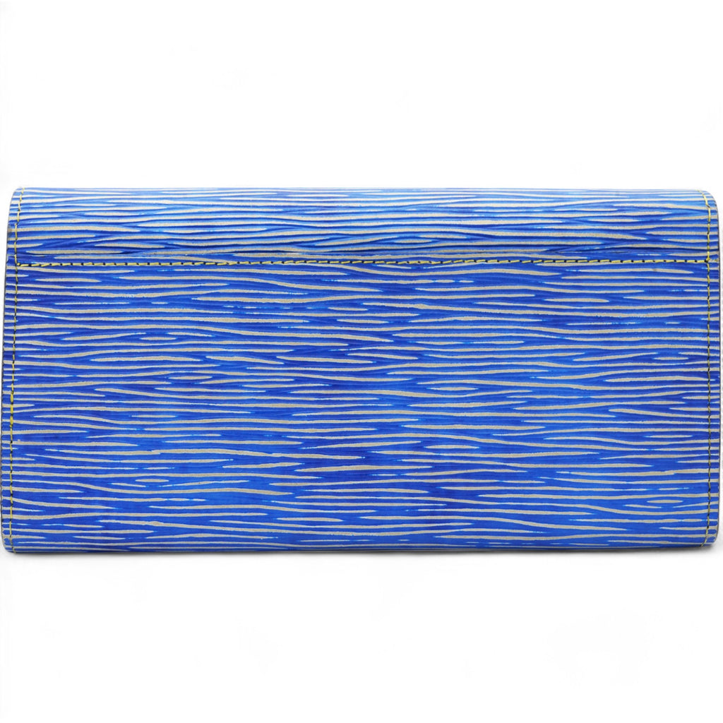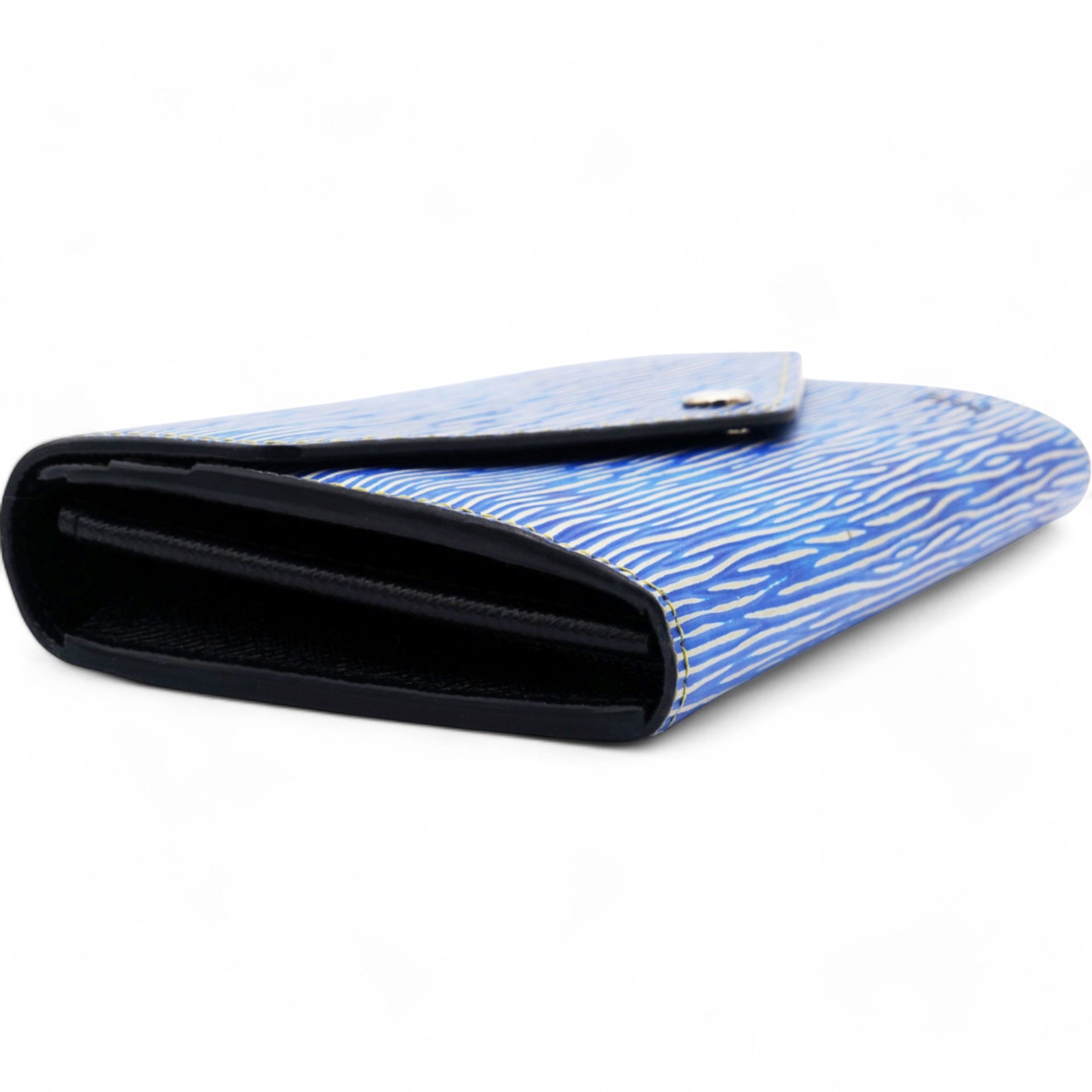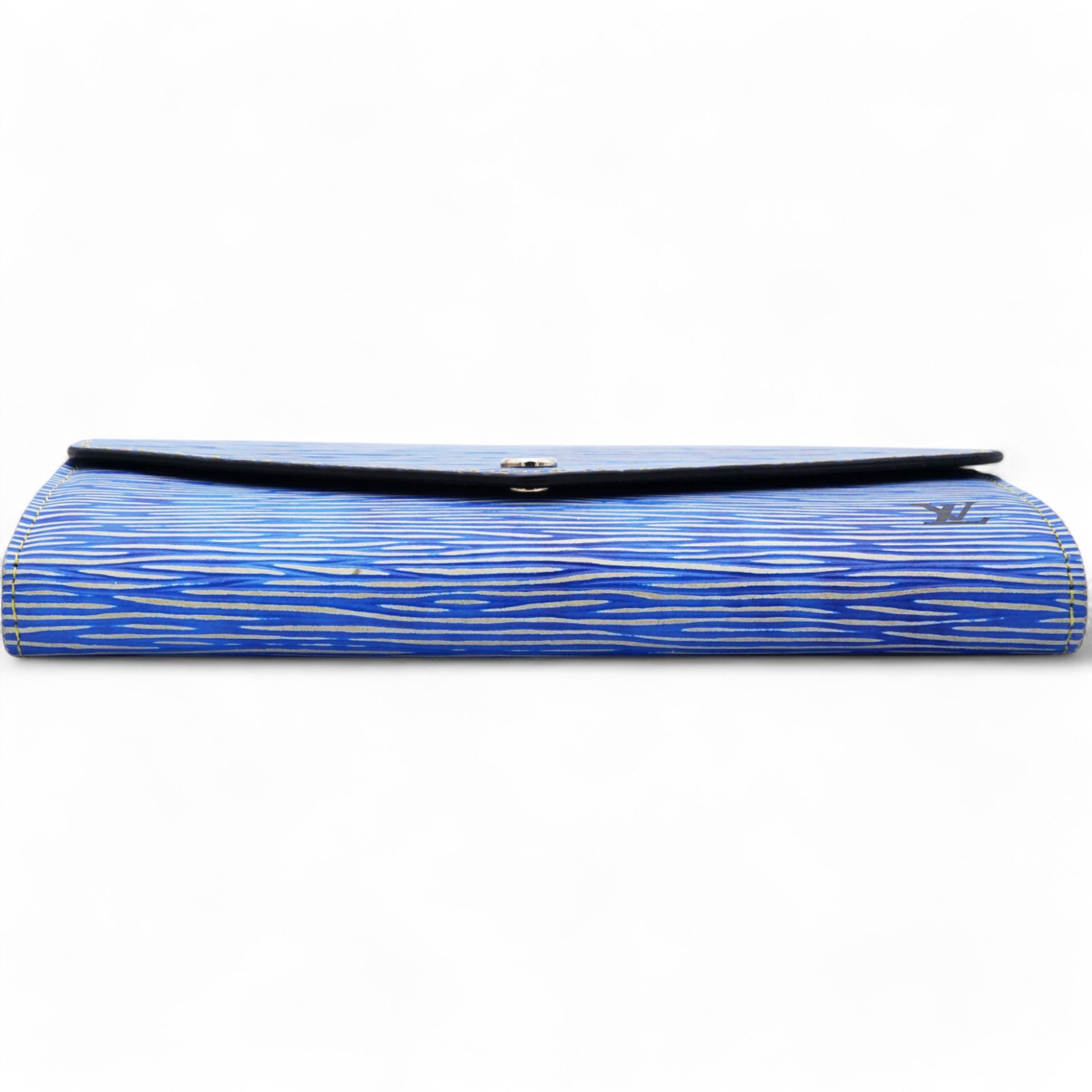 This stunning clutch sized wallet is crafted of Louis Vuitton signature textured epi leather in blue. The wallet has an envelope flap that opens to a partitioned black leather interior with a long pocket, a coin compartment with a silver zipper and card slot panels.