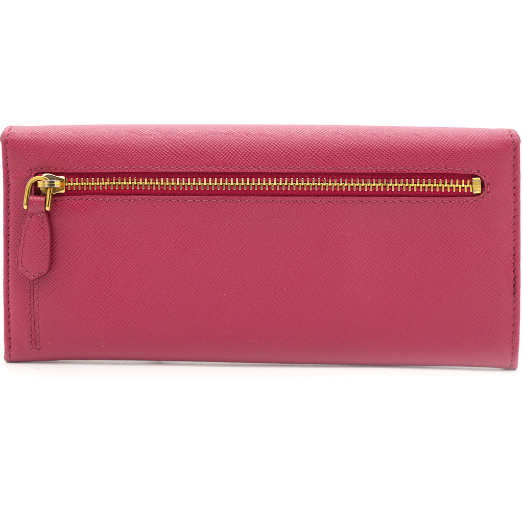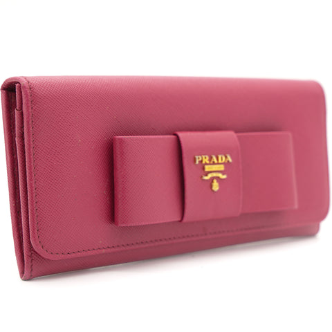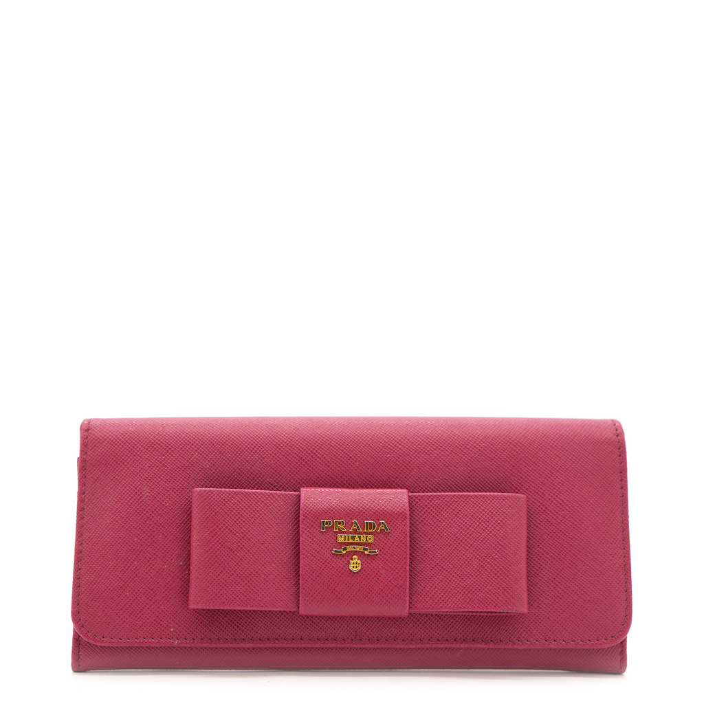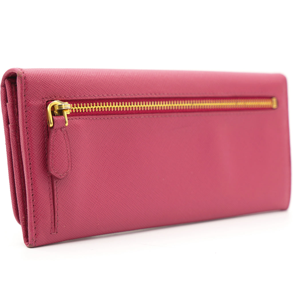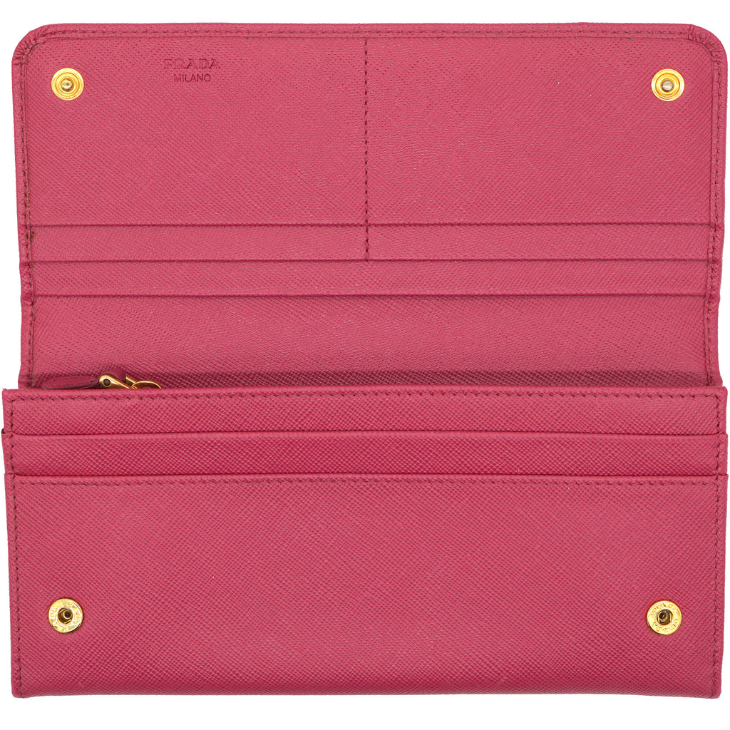 | This Prada wallet is crafted in saffiano leather with gold-tone hardware and a leather matching interior. This Prada wallet features a flap closure with two bill fold pockets, two slip pockets and a eight credit card slots. |