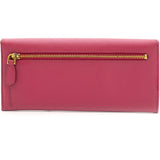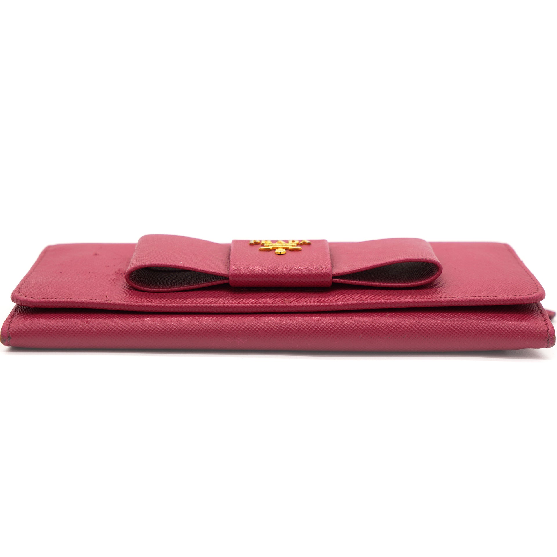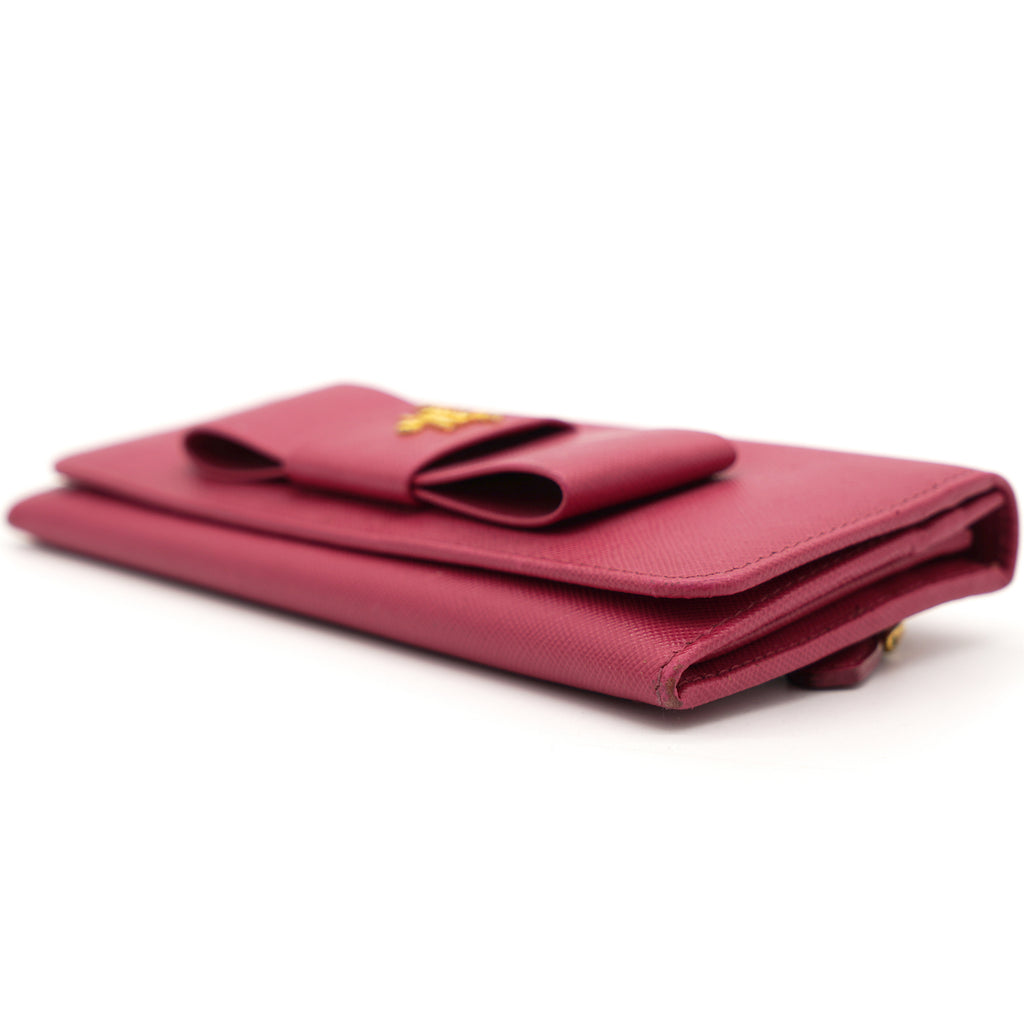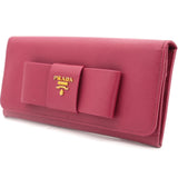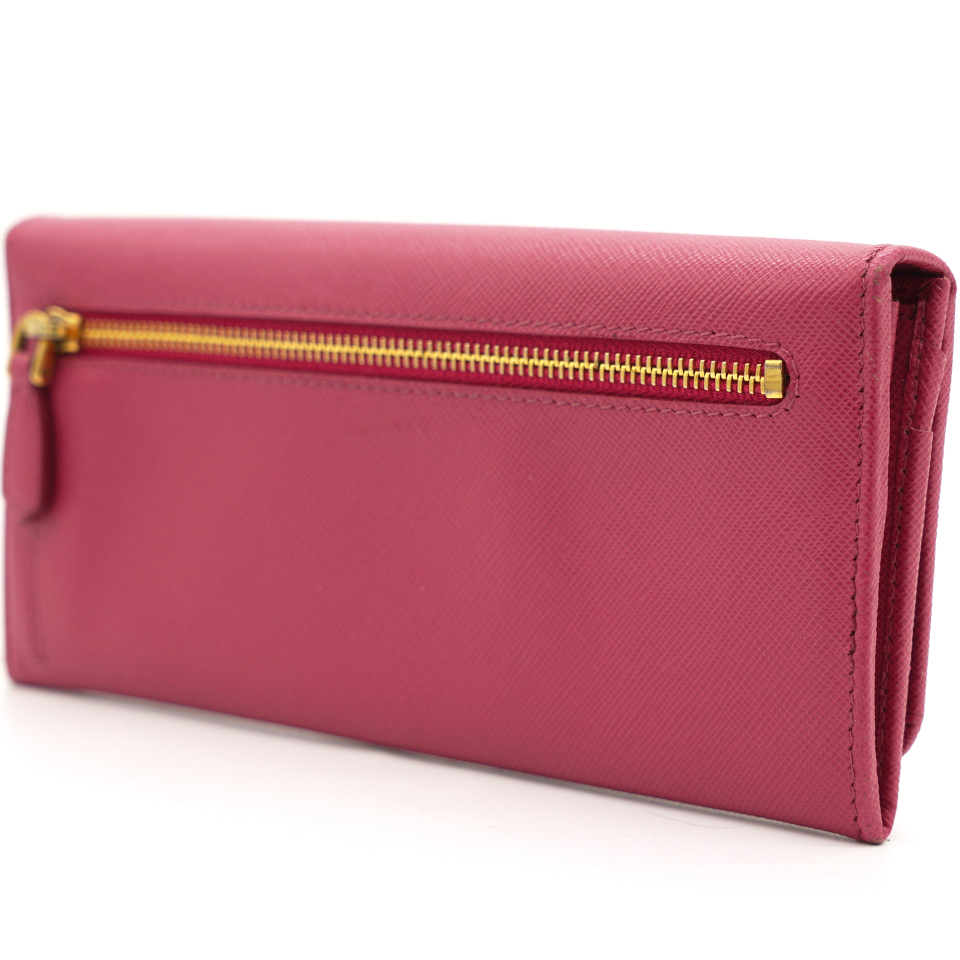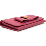 | This Prada wallet is crafted in saffiano leather with gold-tone hardware and a leather matching interior. This Prada wallet features a flap closure with two bill fold pockets, two slip pockets and a eight credit card slots. |