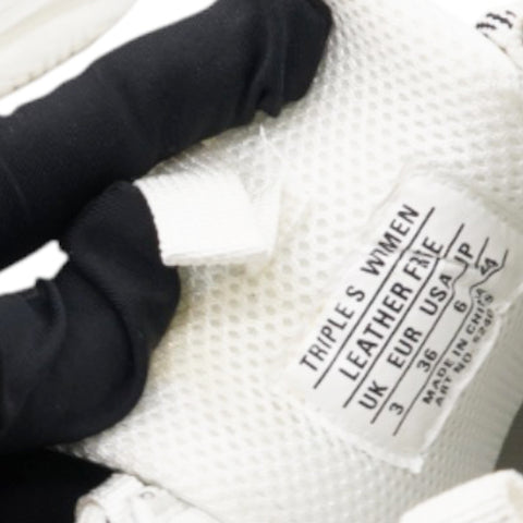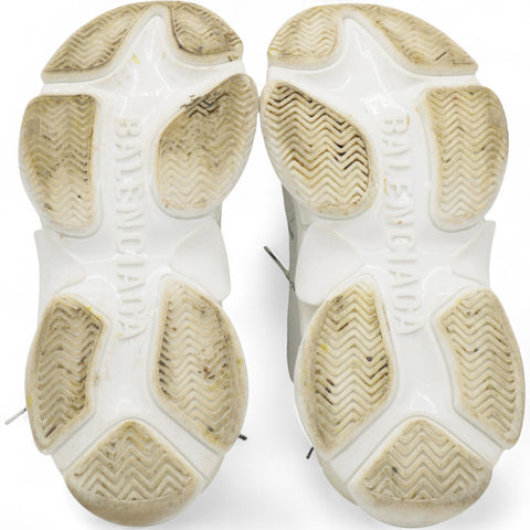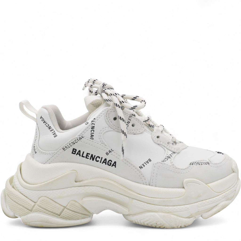| These white Balenciaga Triple S logo print leather sneakers have been designed with a round toe, a lace-up front fastening, a rear pull tab, embroidered logo on the side and chunky rubber sole. Since we discovered Balenciaga trainers, our soles have been elevated. We walk taller because of it. |