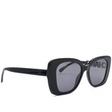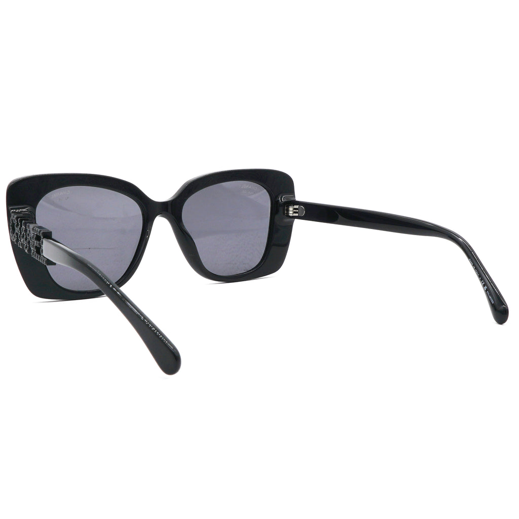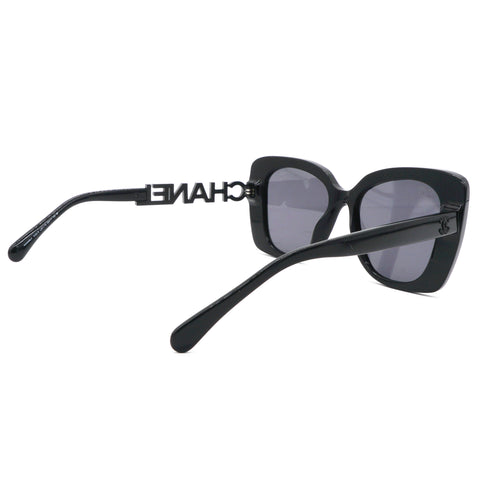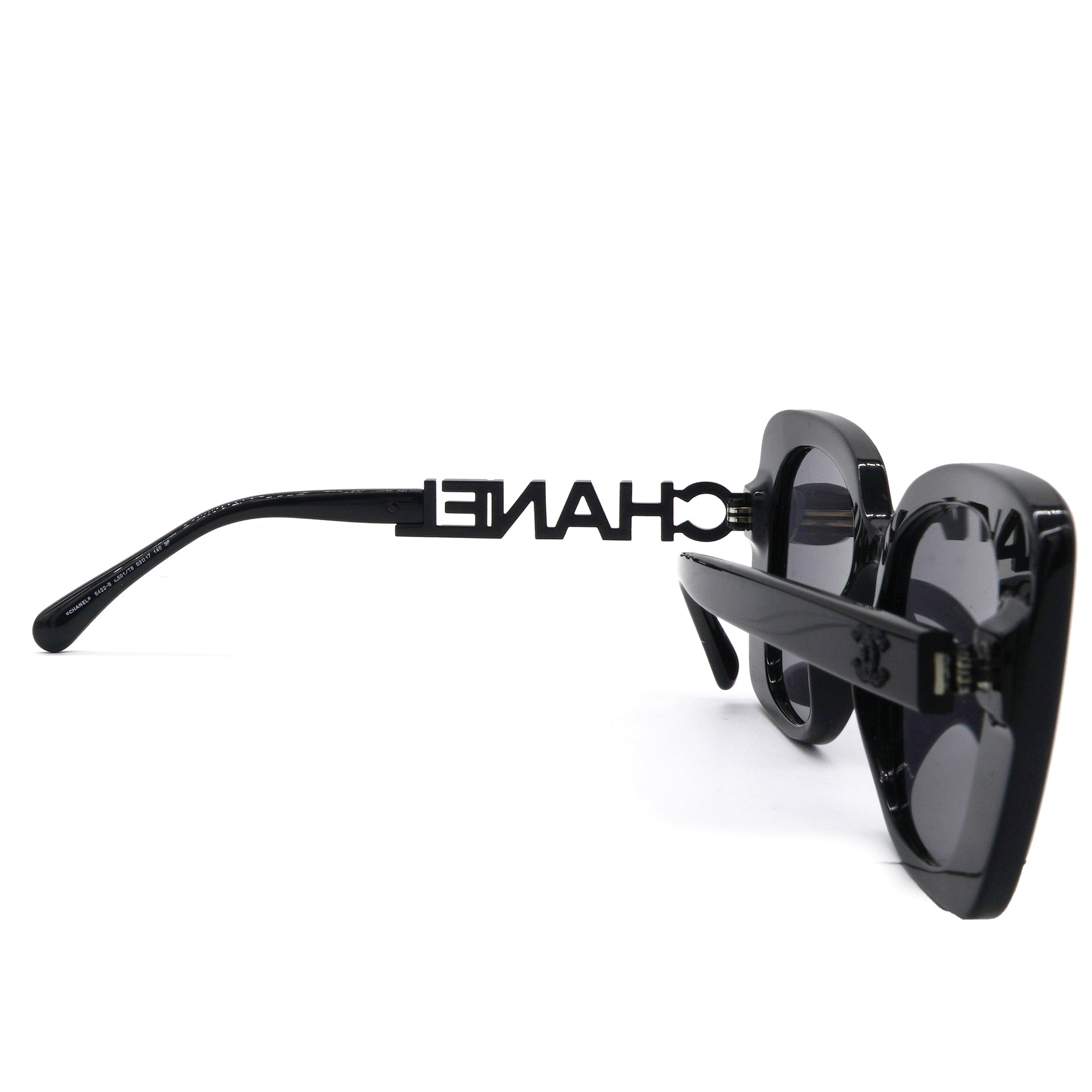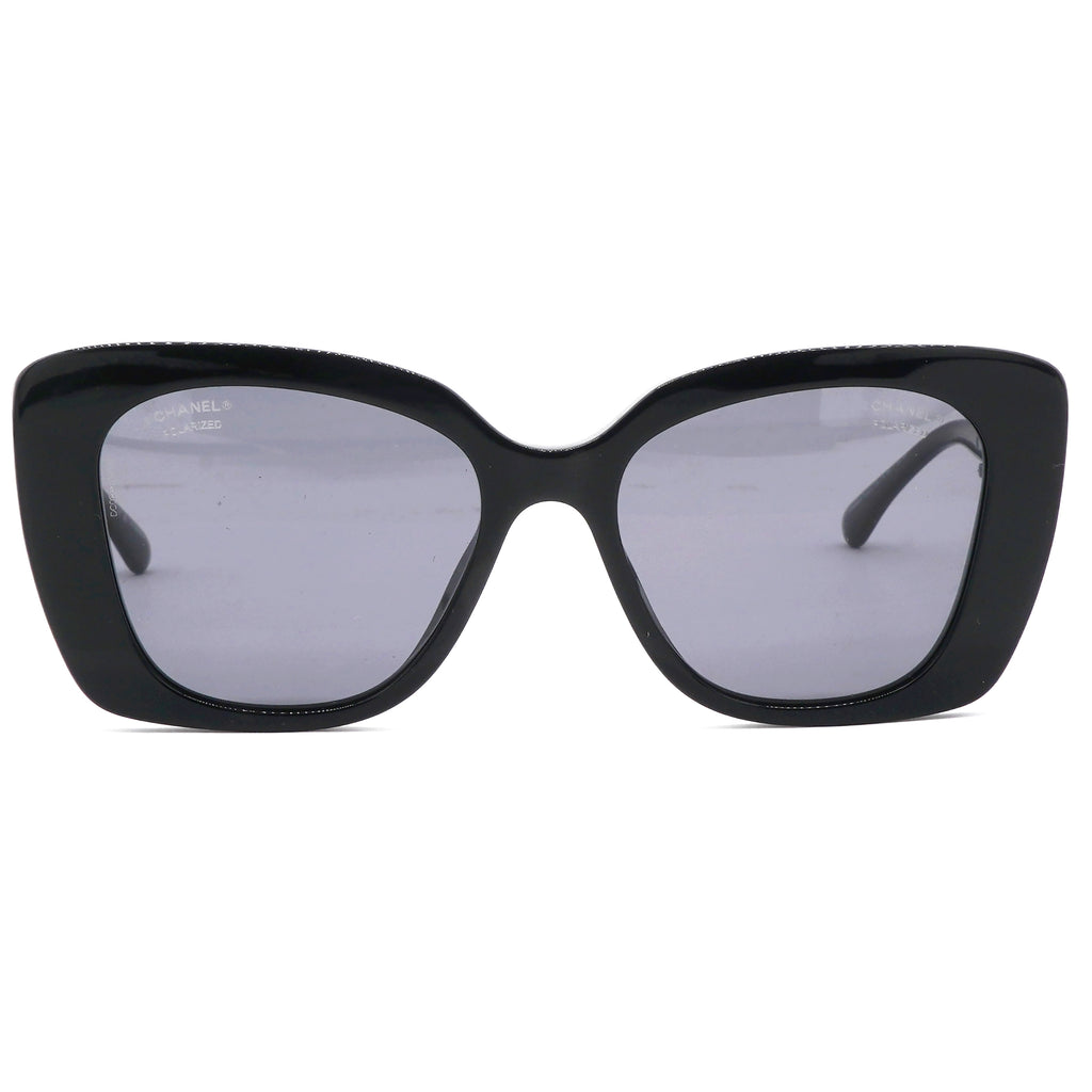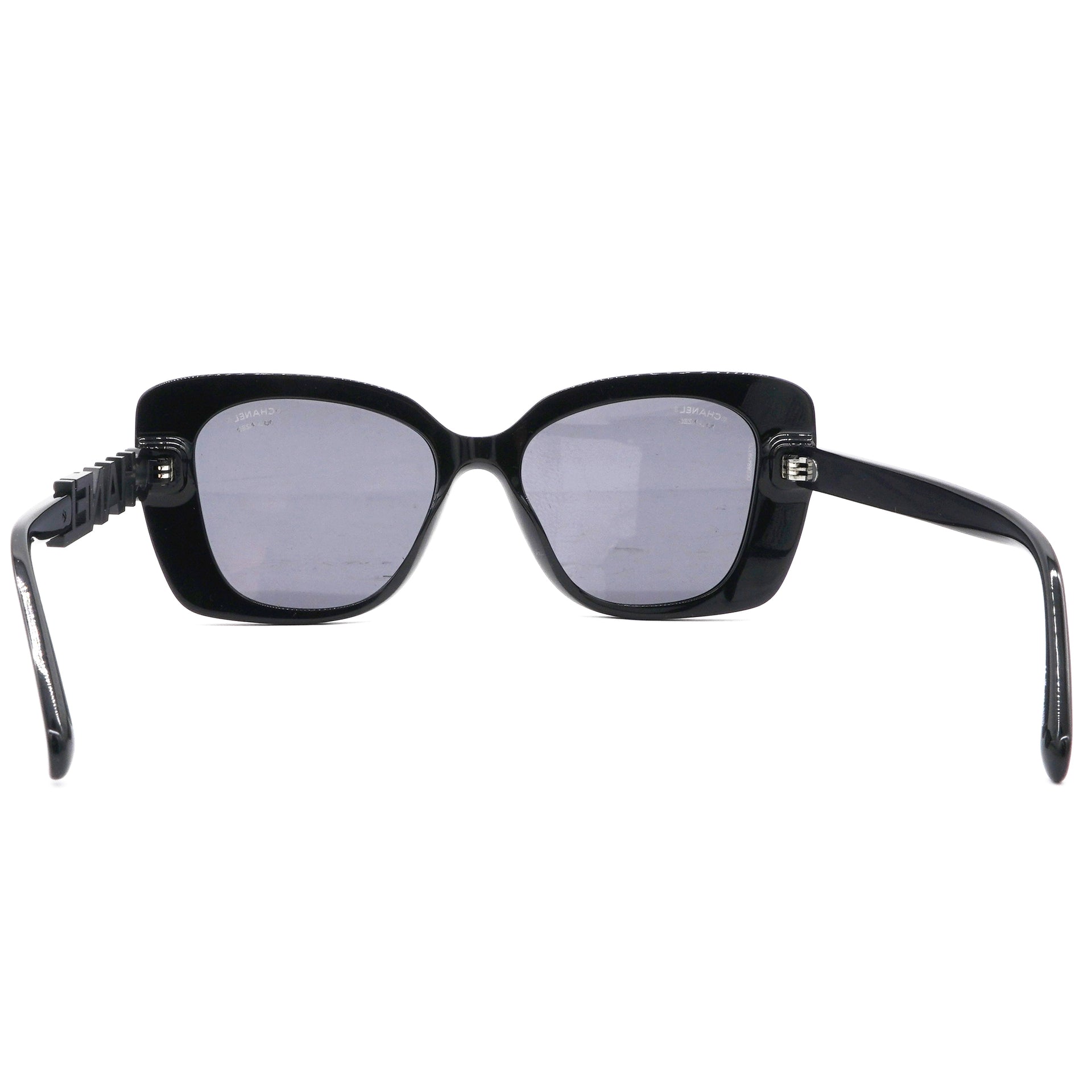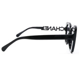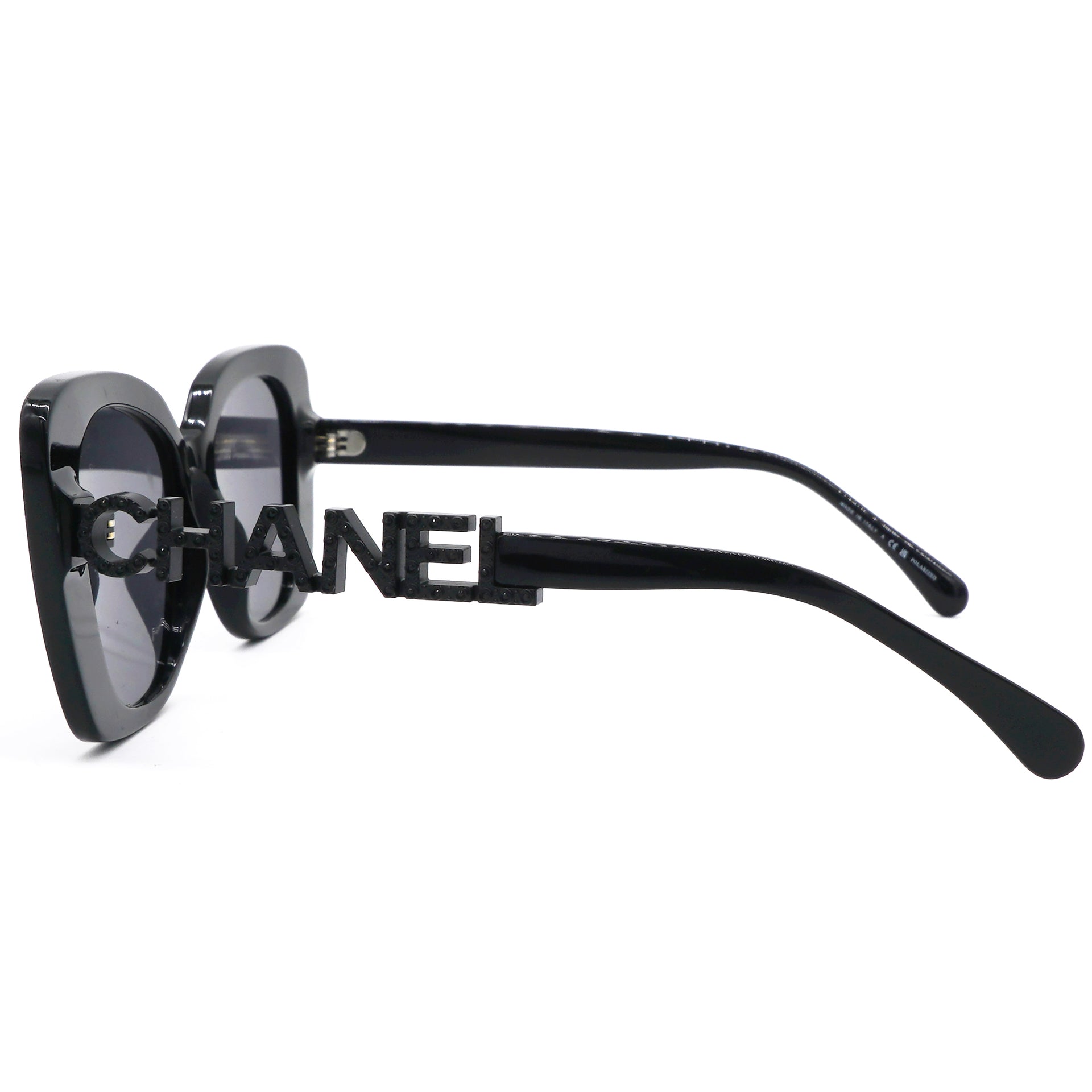 | These stunning sunglasses have a classic cat-eye frame with dark lenses in black. The black arms feature a crystal-lined black Chanel logo at the temple. |