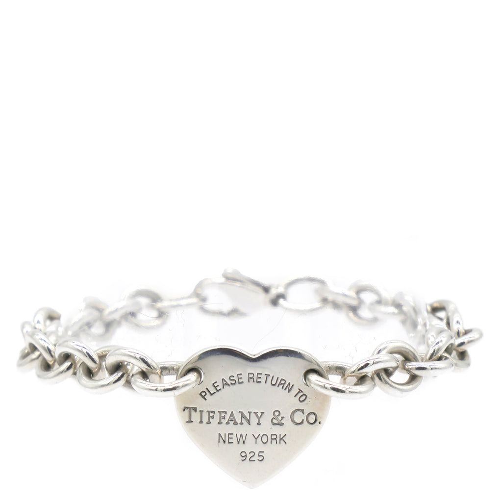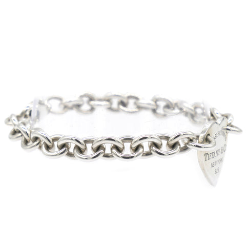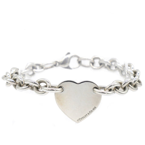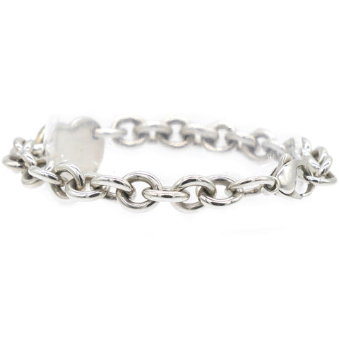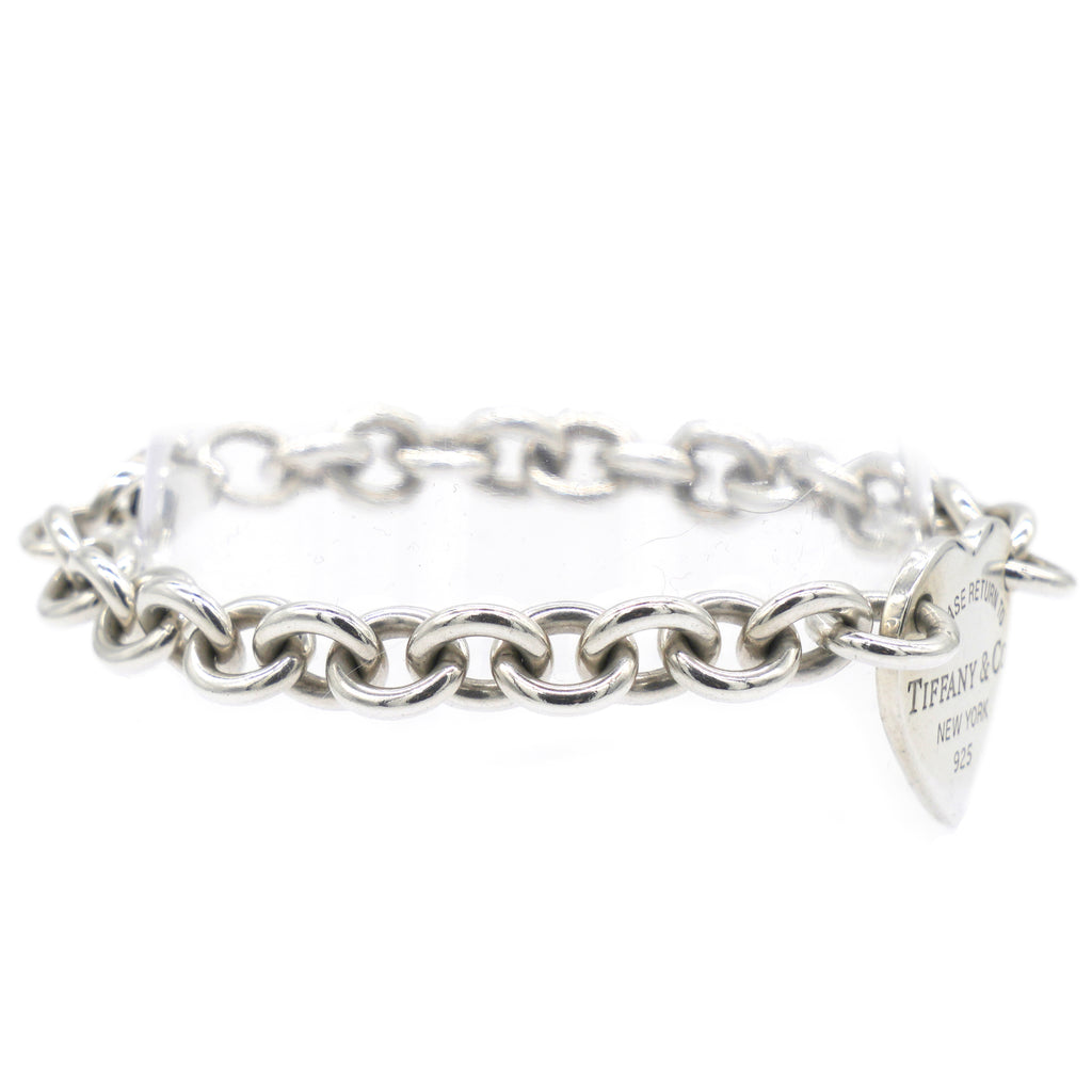 | This is an authentic TIFFANY Sterling Silver Heart Tag Charm Bracelet. The bracelet is crafted of sterling silver and features an oval link chain holding an engravable heart tag charm. |