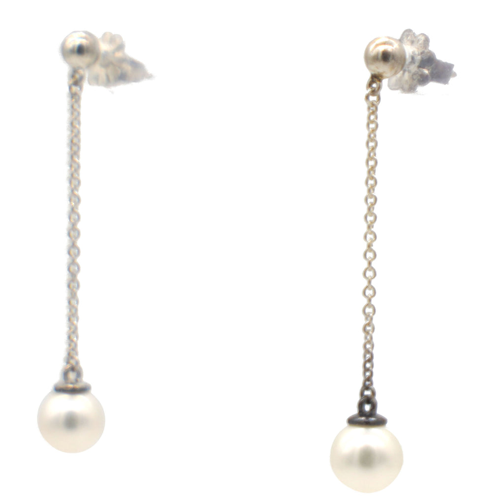 | The dream to own a pair of the prettiest earrings ends with these from Tiffany & Co. Crafted from silver, they have been breathtakingly designed with a bead and a dangling chain holding a cultured pearl. Give your face the radiance by wearing this pair with your dresses. |