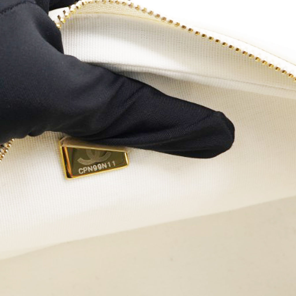 | This stylish handbag is crafted of leather in white. The bag features a top leather handle and a gold chain shoulder strap. The top opens to a white fabric interior with zipper pocket. |