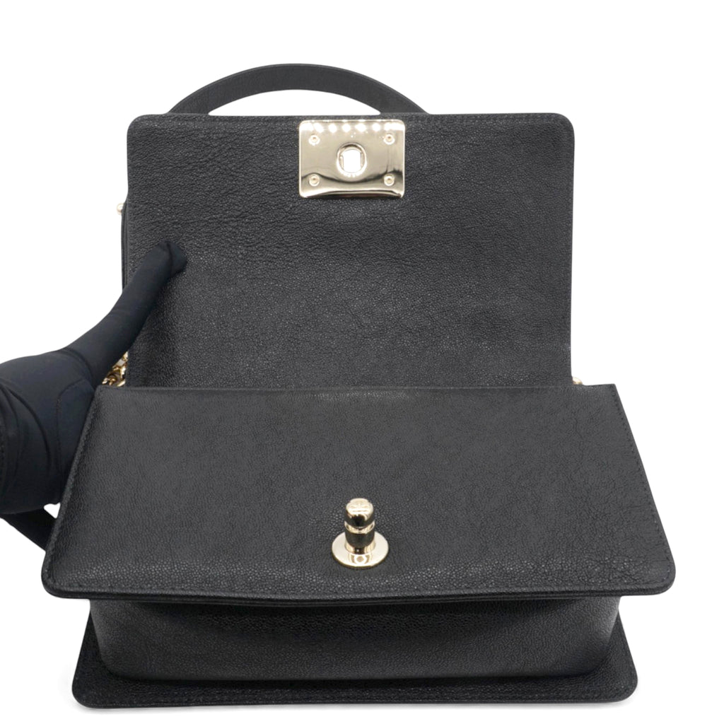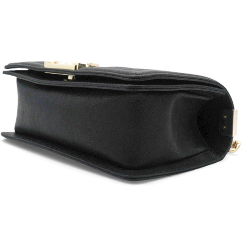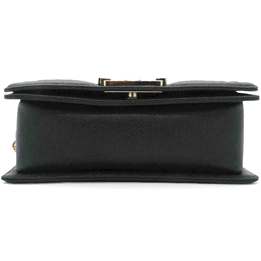 | This shoulder bag is crafted from black caviar leather, featuring gold hardware,making it a compact accessory suitable for various occasions. |