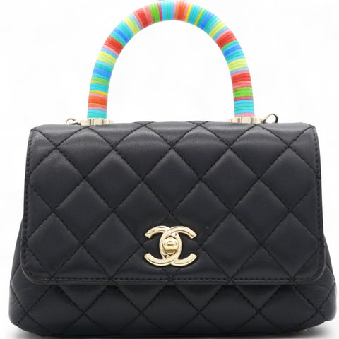 | This elegant Chanel Mini Flap Bag is crafted from supple black lambskin with the house’s signature diamond quilting. It features a structured top handle embellished with a multicolored wrap, paired with gold-tone hardware for a refined touch. The design includes an exterior patch pocket, protective metal feet, and a detachable shoulder strap for versatile styling. A timeless piece that combines classic Chanel codes with modern functionality. |