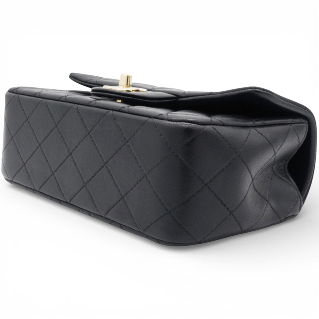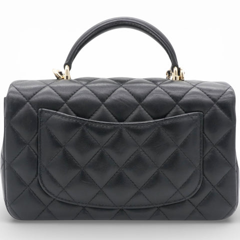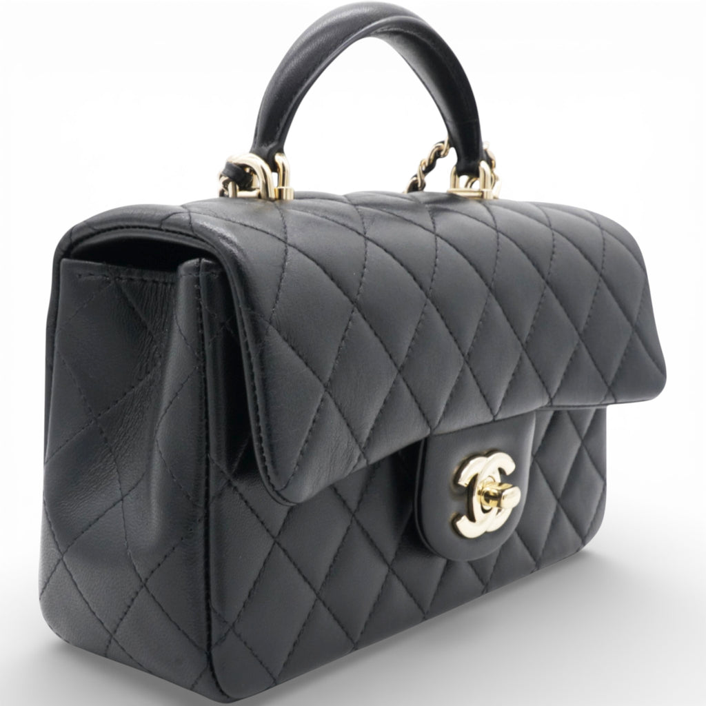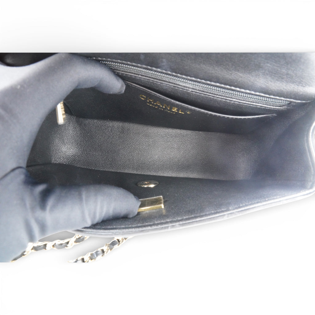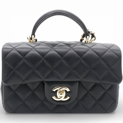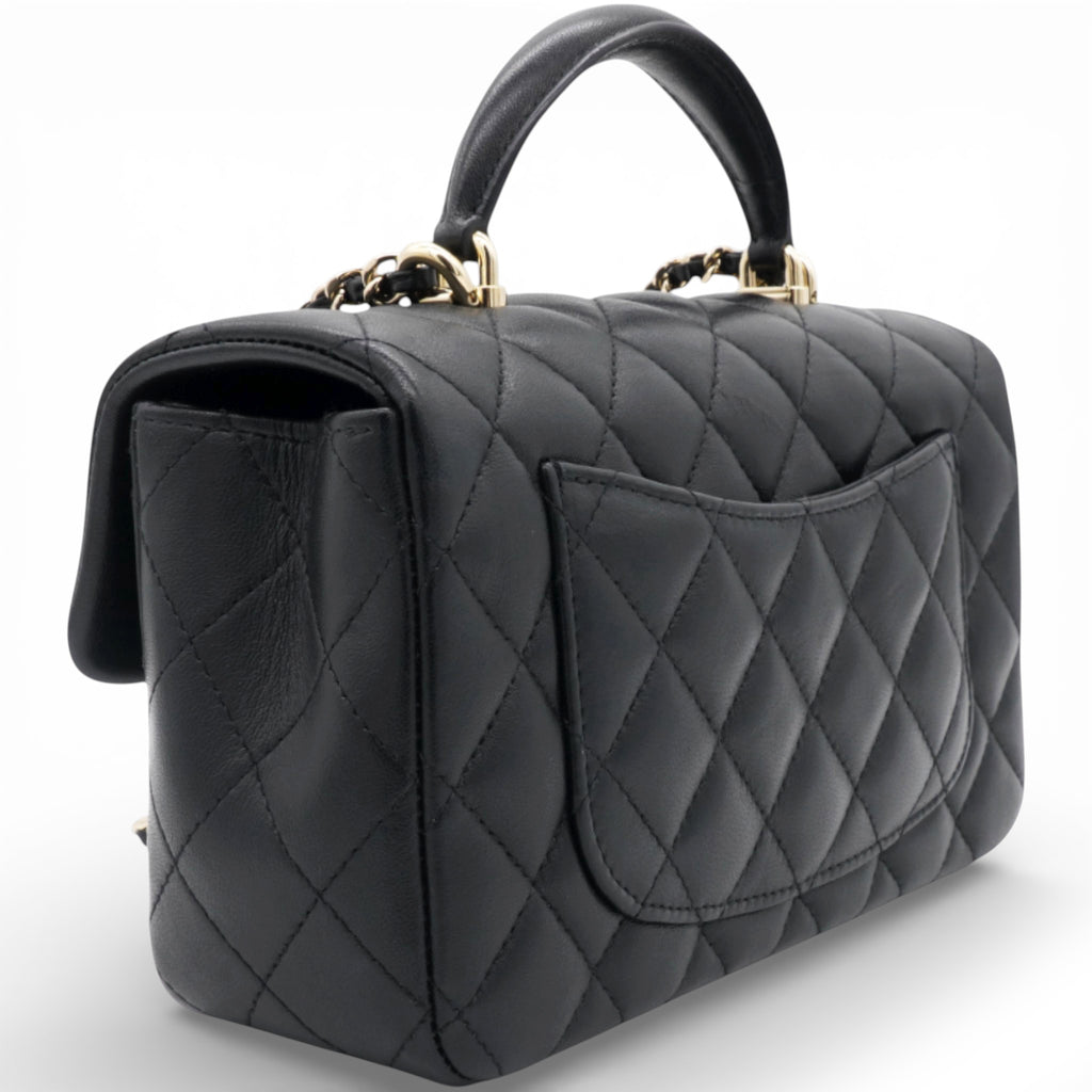 | This chic mini crossbody is crafted of leather in black. The bag features a leather top handle, a gold chain link leather threaded shoulder strap, and a facing gold Classic CC turn lock. This opens the flap to a black leather interior with pockets. |