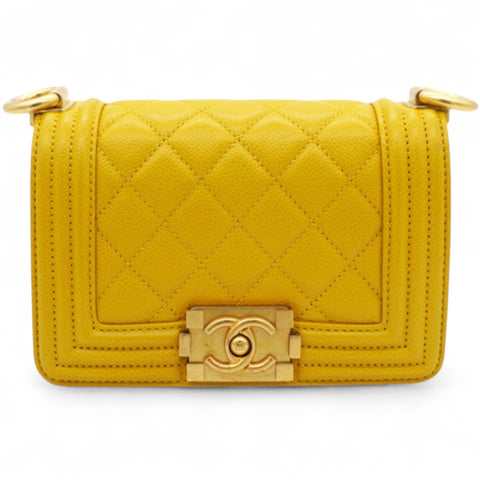 | This chic shoulder bag is finely crafted of leather with signature diamond stitched quilting in yellow. The bag features a polished gold link shoulder strap with a leather shoulder pad and a polished light gold facing Chanel Boy CC push lock. The flap opens to a leather interior with a small patch pocket. |