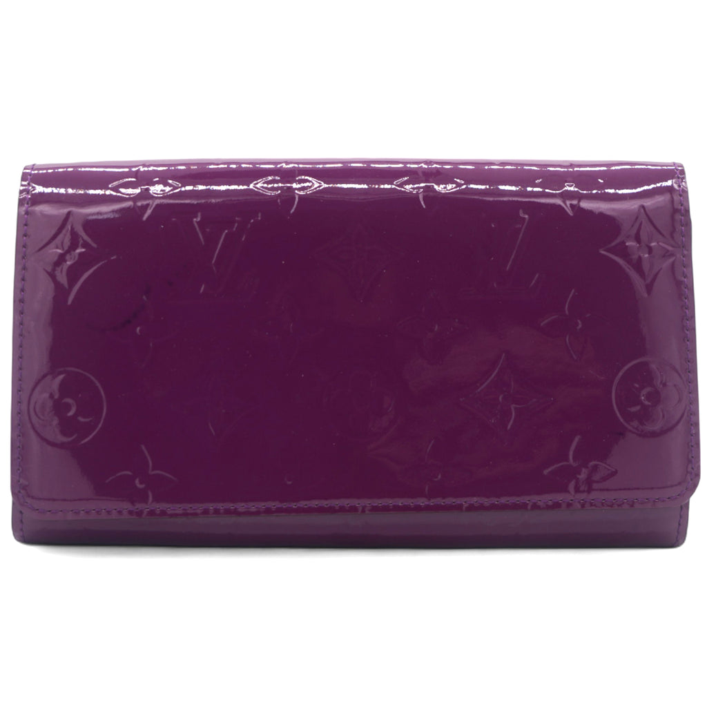 | The amethyst colour goes perfectly the gold tone hardware. Crafted from calfskin leather it has a snap lock closure. It has two bill slots, sixteen card slots and an open pocket, and coin purse. |