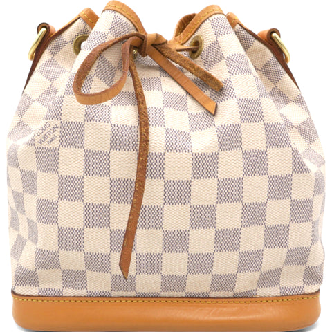 | The bag features vachetta cowhide leather at the base, a pull cinch cord, an adjustable leather shoulder strap, and polished brass hardware including eyelets and links. The pull opens to a beige fabric interior. |