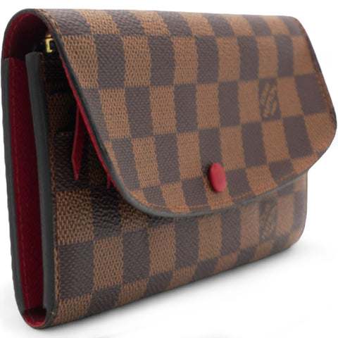 | This stylish wallet is crafted of durable Louis Vuitton Damier checkered canvas in brown. The wallet features a flap that opens with a red leather snap to a red cross-grain leather interior with credit card slots, patch pockets, and a zipper compartment. |