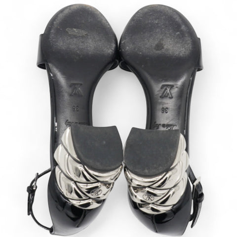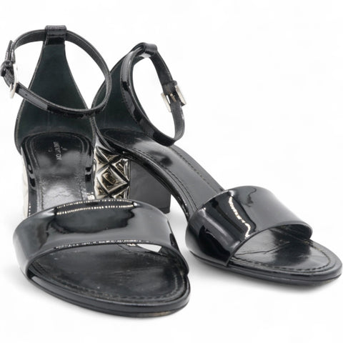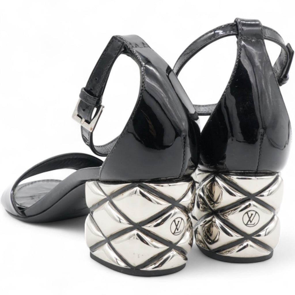 These stylish, classic sandals are crafted of patent leather in black. They feature a 2 inch silver heel with a faux quilt and LV logo, and a black patent leather ankle strap. These are classic heels with luxury and style, only from Louis Vuitton!