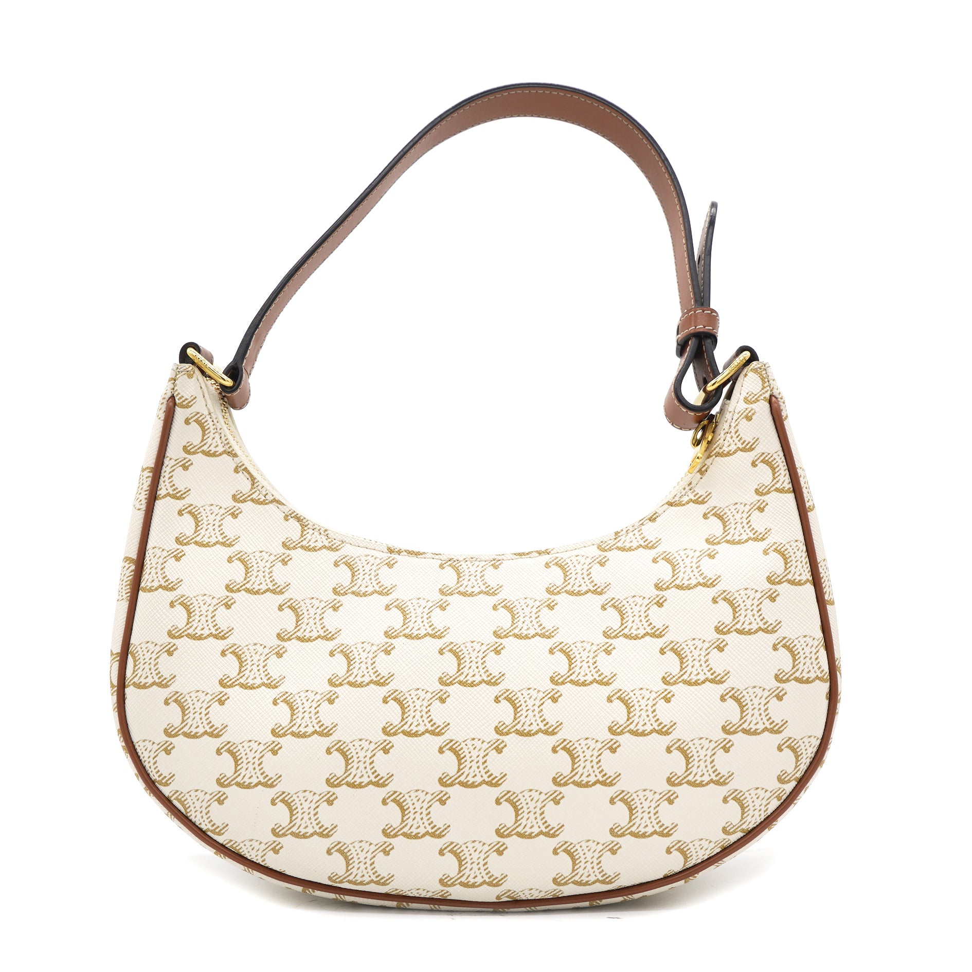 | This is an authentic CELINE Canvas Calfskin Ava Triomphe Shoulder Bag in Beige. This chic bag is crafted of fine canvas with leather trim. The bag features an adjustable leather strap with gold hardware. The top zipper opens to a brown fabric interior with a patch pocket. |