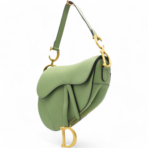 | This saddle-shaped handbag is crafted of grained calfskin leather in green. The bag features a matching leather strap, secured with gold CD logo anchors. The front flap has a gold D initial logo and opens to a green suede interior with a zipper pocket. |