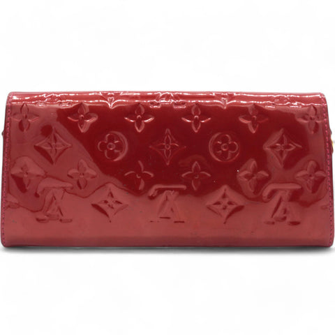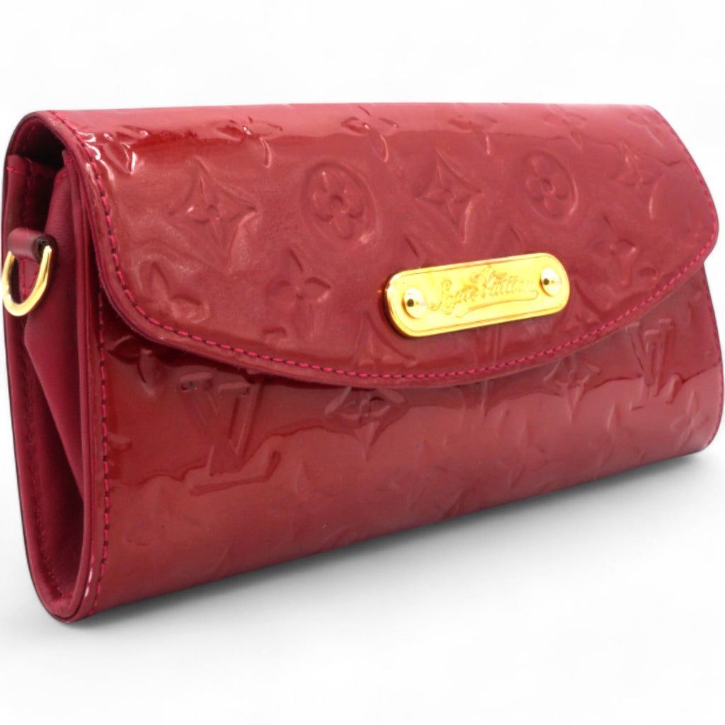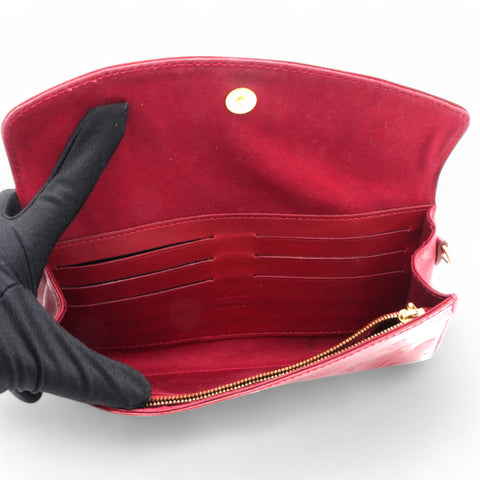 | This stylish handbag is crafted of Louis Vuitton monogram embossed patent leather in red. The bag features a matching patent leather shoulder pad with vachetta leather and gold chain links and a gold-plated Louis Vuitton plaque on the front flap. This opens to a matte leather interior with a card slot panel and zipper compartment. |