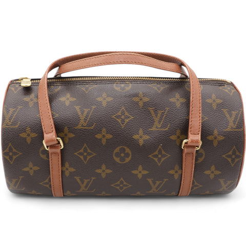 | This Louis Vuitton Monogram Papillon 26 handbag is crafted from durable canvas in a brown monogram pattern, complemented by gold hardware. |