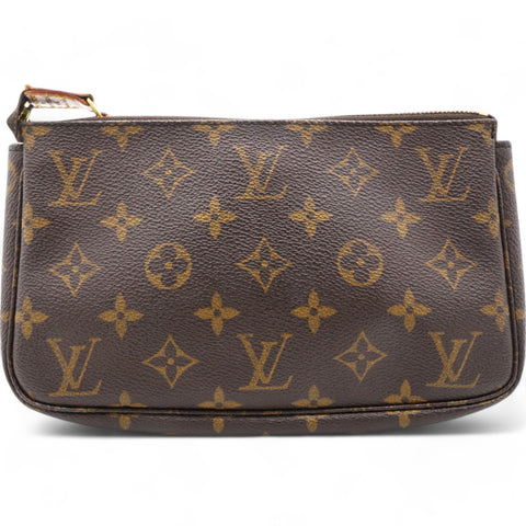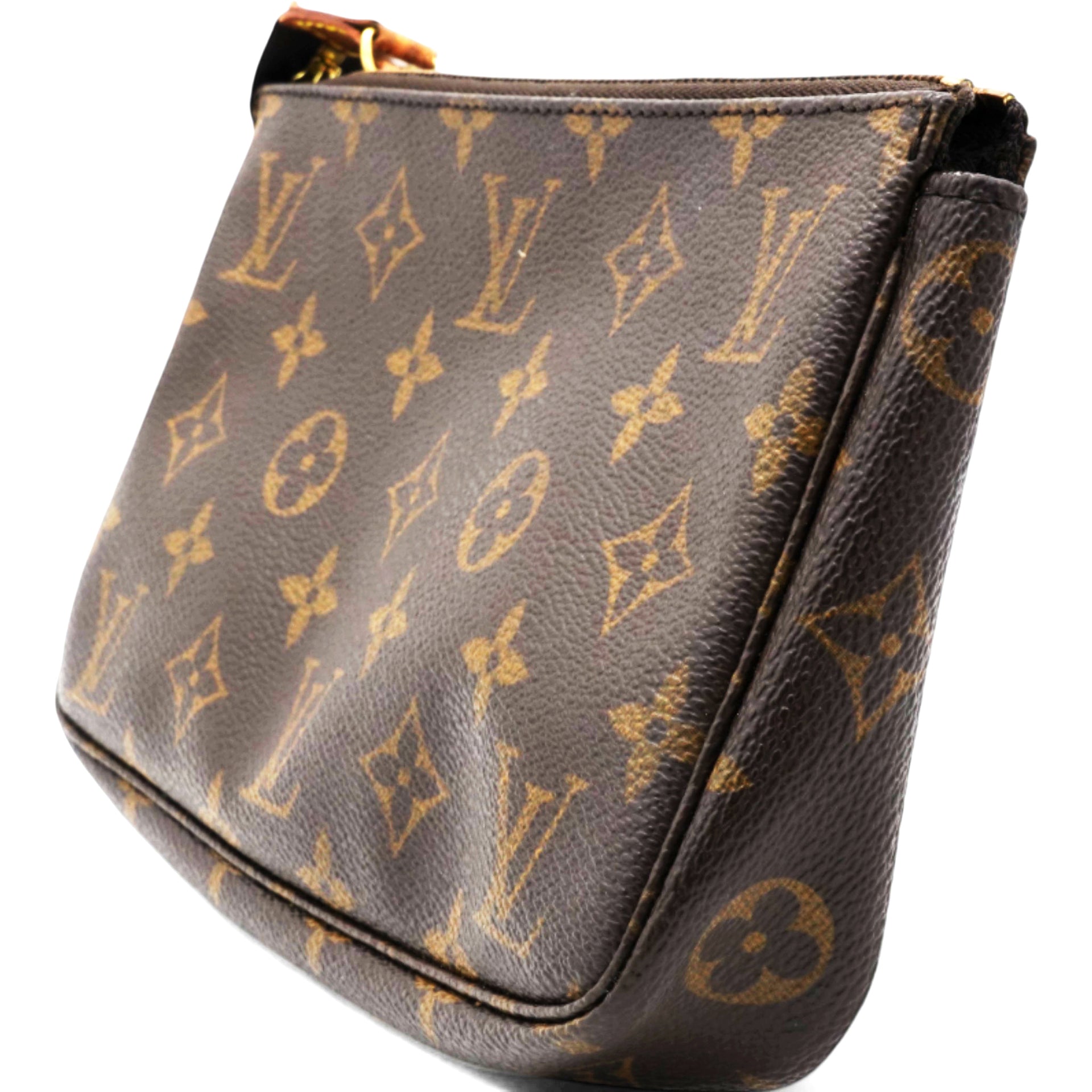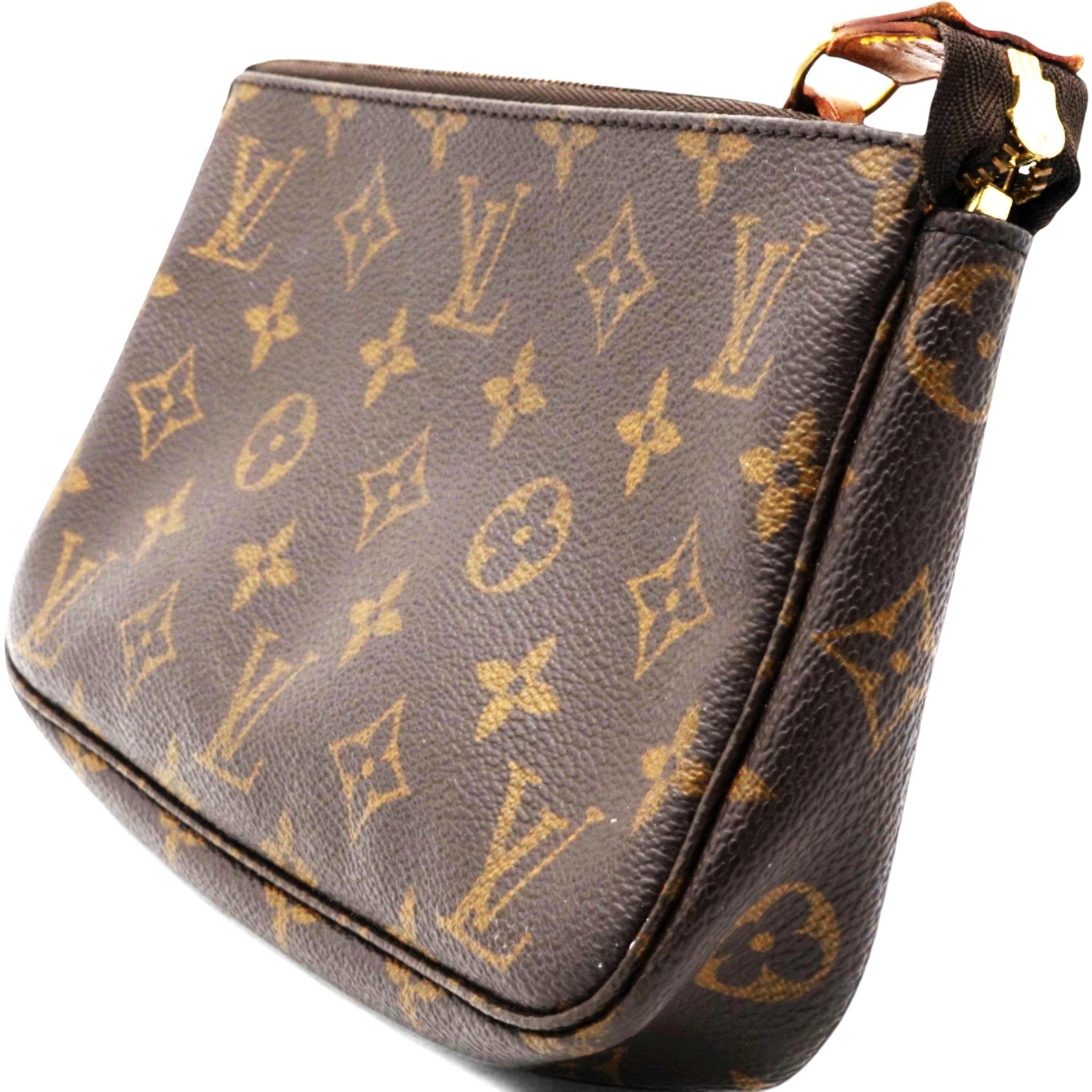 | This pochette is crafted of signature Louis Vuitton monogram coated canvas in brown. The bag features a vachetta leather shoulder strap and a top zipper that opens to a brown fabric interior. |