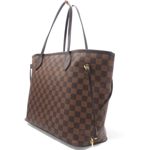 | The Neverfull MM tote unites timeless design with heritage details. Elegant in Damier Ebene canvas with natural cowhide trim, it is roomy but not bulky, with side laces that cinch for a sleek allure or loosen for a casual look. Slim, comfortable handles slip easily over the shoulder or arm. Lined in colorful textile, it features a removable pouch which can be used as a clutch or an extra pocket. |