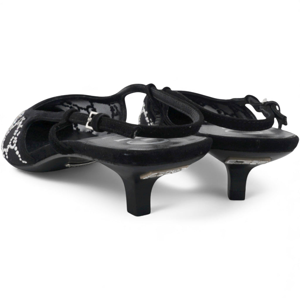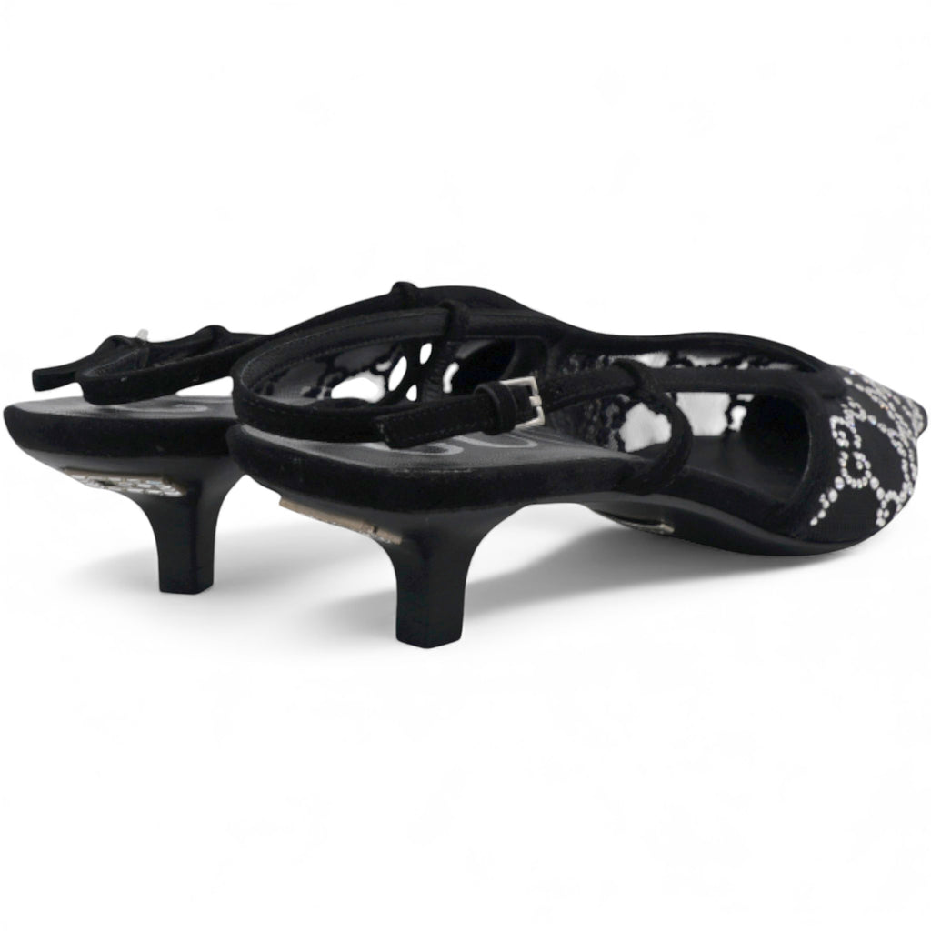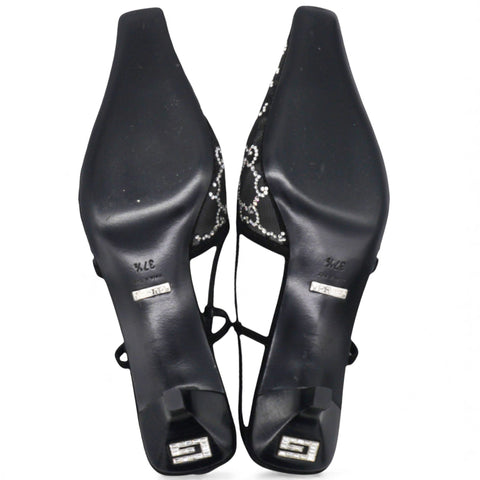 Gucci Demi Ballet Black Mesh Crystal Sandals. Black mesh with GG crystals pattern, pointed toe, sling back, adjustable strap with buckle, flat heel, branded leather insole and outsole.