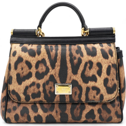 | This chic satchel is crafted of leopard print calfskin leather. The bag features a reinforced leather top handle with brass links and leather anchors, an optional adjustable shoulder strap with brass clasps and a classic facing flap. The flap opens to a black fabric interior with zipper and patch pockets. |