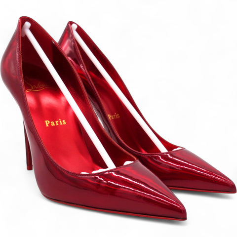 | These sophisticated heels are crafted from glossy patent calfskin in a striking red hue. Featuring a pointed toe and a logo-embossed padded leather footbed for comfort, they also include a suede lining for added luxury. The covered stiletto heel with rubber injection ensures stability, while the signature red leather sole adds an iconic touch. |