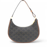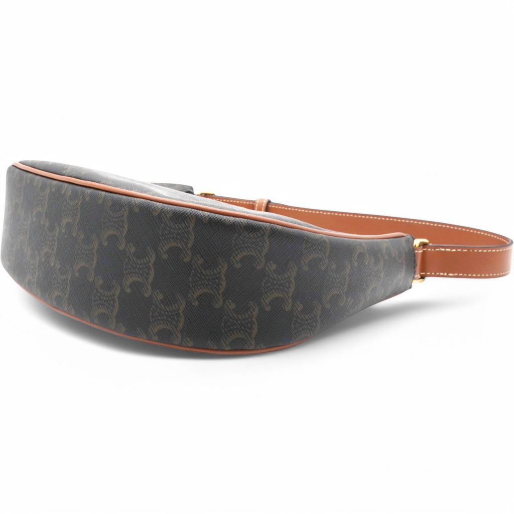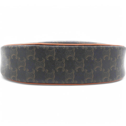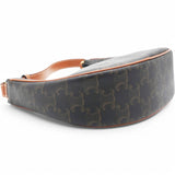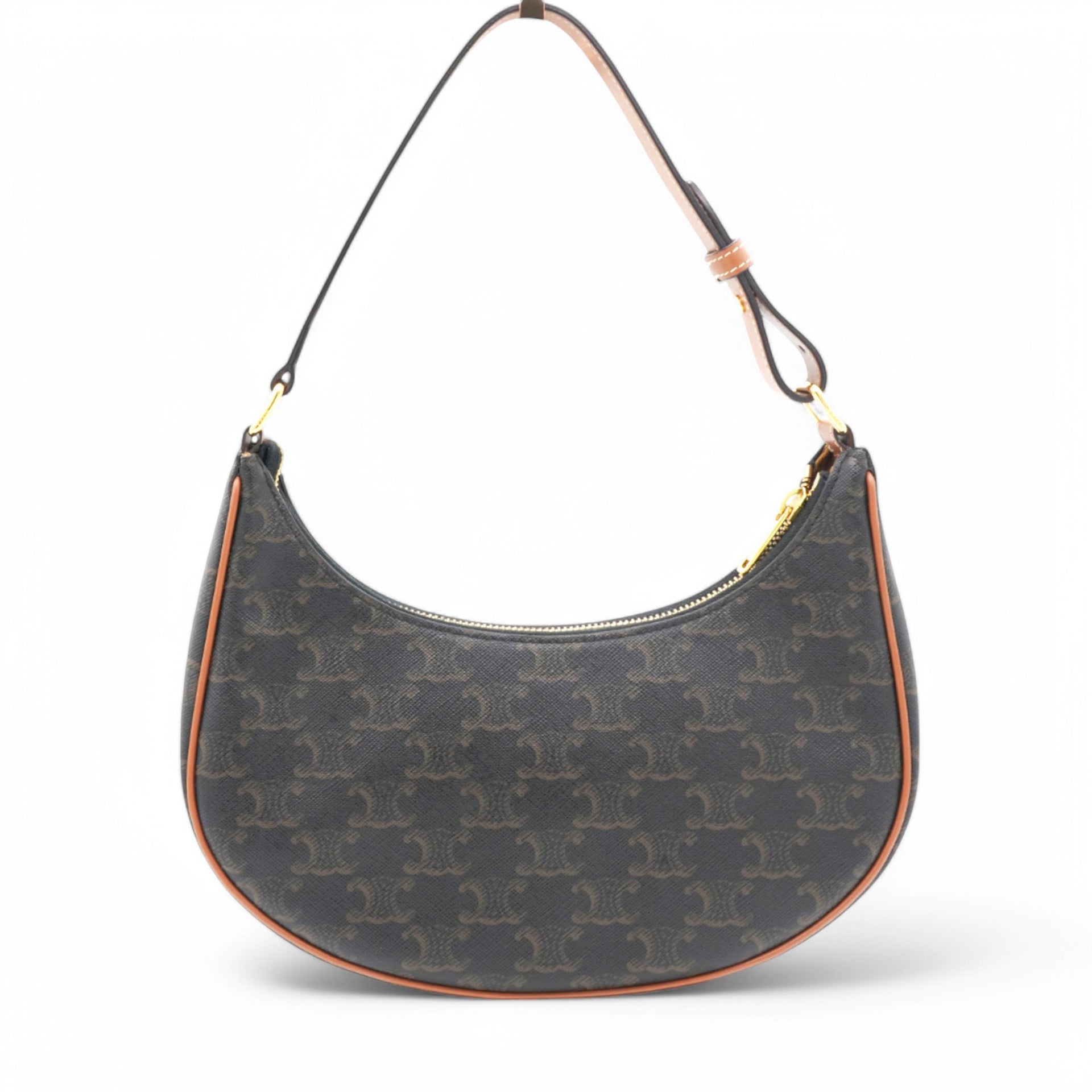 | This chic bag is crafted of fine black coated canvas with brown leather trim. The bag features an adjustable leather strap with gold hardware. The top zipper opens to a brown fabric interior with a patch pocket. |