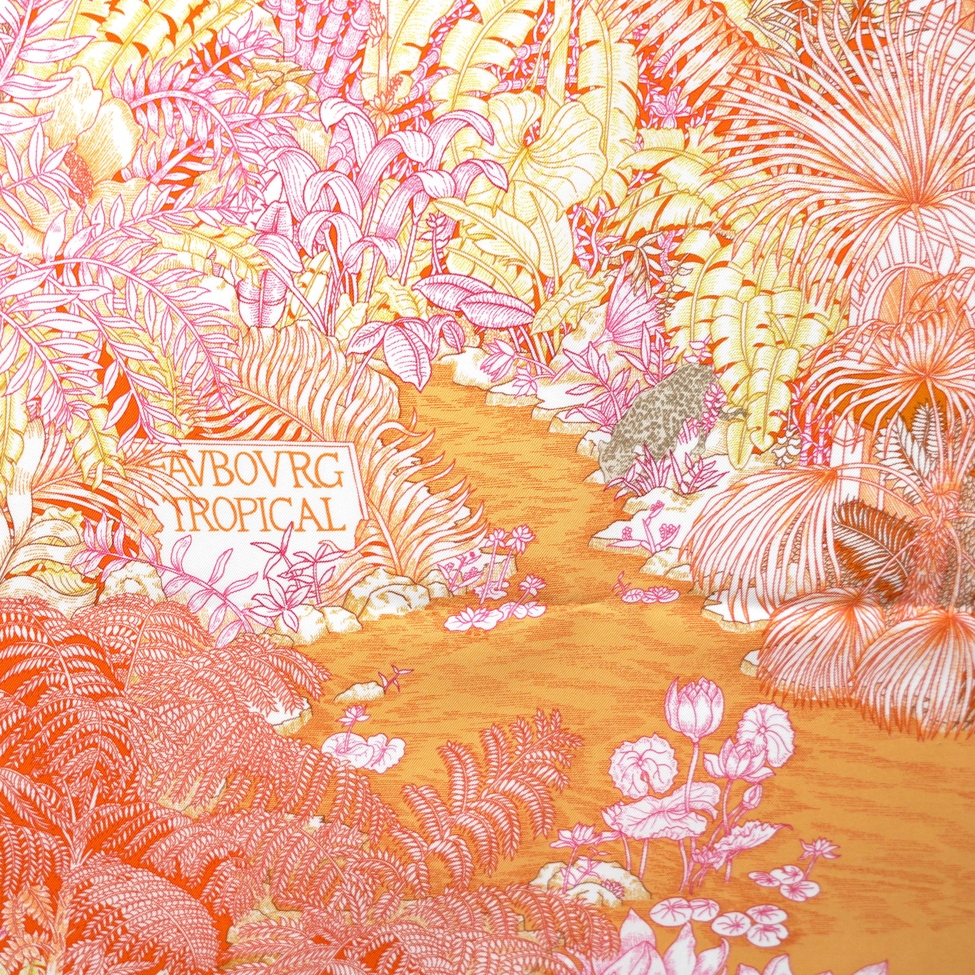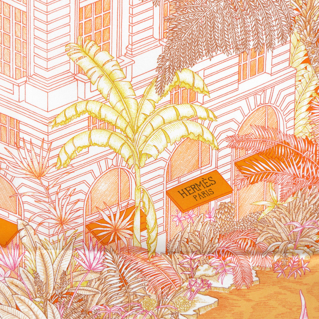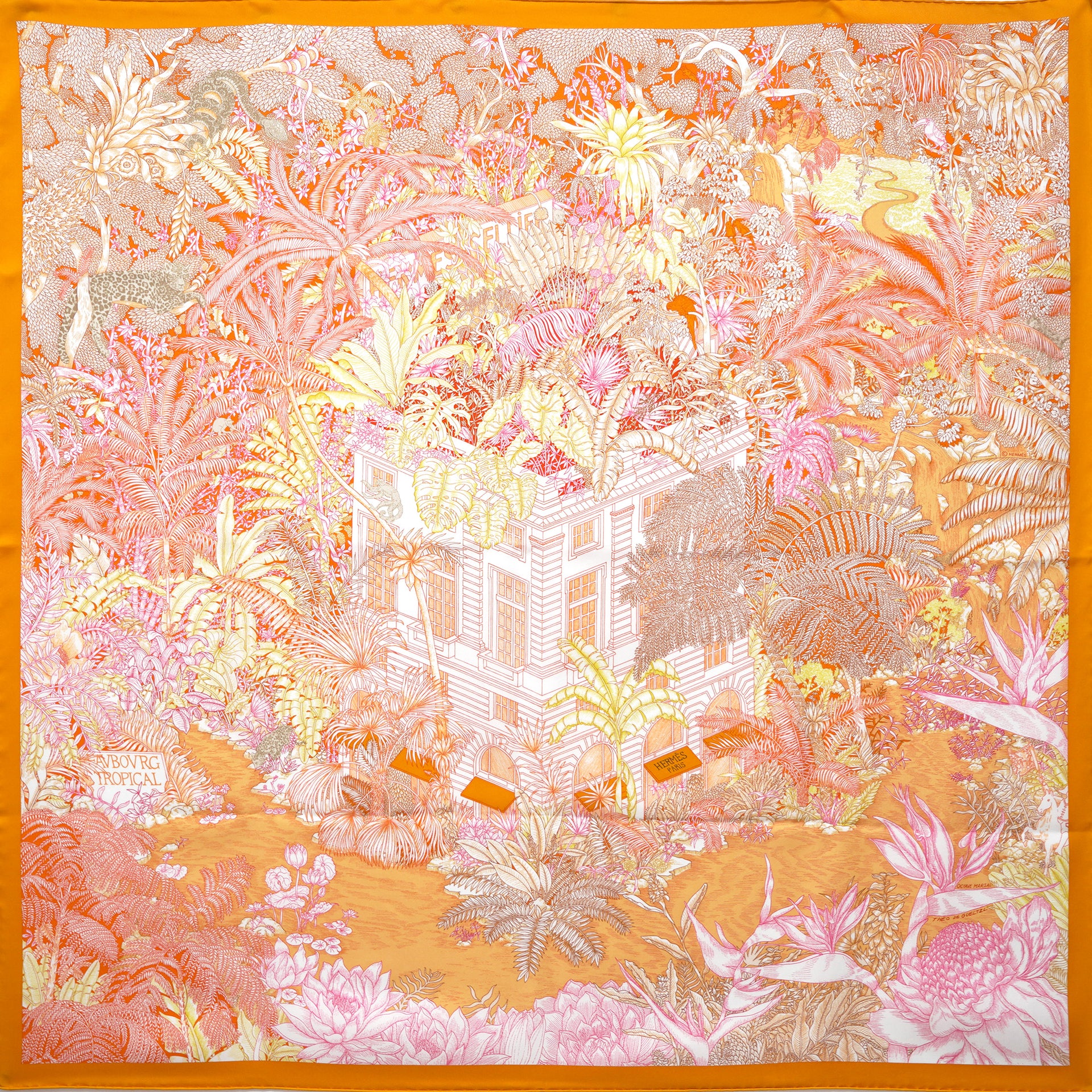 | The first Hermès store opened at 24 Faubourg Saint-Honoré in Paris in 1880, in a building of modest dimensions that also housed saddlery workshops and private apartments. The current neoclassical façade is the result of audacious building work carried out between 1924 and 1926, extending upwards to create additional floors and a surprising roof terrace. It is from this terrace that the exuberant tropical forest designed by the duo of Octave Marsal and Théo de Gueltzl appears to unfurl. Cheetahs, monkeys and cockatoos blend into this botanical canopy, which also conceals the unexpected figure of the mounted cavalry man from the top of Faubourg Saint-Honoré, who has escaped to the jungle. |
