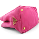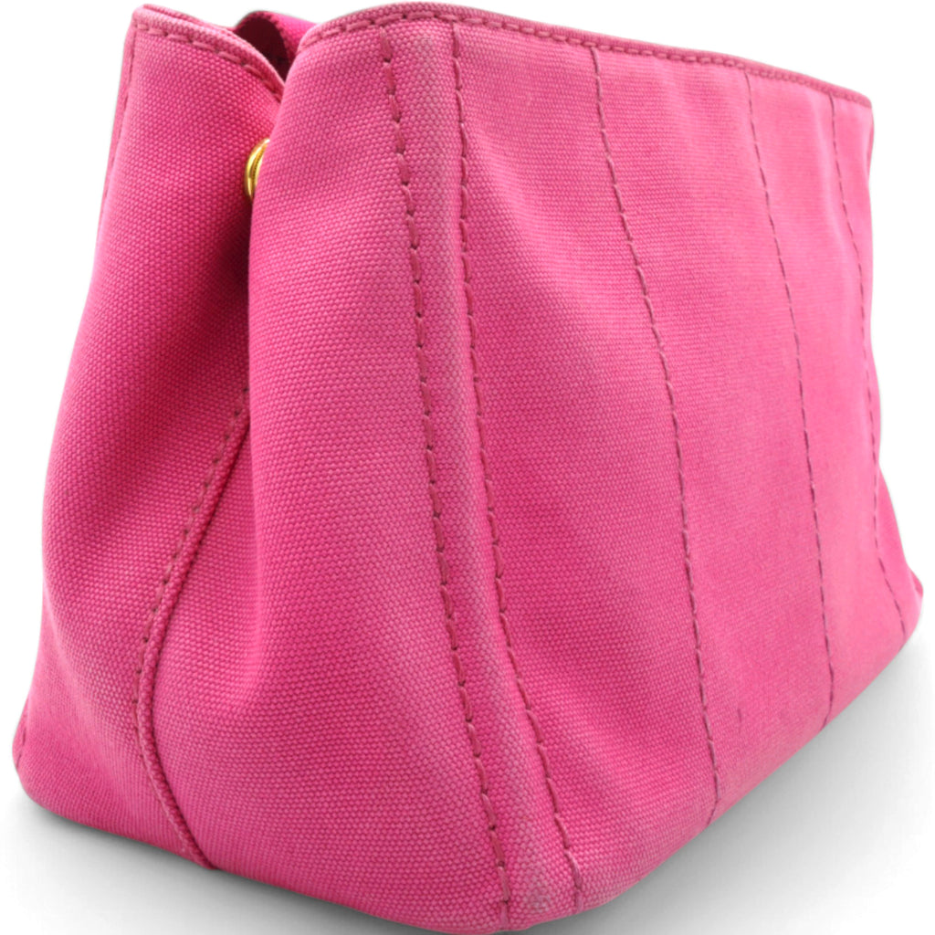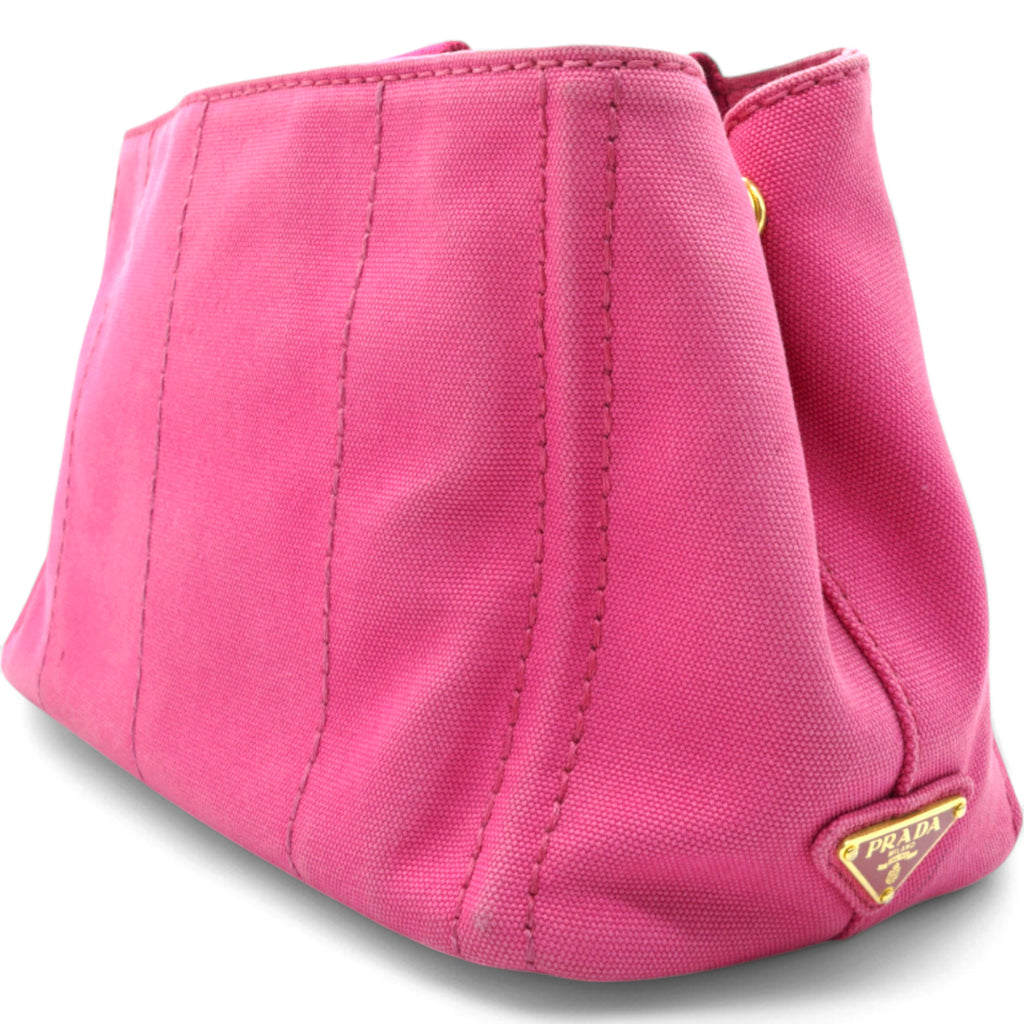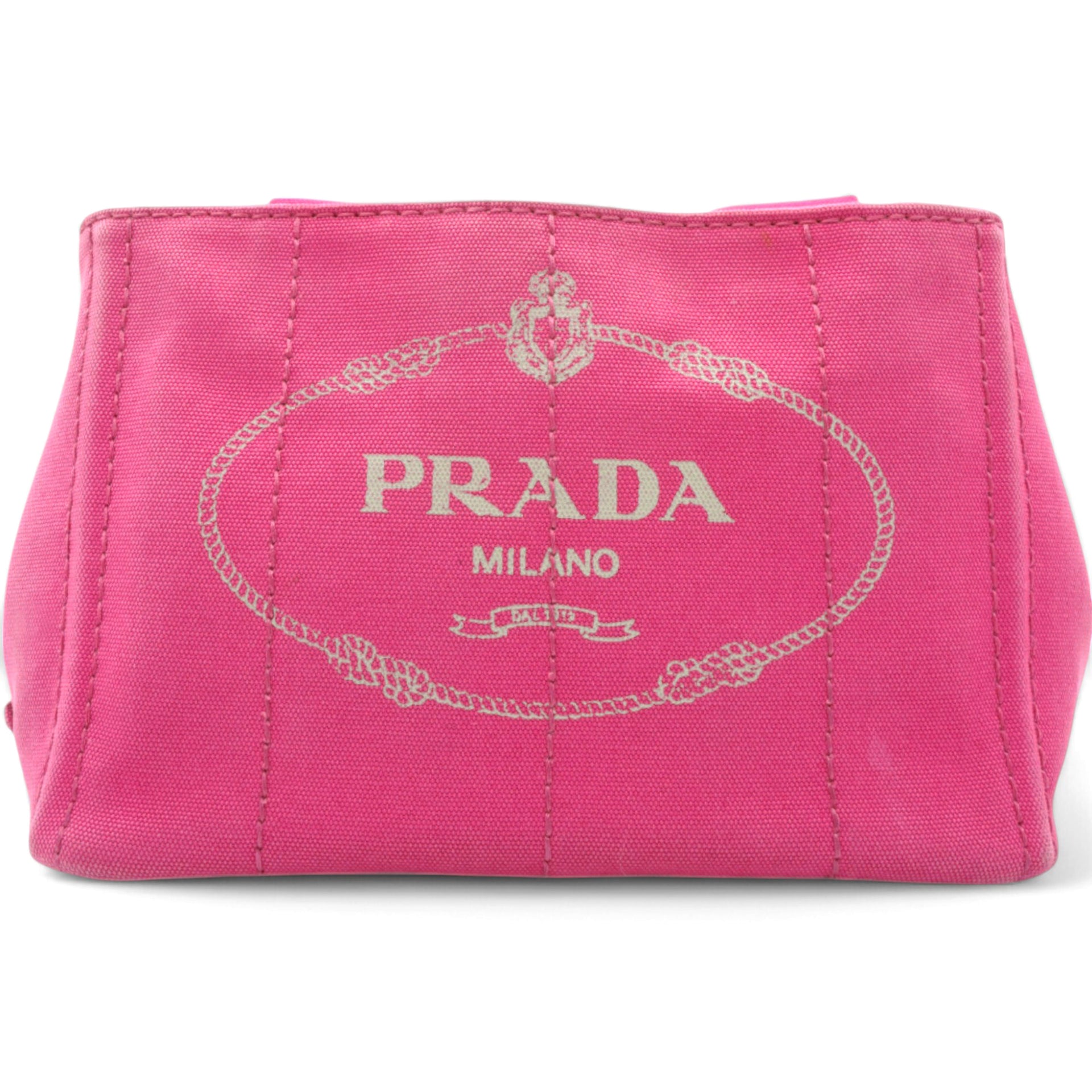 | This stylish tote is crafted of thick sturdy pink canvas with a large ivory Prada logo on the front. It features top handles and polished brass hardware. The top is open to a pink fabric interior with zipper and patch pockets. |