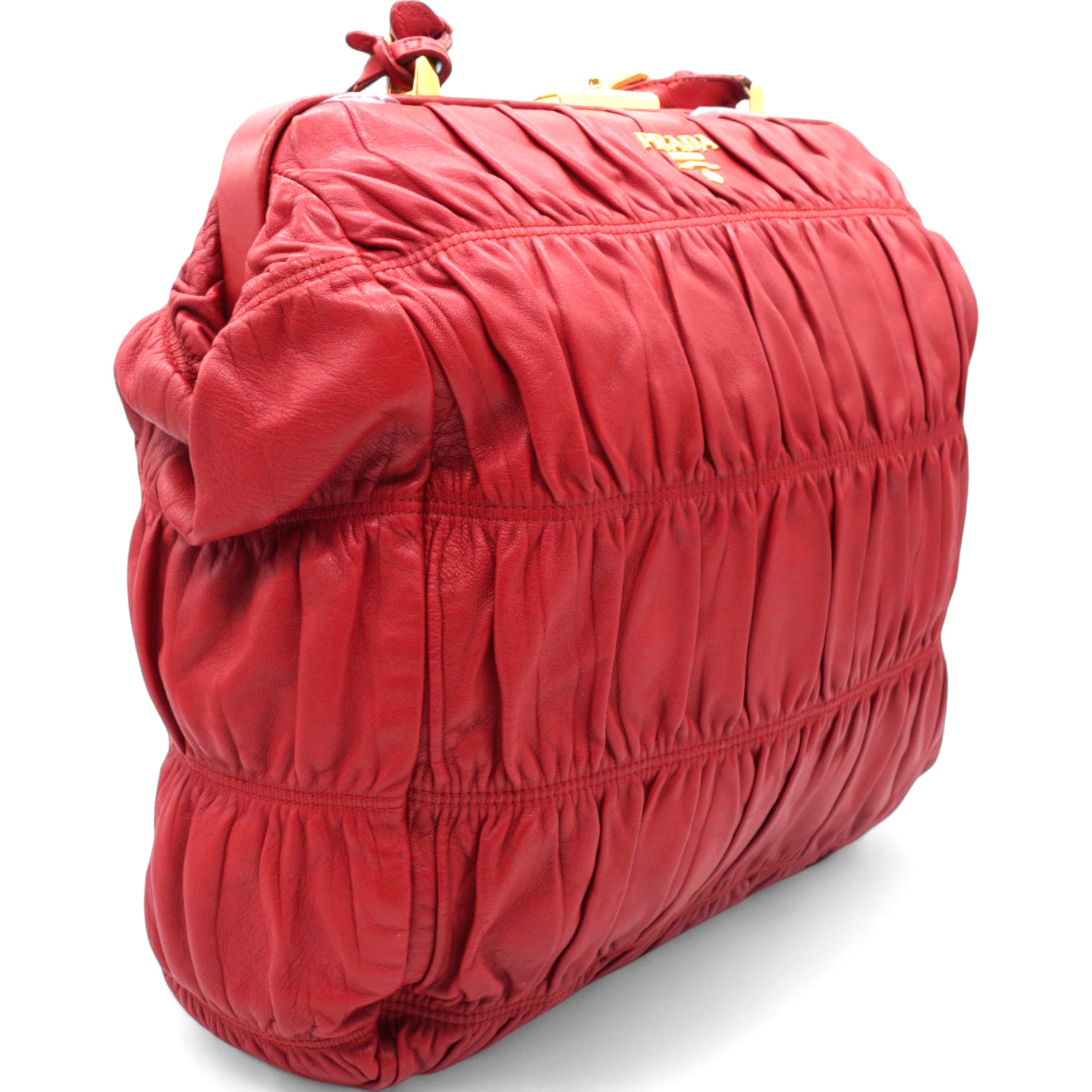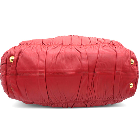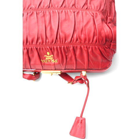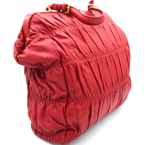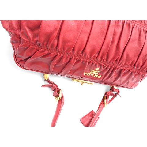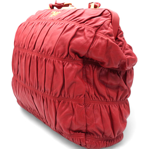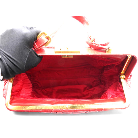 | The Prada Nappa Gaufre Dressy Frame Bag is a sophisticated accessory crafted from luxurious red leather. Featuring gold-tone hardware, this top-handle bag exudes elegance and timeless style. Its flat handle offers comfort and ease of carrying, while the logo jacquard lining adds a touch of refinement. Inside, a single interior pocket provides convenient organization for your essentials. Perfect for both day and evening, this bag effortlessly combines functionality with high-fashion appeal. |