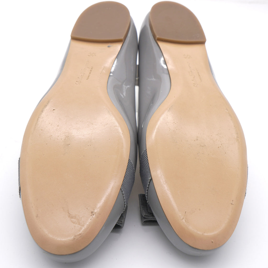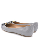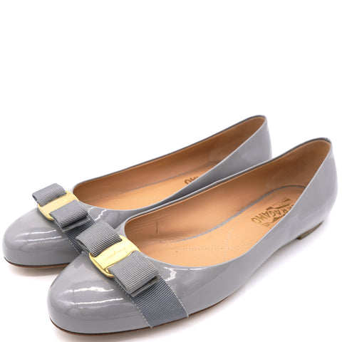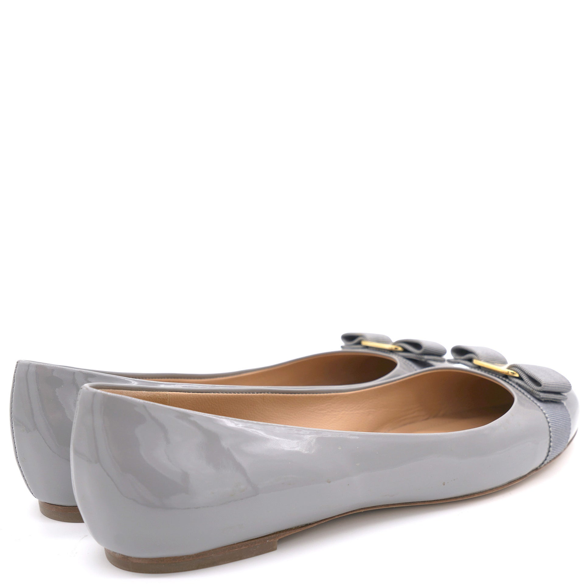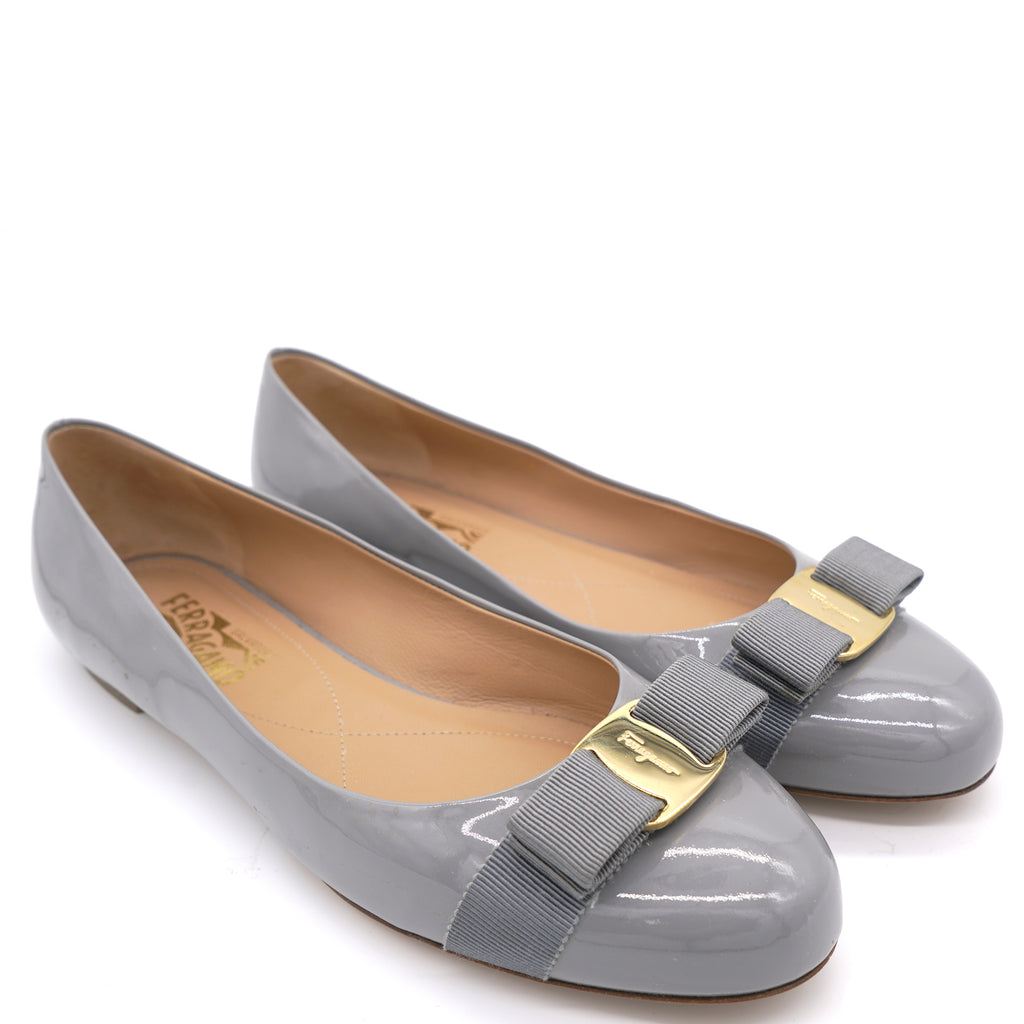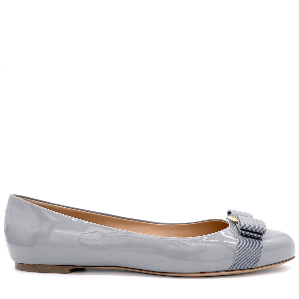 | A glam up version of the refined ballet flat in patent leather. The delicate grey shade makes this the perfect shoe for elegant looks or to add a feminine touch to daywear. The Vara grosgrain bow with golden metal plate and engraved logo decorates the rounded tip. |