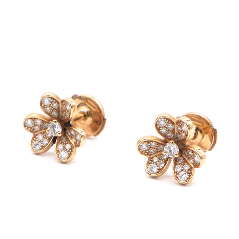 | Like so many flowers dancing in the breeze, the Frivole® creations by Van Cleef & Arpels stand out with their graphic and airy aesthetic. Mirror-polished 18K gold or diamonds bestow a singular radiance upon heart-shaped petals. The earrings are crafted of 18 karat rose gold and feature flower motif studs pave-set with round brilliant cut diamonds, approximately .42 total carat weight. |
