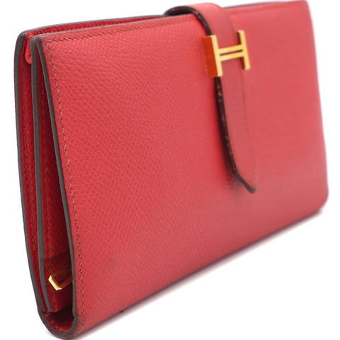 This authentic Hermes Bearn Wallet Long is your perfect small accessory. Crafted from epsom red leather featuring it’s silver-plated 'H' tab closure and silver-tone hardware accents. Its matching green leather-lined interior showcases multiple card slots, patch and zip pockets perfect for storing bills, coins and cards. A timeless investment piece for any fashionista.