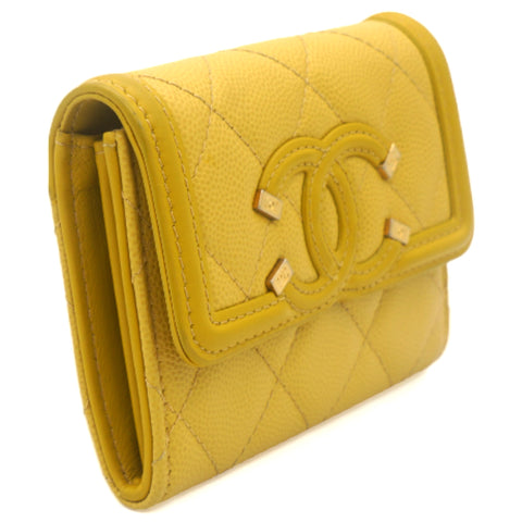 | This stylish wallet is crafted of beautiful diamond quilted caviar leather in yellow features a large Chanel CC stitched logo on the flap with light gold tips. The wallet opens to a partitioned yellow fabric interior three card slots |
