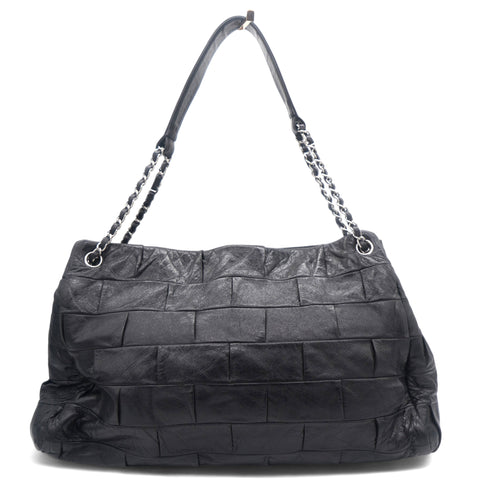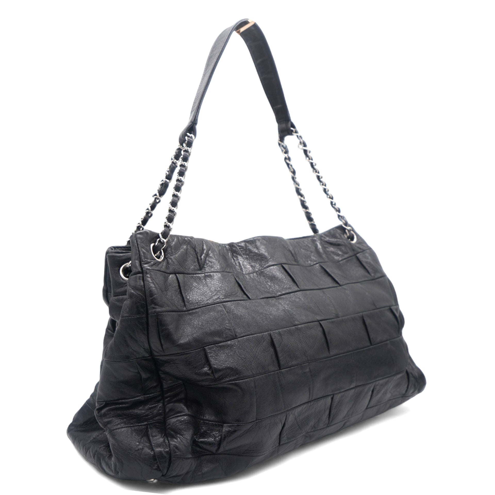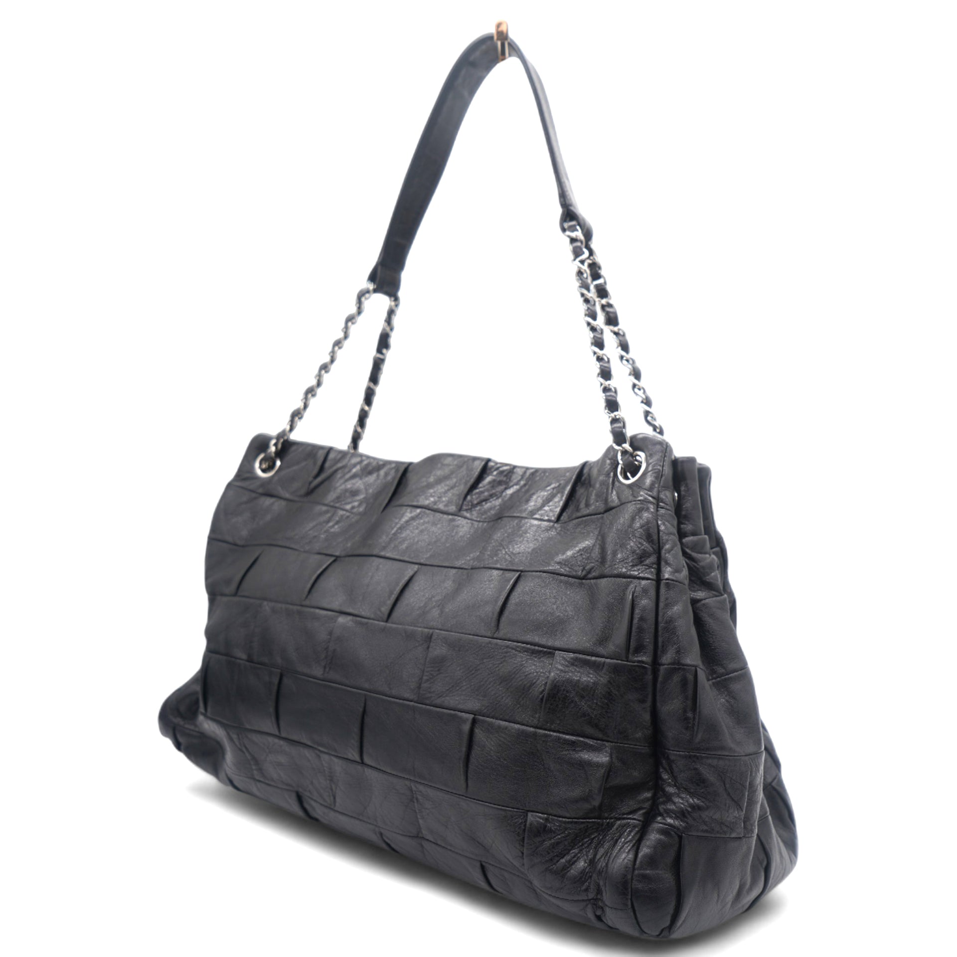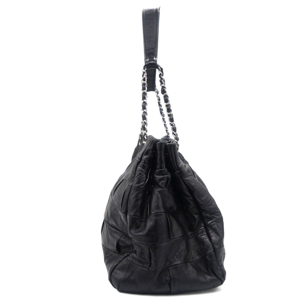 | Black leather Chanel Igloo Accordion tote with silver-tone hardware, chain link shoulder strap, grey satin lining, dual interior compartments; one featuring one slit pocket and one zip pocket and turn-lock closure at front face. |