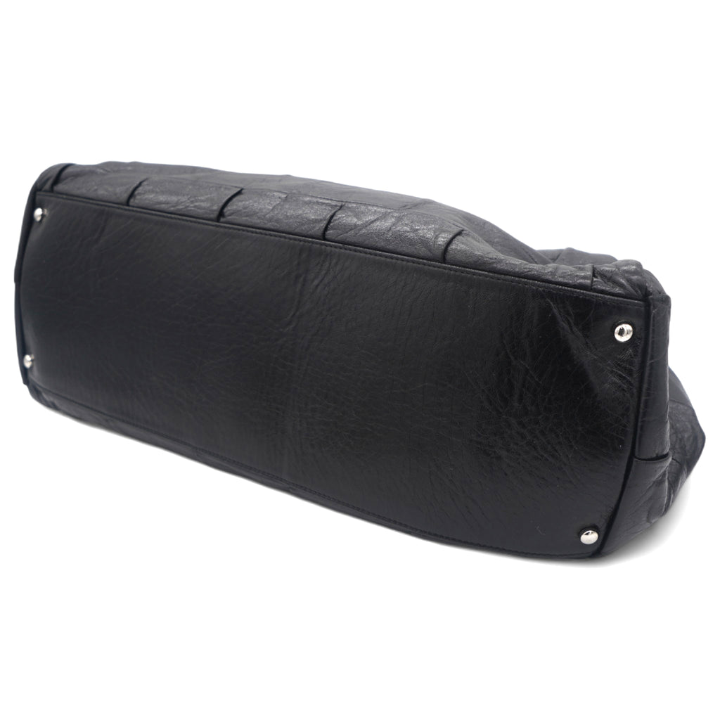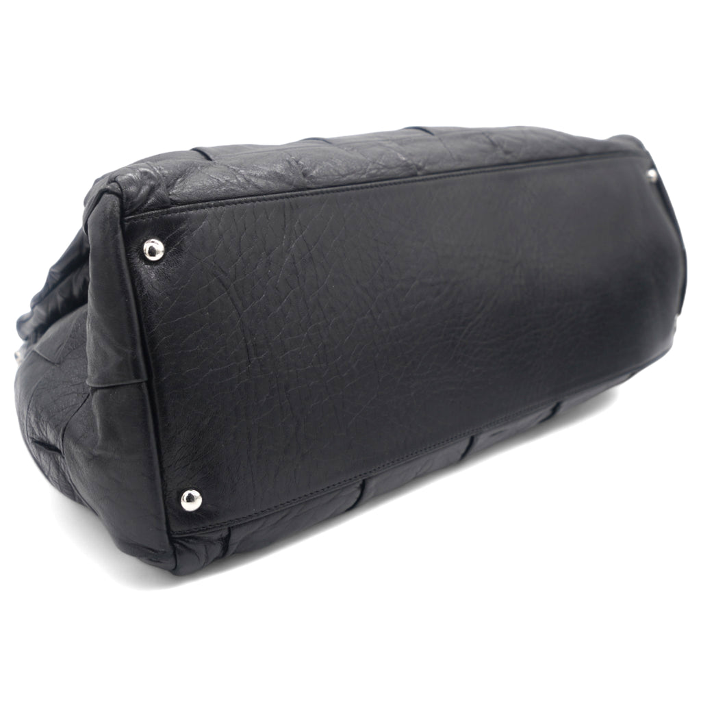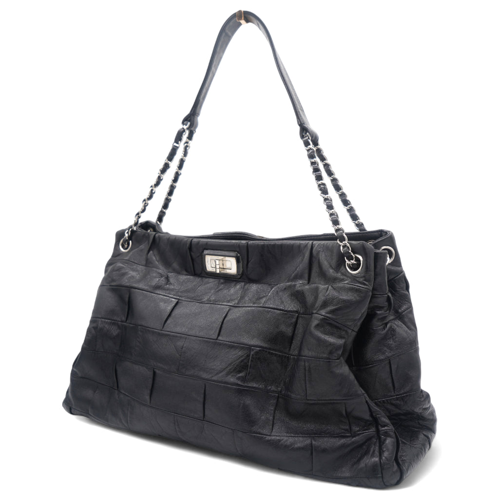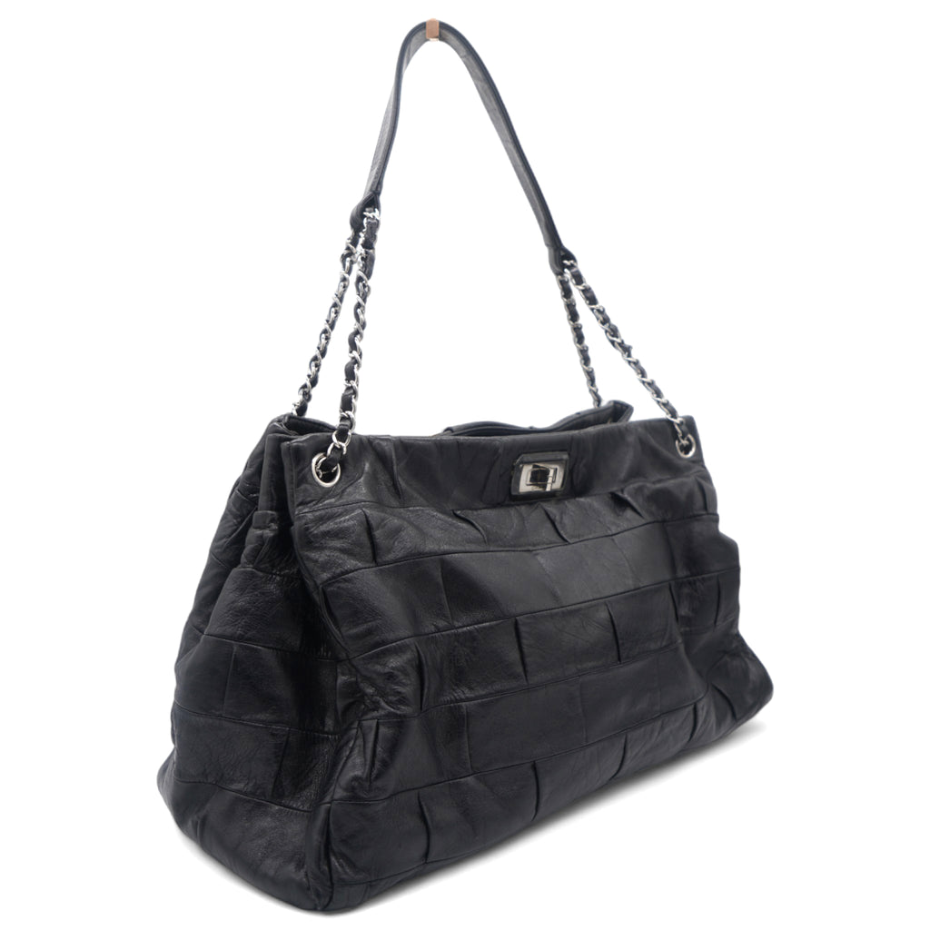 | Black leather Chanel Igloo Accordion tote with silver-tone hardware, chain link shoulder strap, grey satin lining, dual interior compartments; one featuring one slit pocket and one zip pocket and turn-lock closure at front face. |