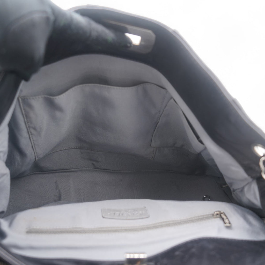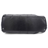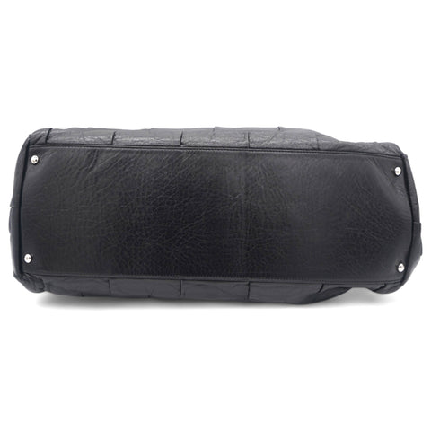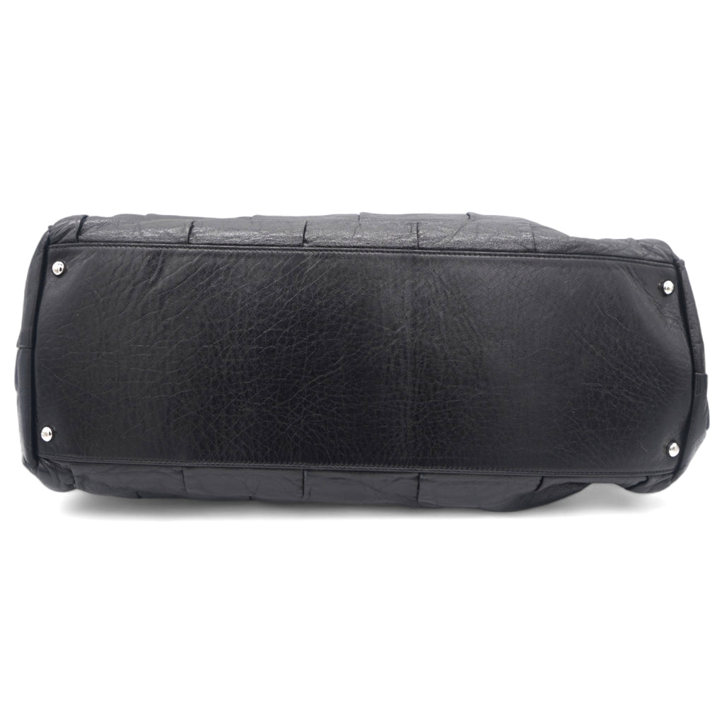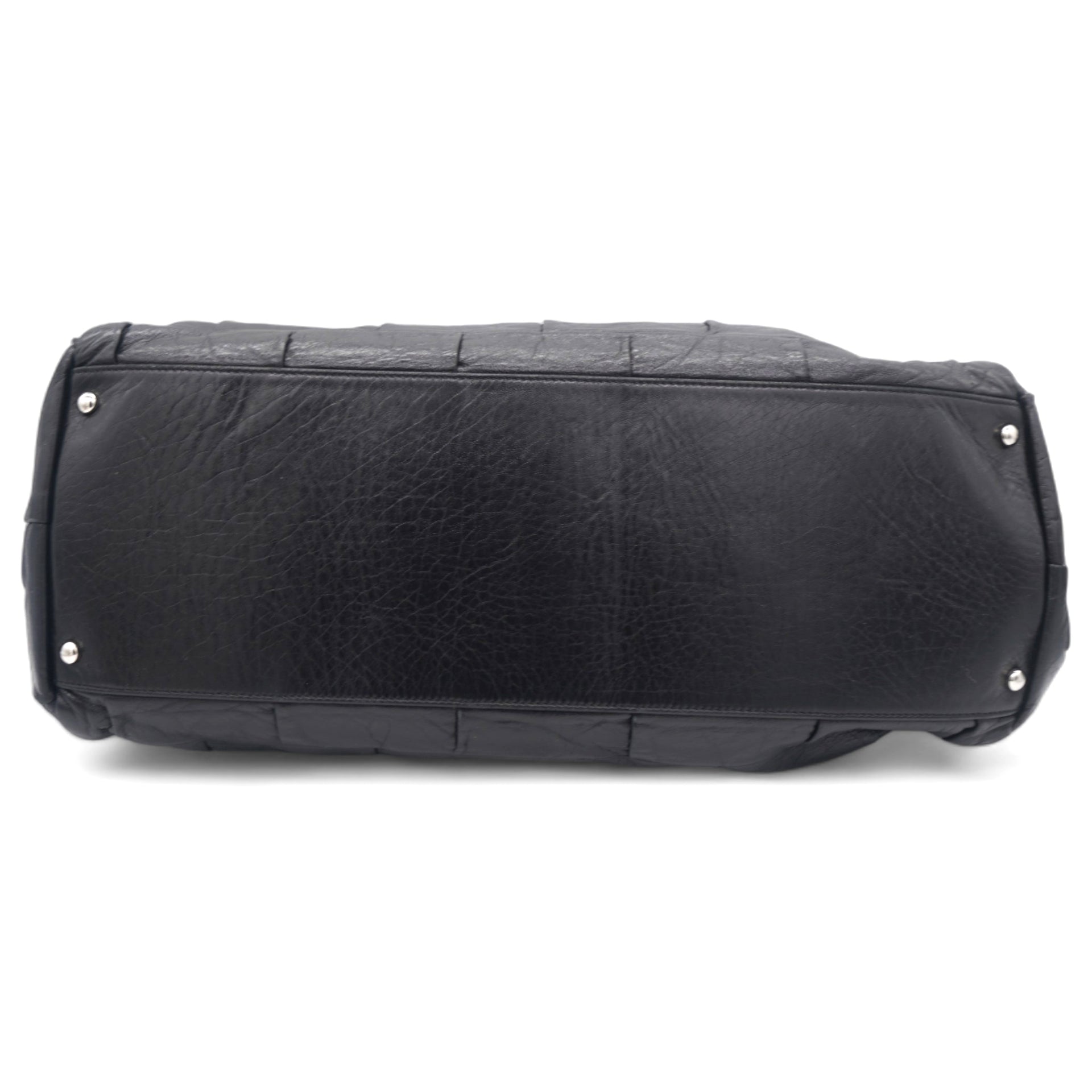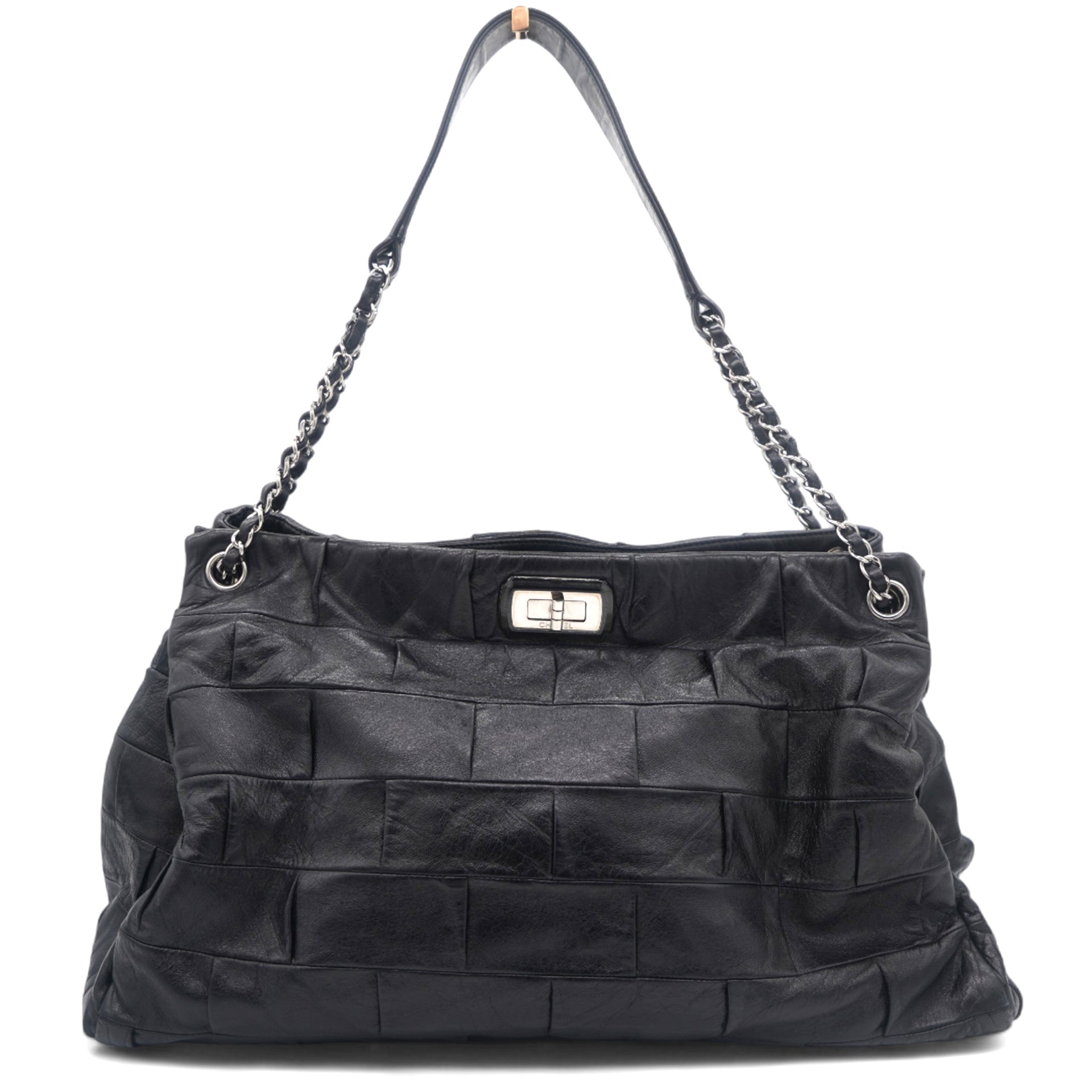 | Black leather Chanel Igloo Accordion tote with silver-tone hardware, chain link shoulder strap, grey satin lining, dual interior compartments; one featuring one slit pocket and one zip pocket and turn-lock closure at front face. |