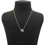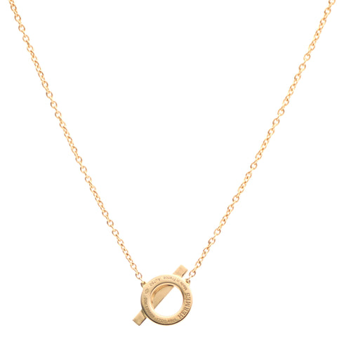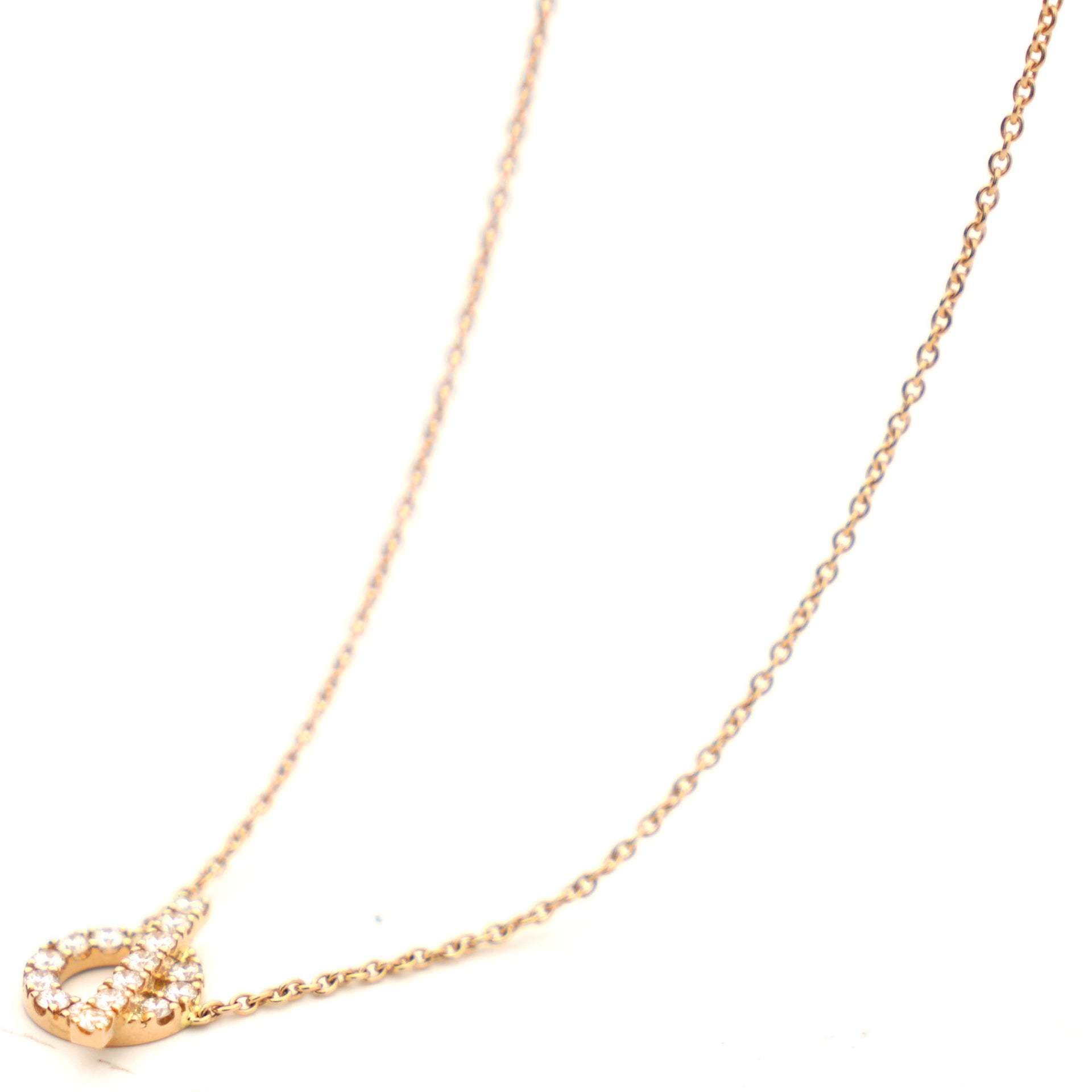 The necklace is crafted of 18 Karat rose gold and features a bar and ring motif pendant set with round brilliant cut diamonds, approximately .25 total carat weight.