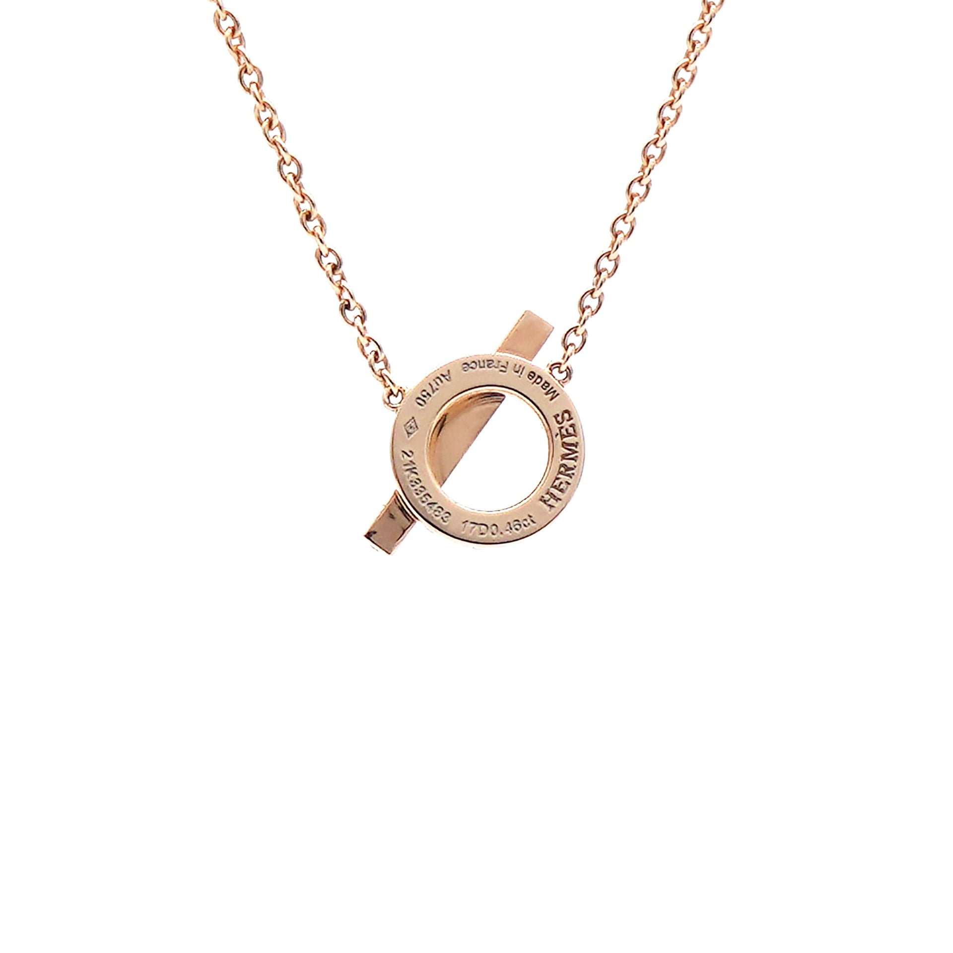 The necklace is crafted of 18 karat rose gold and features a bar and ring motif pendant set with sparkling round brilliant cut diamonds, weighing approximately .46 total carat weight.
