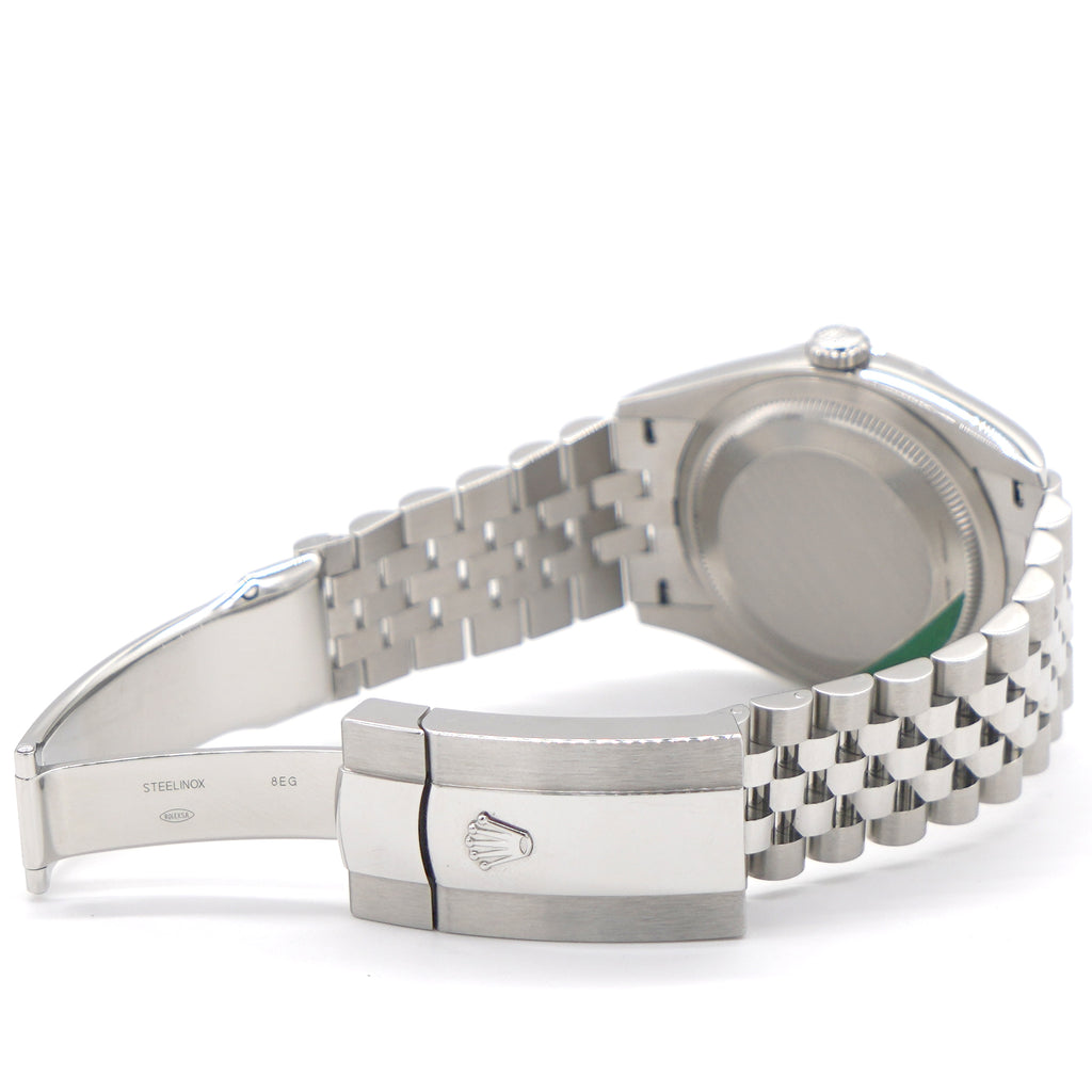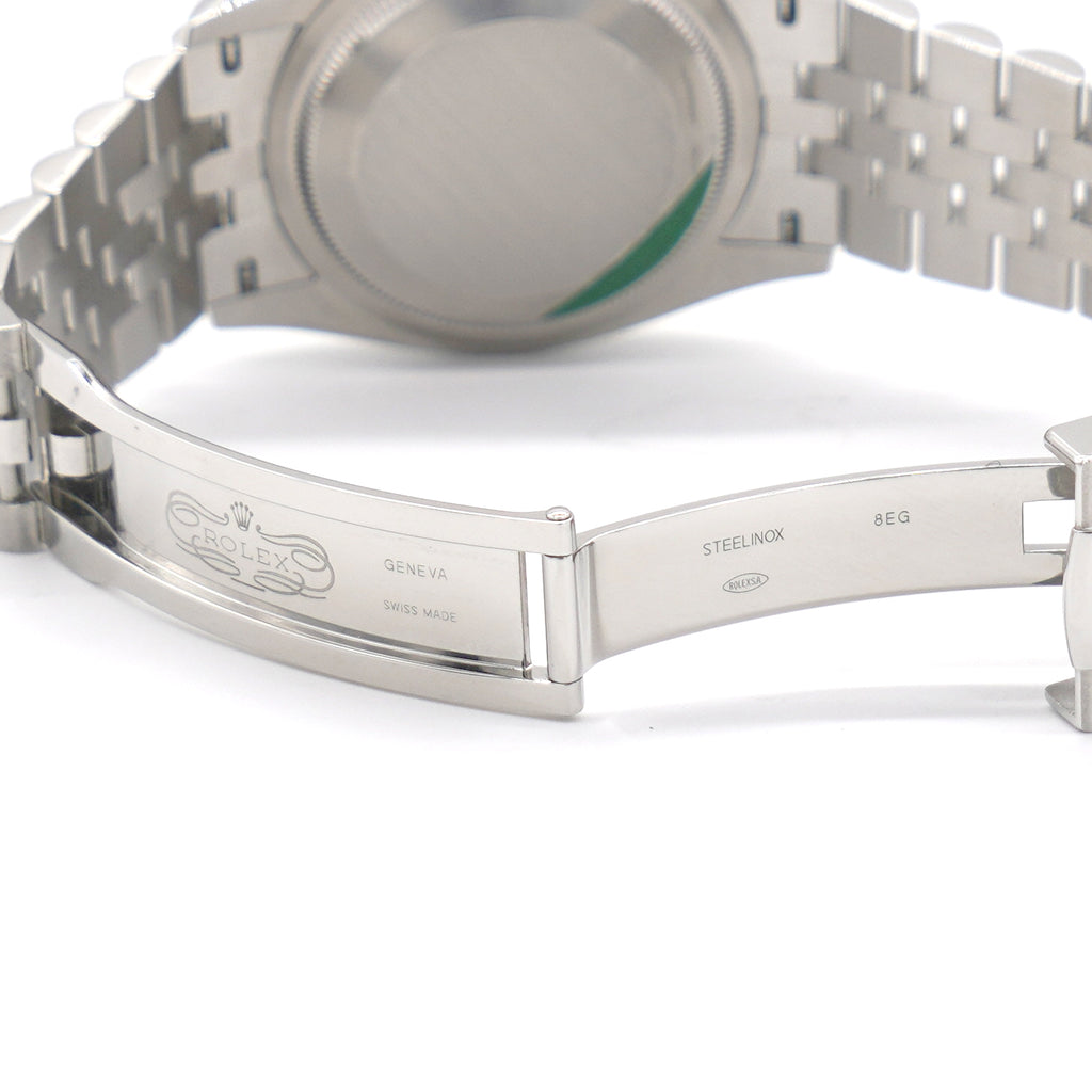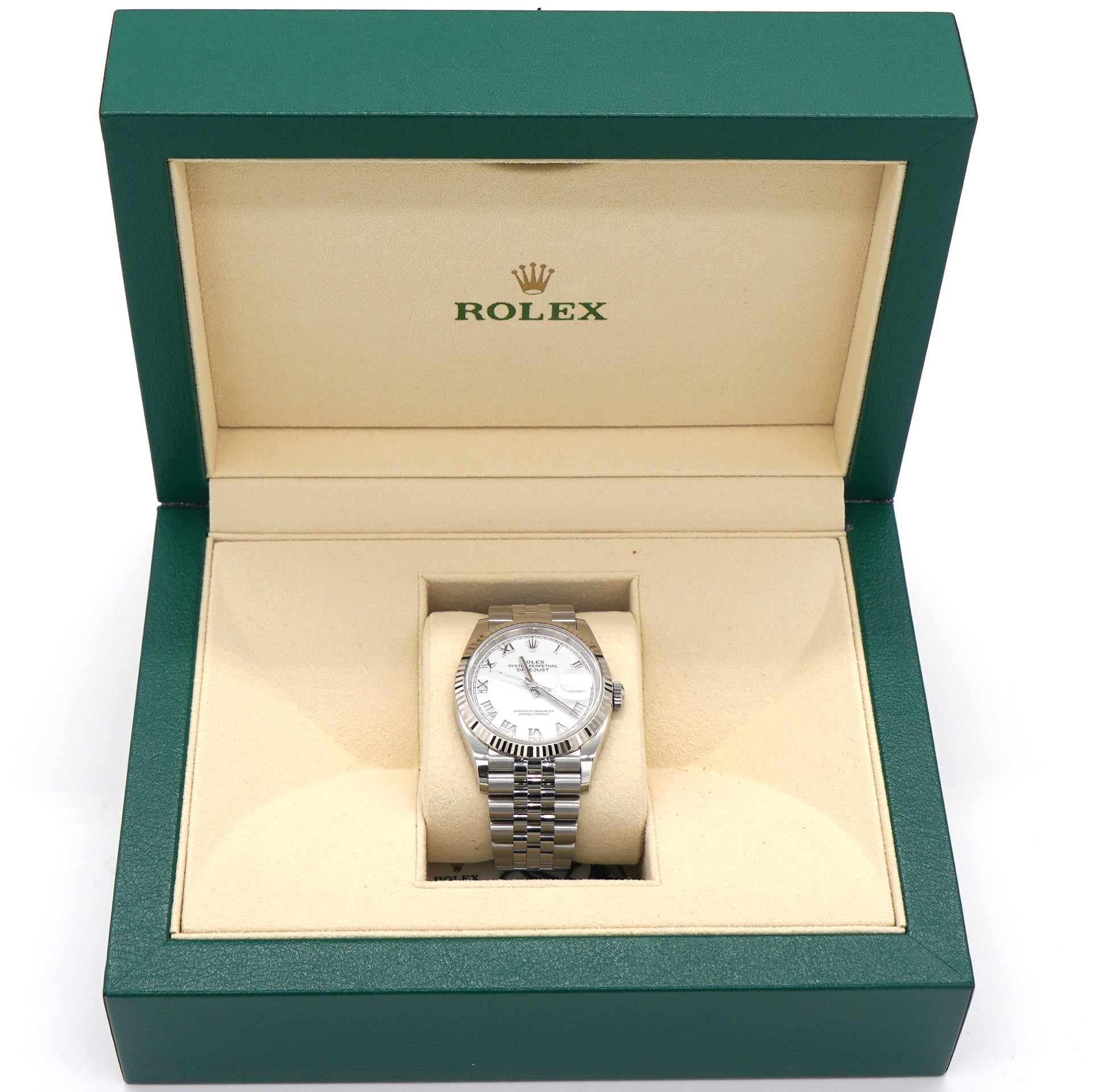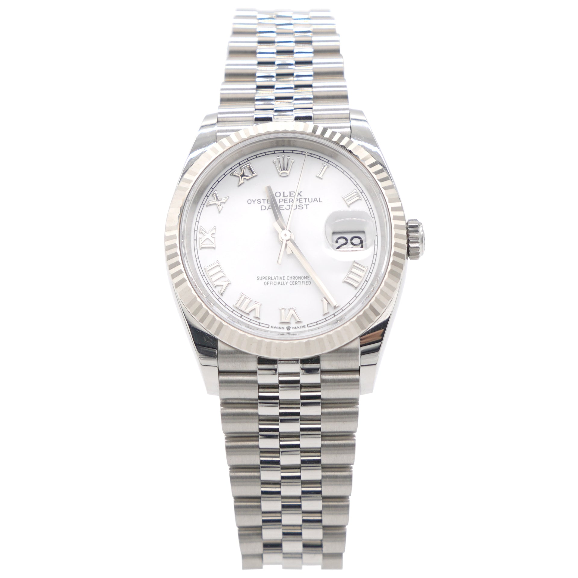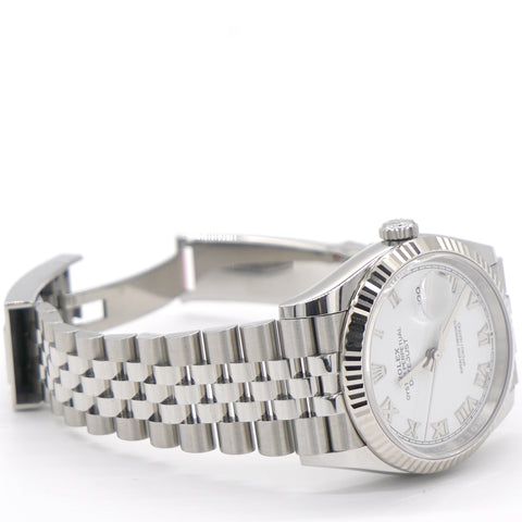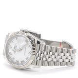 | The light reflections on the case sides and lugs highlight the elegant profile of the 36 mm Oyster case, which is fitted with a fluted bezel. Aesthetically, the Datejust has spanned eras, while retaining the enduring codes that make it, notably in its traditional versions, one of the most recognized and recognizable of watches. Here is in Roman Numeral Mark and white dial. |