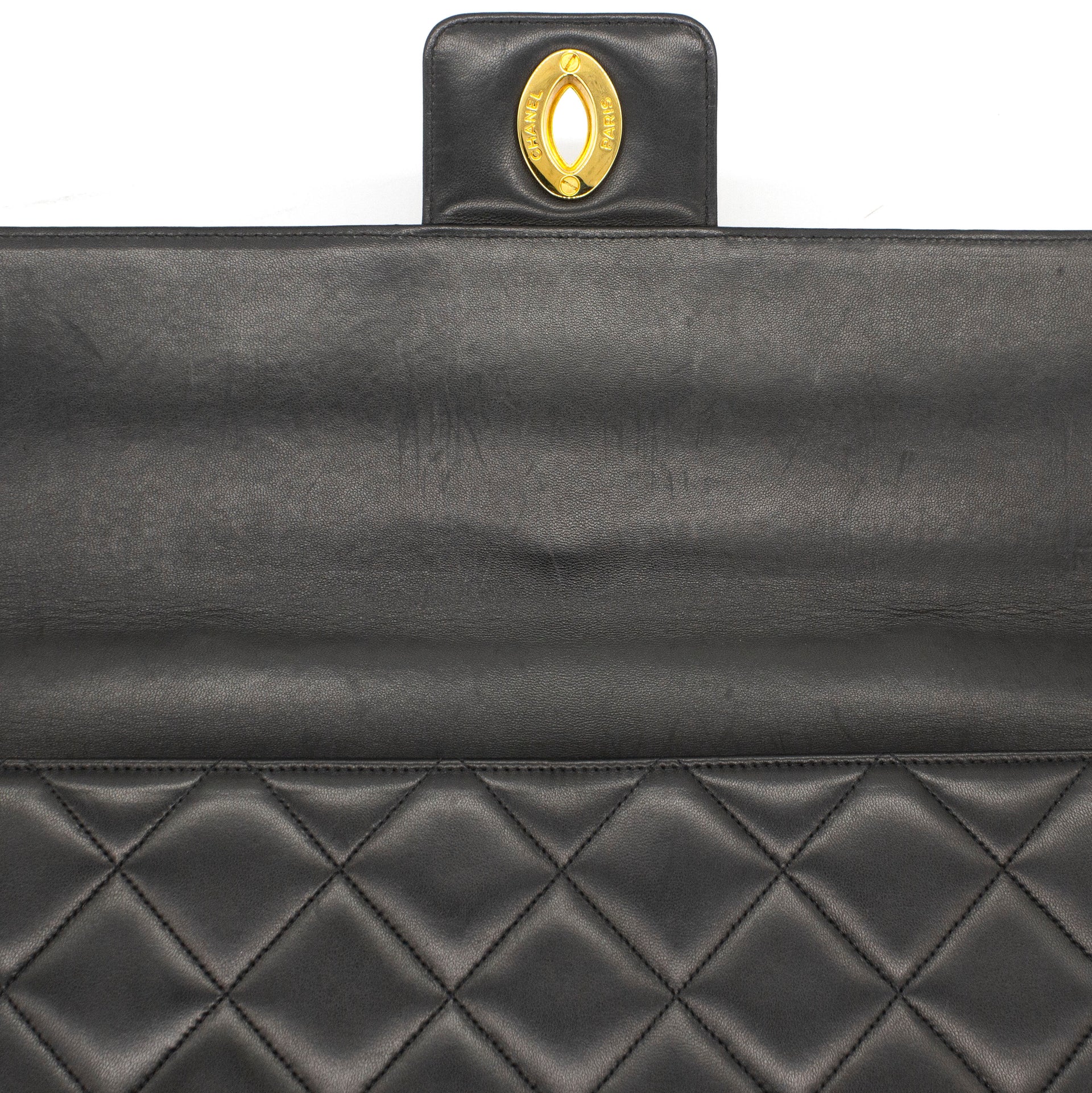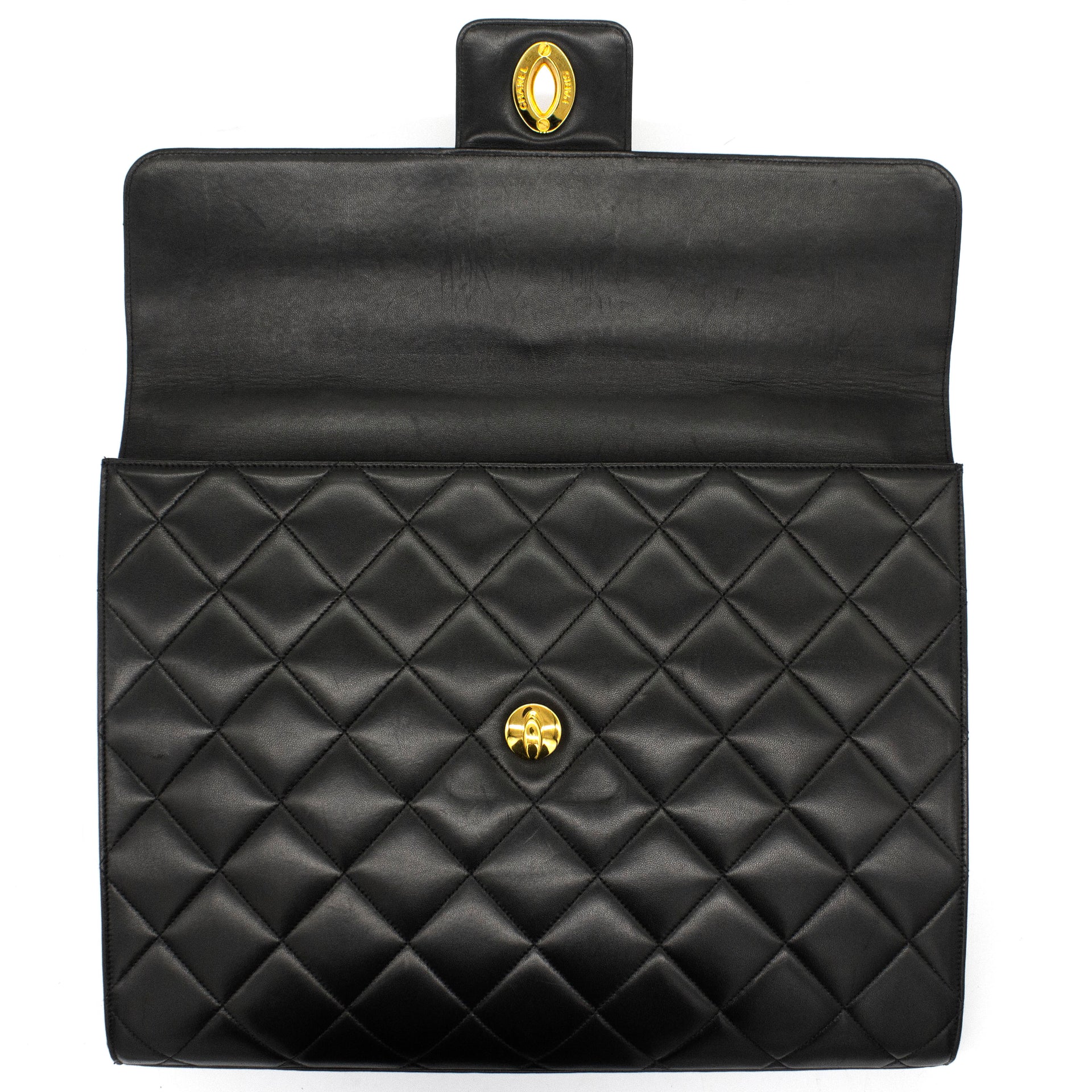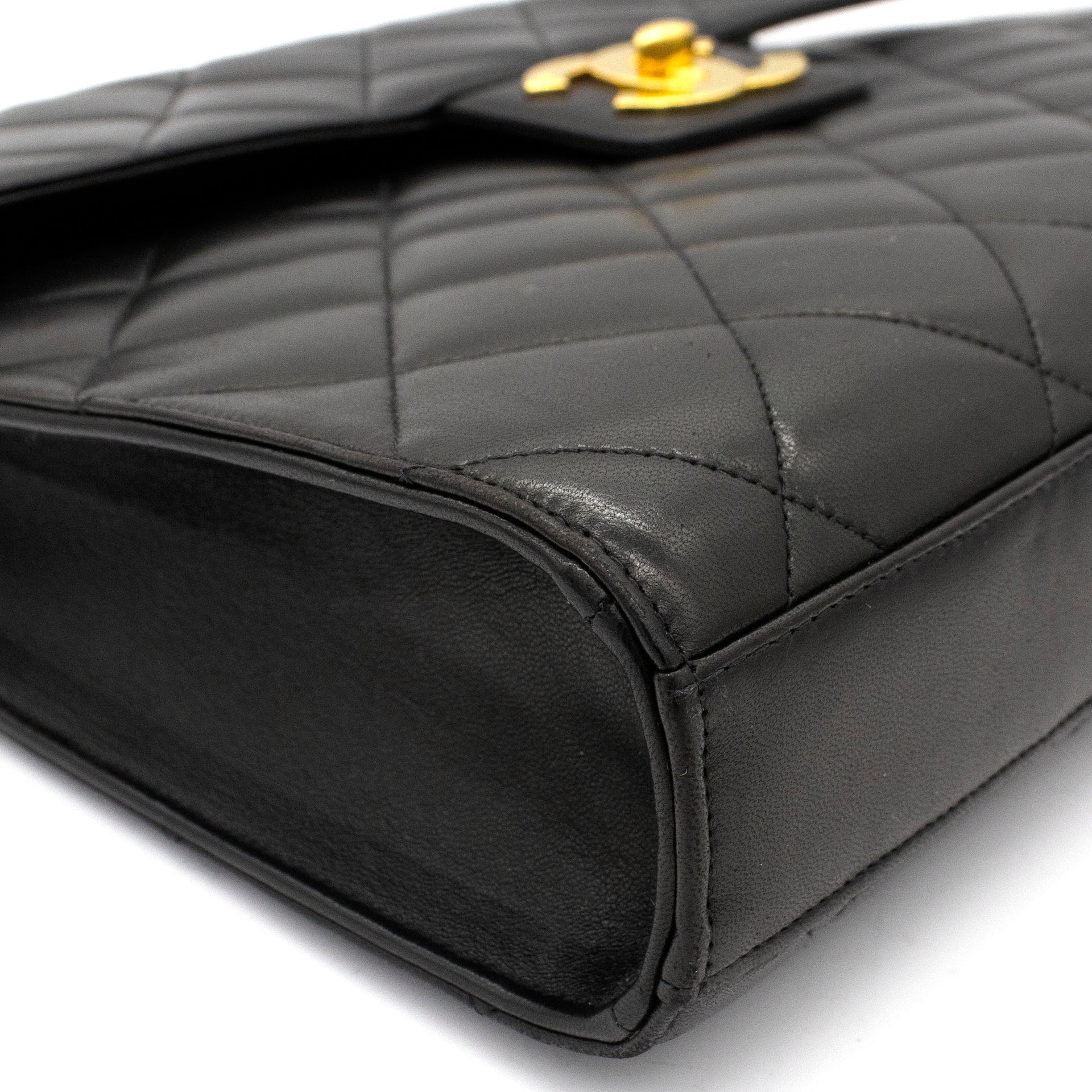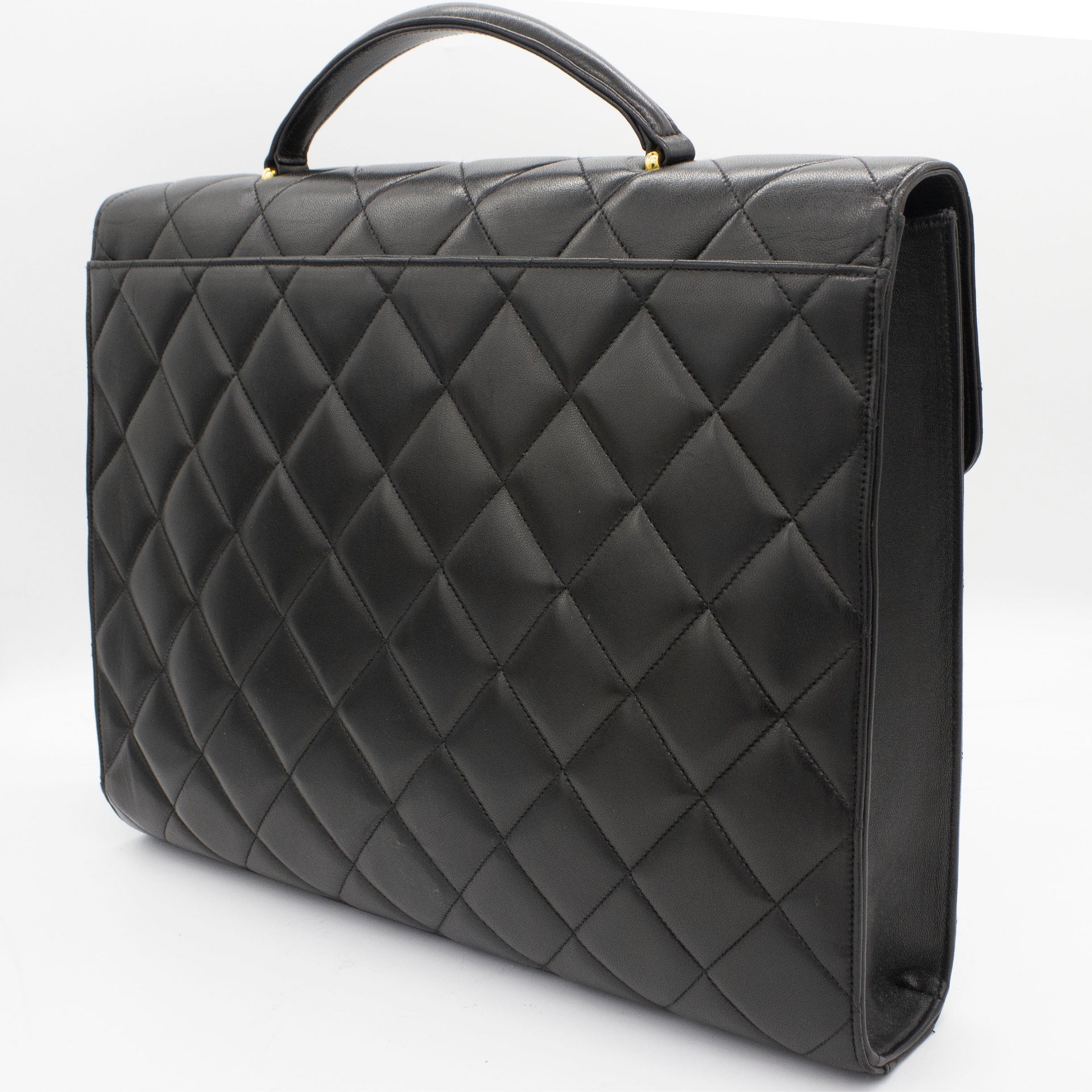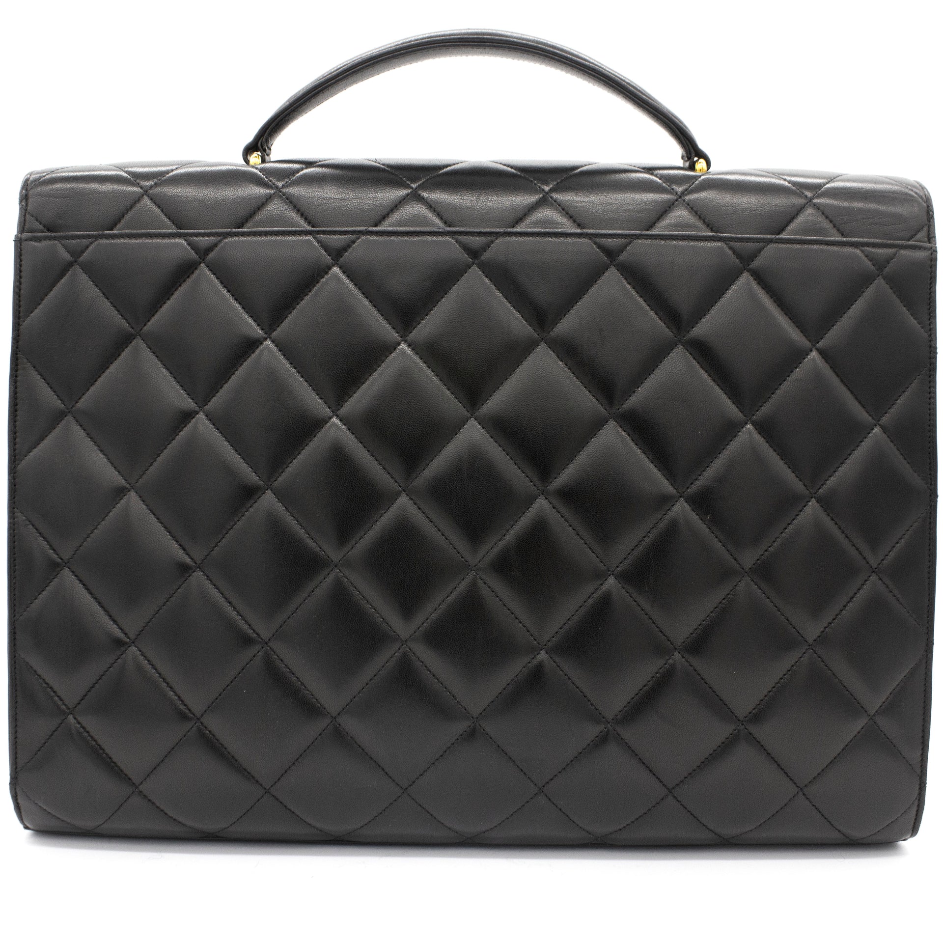 Exterior Material: Black lambskin exterior with gold-tone hardware, single top handle and signature interlocking CC turn-lock fastening. Interior Material: Black leather lining with one main compartment, one interior zipped pocket and one interior slip pocket. Accessories: Chanel Original Dust Bag; Chanel Authentic Card Serial Number: 3780564 Bought Year: 1995 |