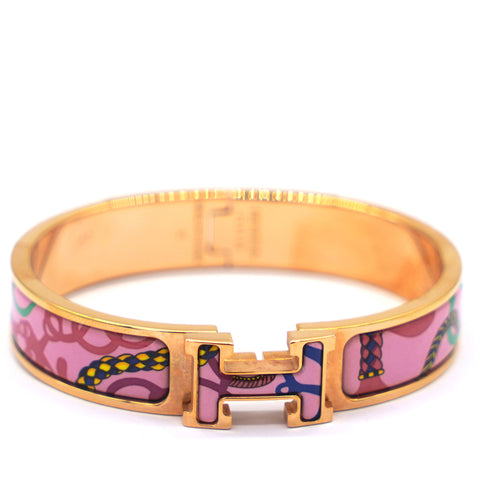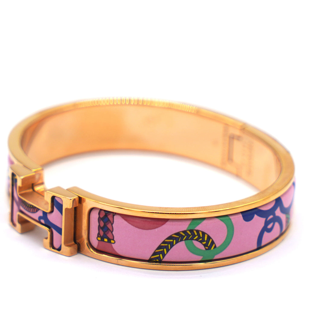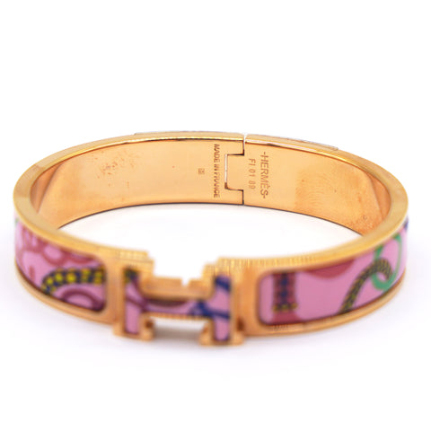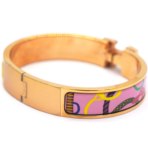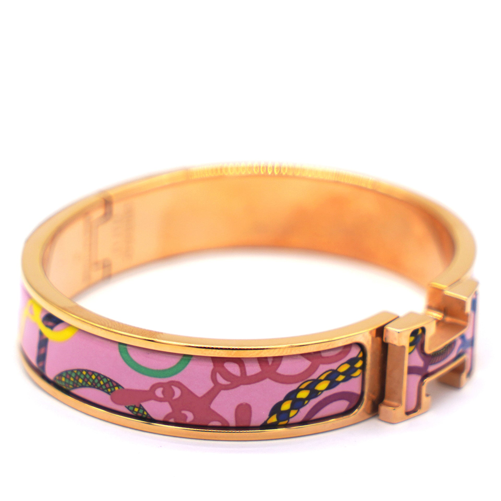 | This is a chic bracelet from Hermes that is classic yet very modern. It is polished rose gold-tone with a hinge on one side and opens with a swivel Hermes "H" on the prominent side. Around the band is a strip of pink-colored enamel inlay with a beautiful design. This band can be worn to add sophistication to casual attire or be worn to complement more formal wear, from Hermes! |