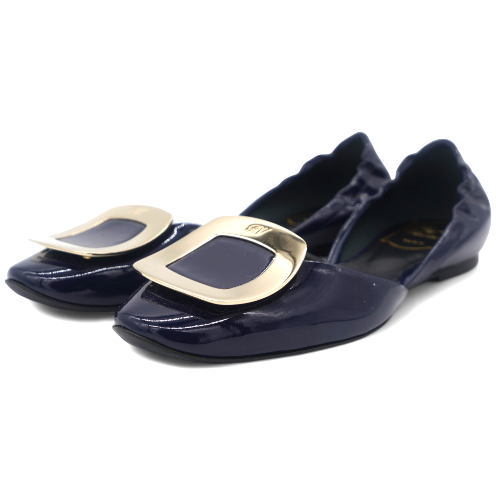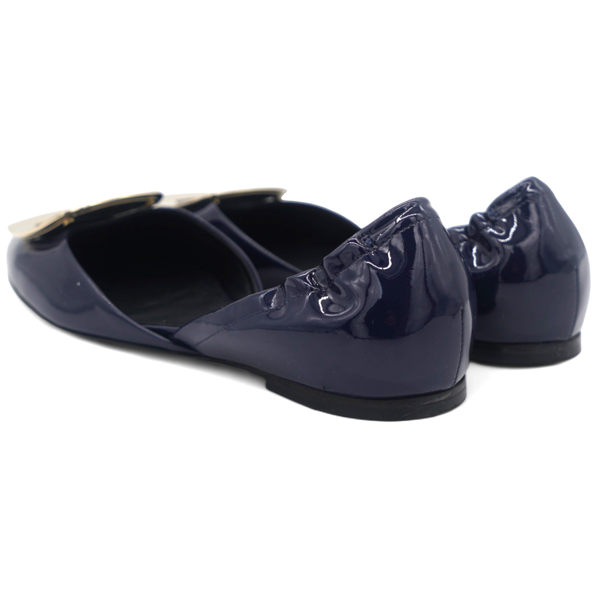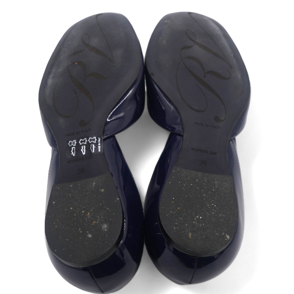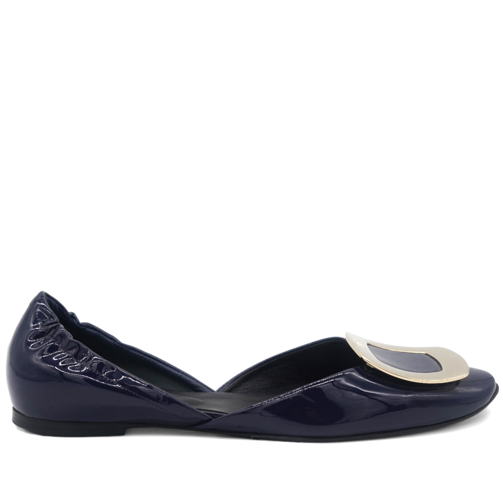 | Introducing Roger Vivier's Navy Patent Chips Ballet Flats - the perfect addition to any wardrobe. These sleek and stylish flats feature a navy patent finish and the signature Chips buckle for added flair. With exceptional quality and craftsmanship, these ballet flats will elevate any look. |