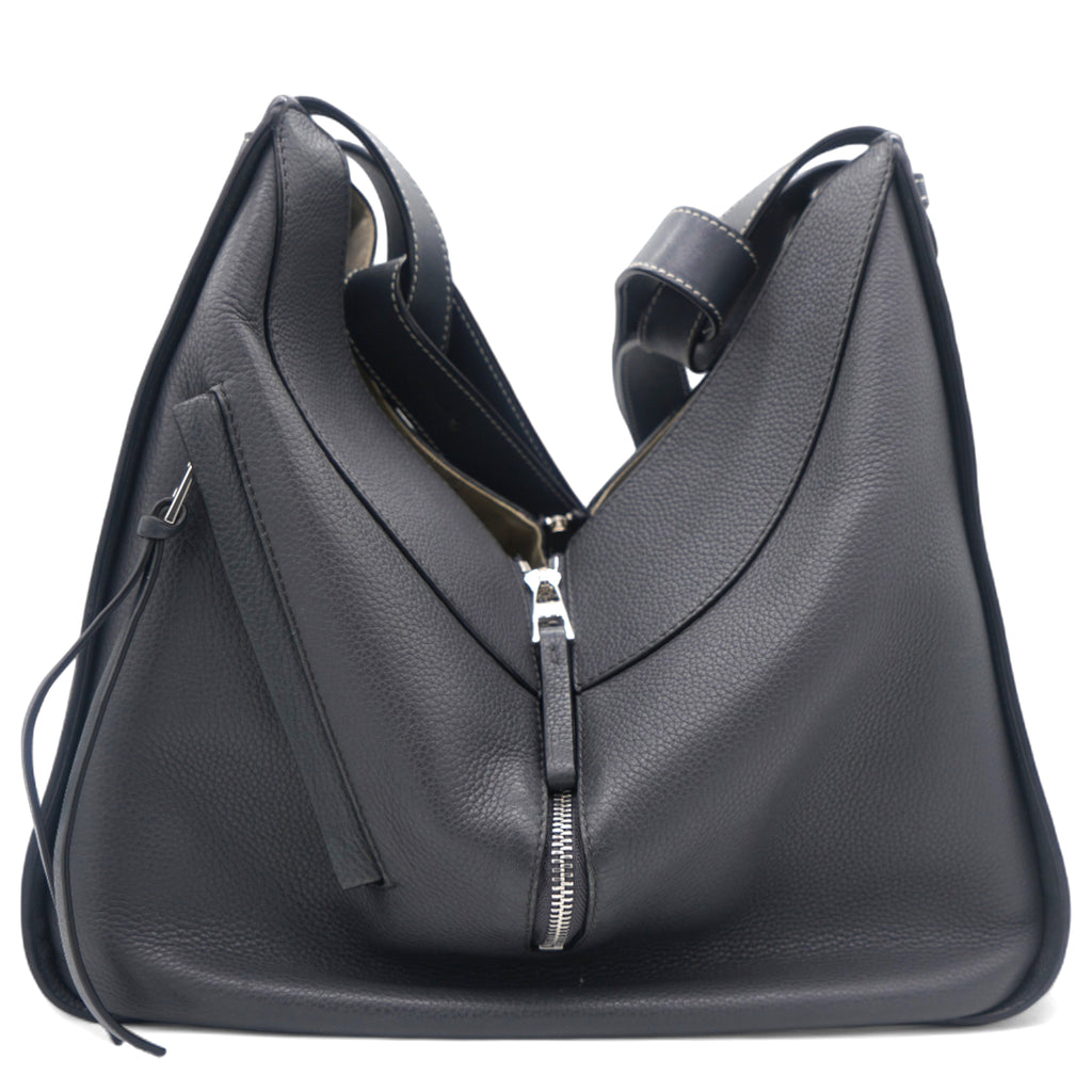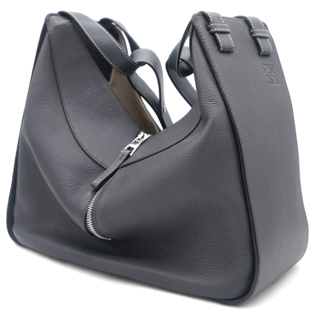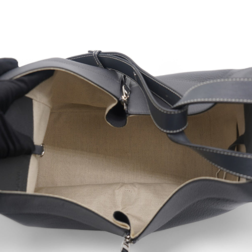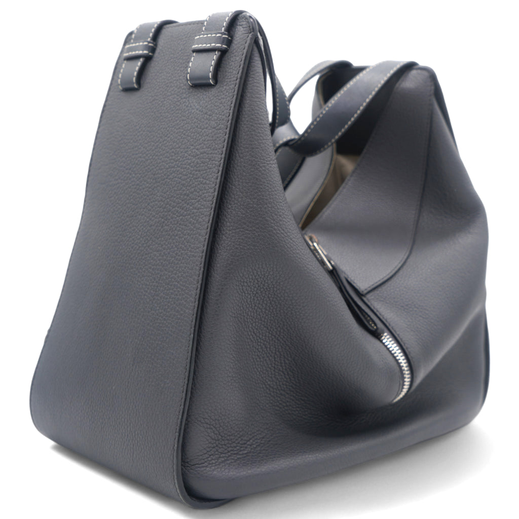 Loewe leather shoulder bag. Interior hook closure. Twin top handles, detachable and adjustable shoulder strap, contrast stitching, zipped sides, silver-toned hardware, external zip pocket and two internal slip pockets, embossed Anagram, herringbone lining.