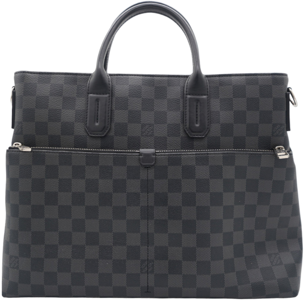 | This shoulder bag is crafted of classic Louis Vuitton Damier Graphite patterned canvas featuring black cowhide rolled leather top handles, two exterior zipper pockets, an adjustable shoulder strap and complimentary silver hardware. A top zipper opens to a black fabric interior with patch pockets. This is the ideal tote bag for everyday use, from Louis Vuitton! |