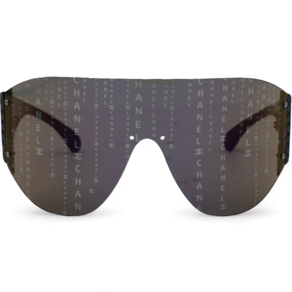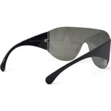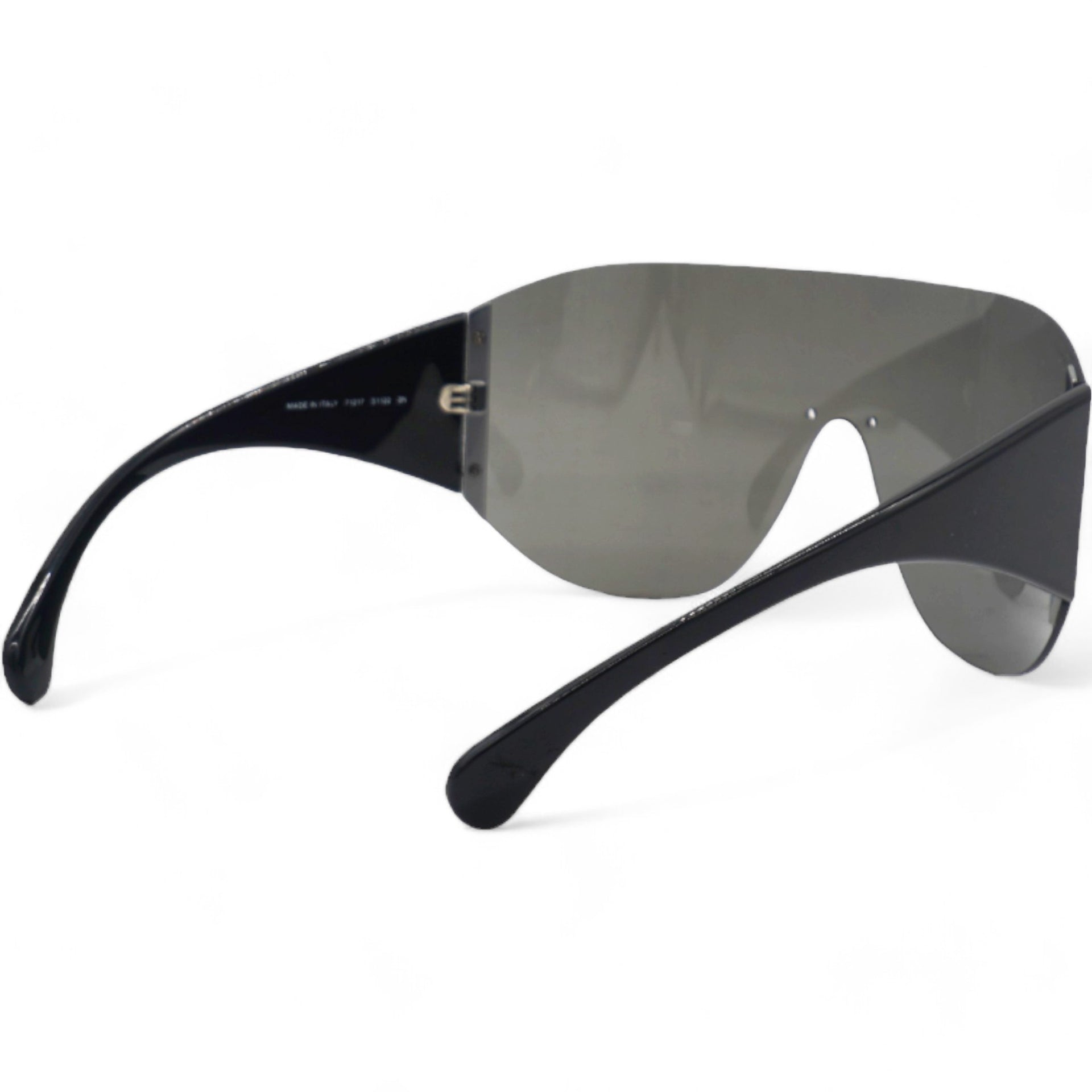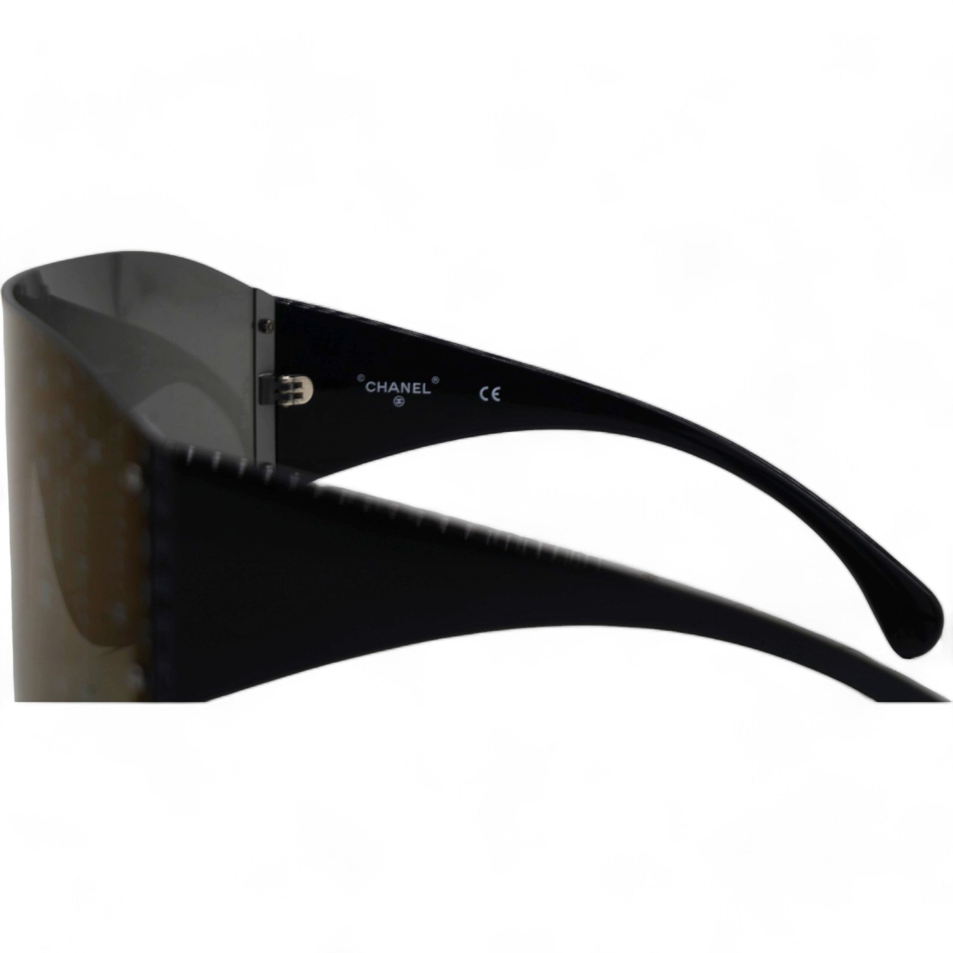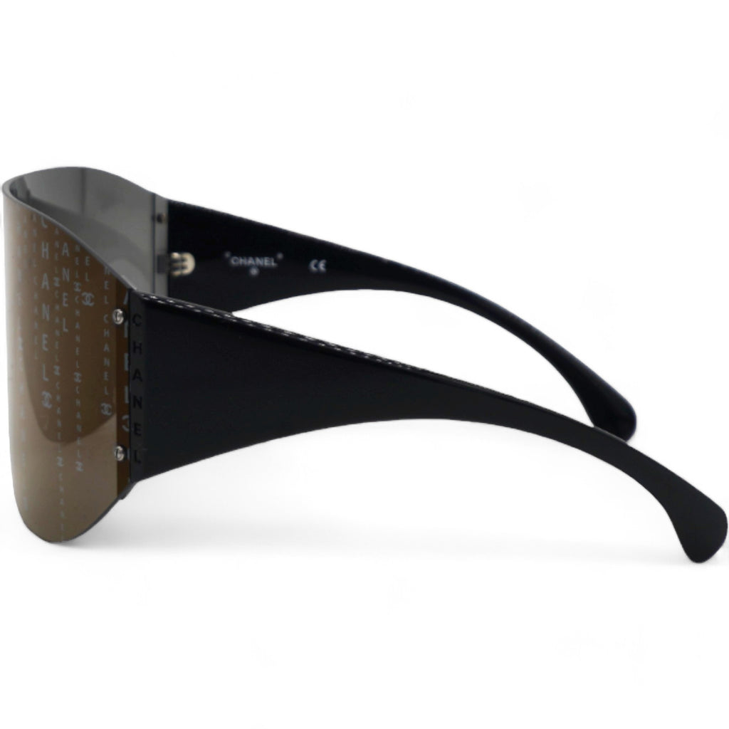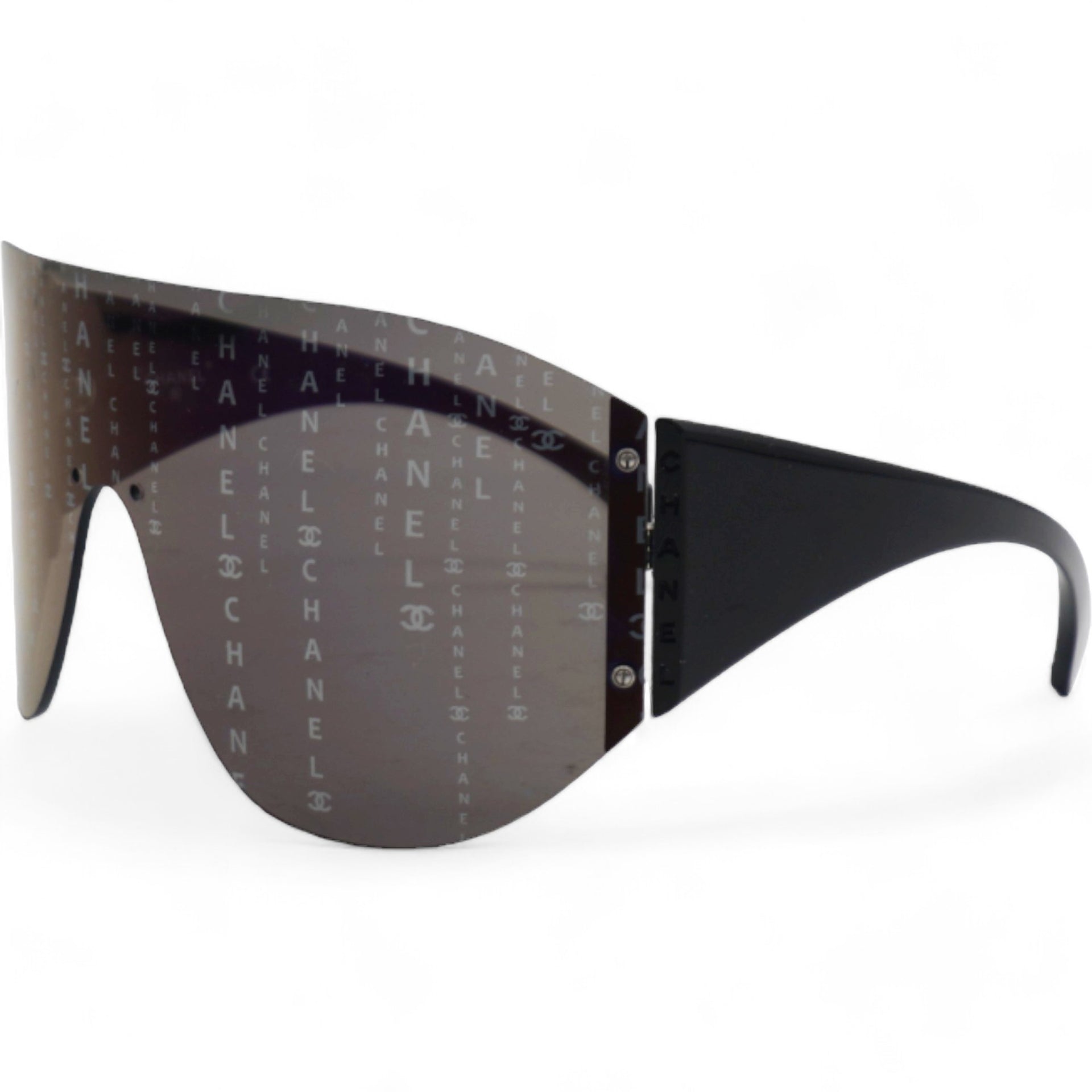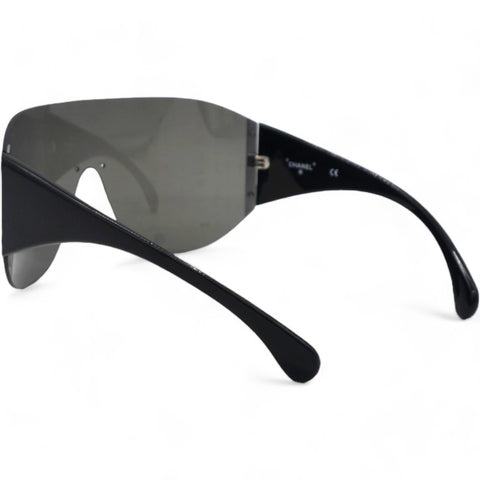 | These sunglasses have a dark grey tinted large single frame lens featuring the Chanel name logo and polished black arms. These are fabulous sunglasses, ideal for everyday use, with the one of a kind style from Chanel! |