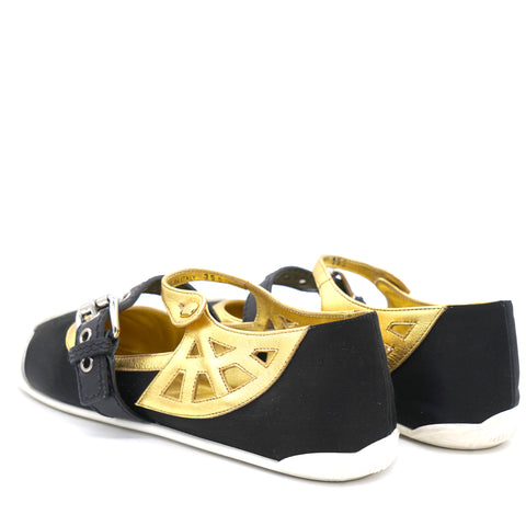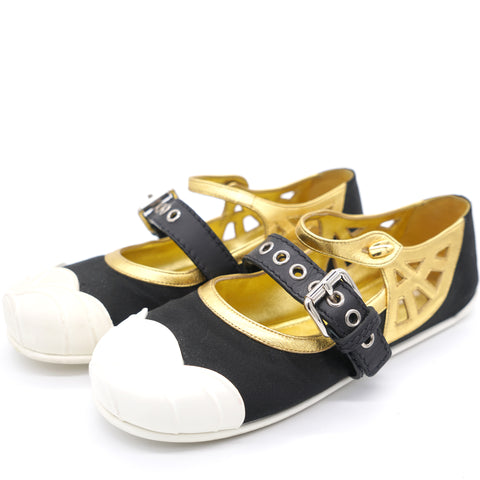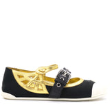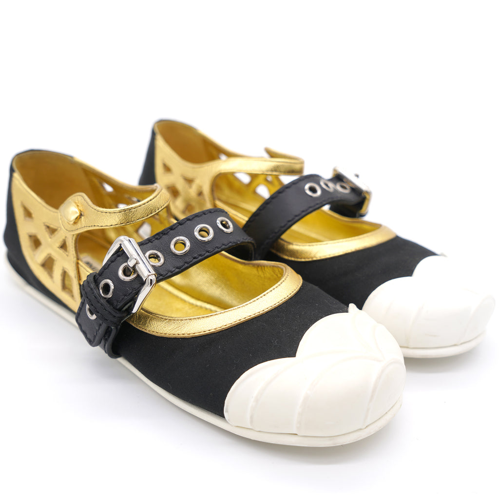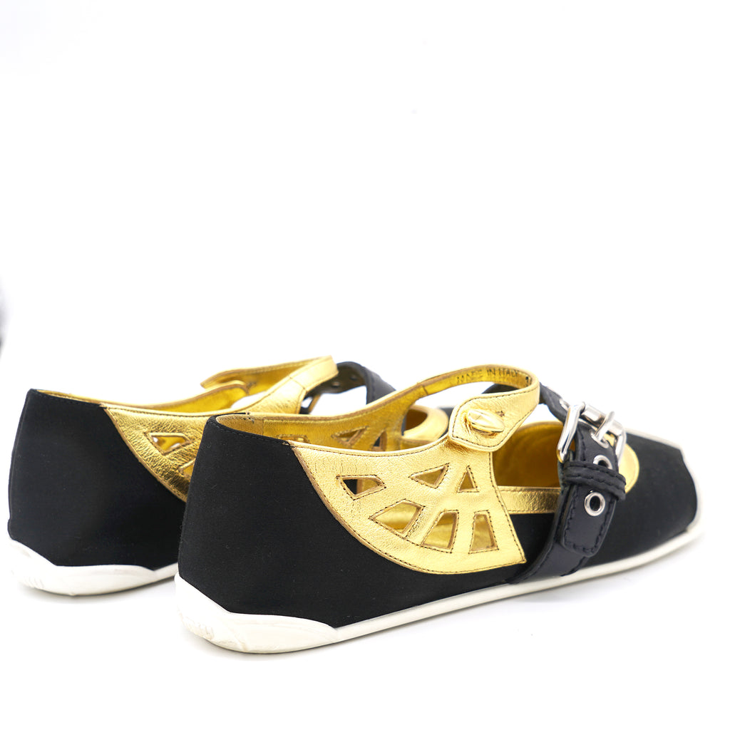 Miu Miu refreshed its coveted ballet flats for Spring Summer 2017 and updated this pale pink satin pair with metallic gold leather trims and an edgy black leather buckled front strap.